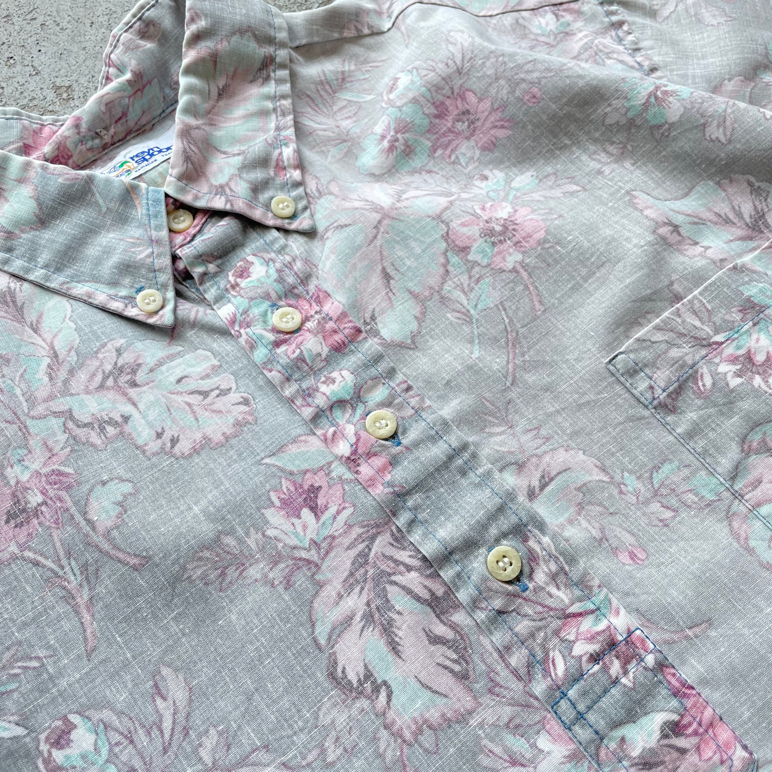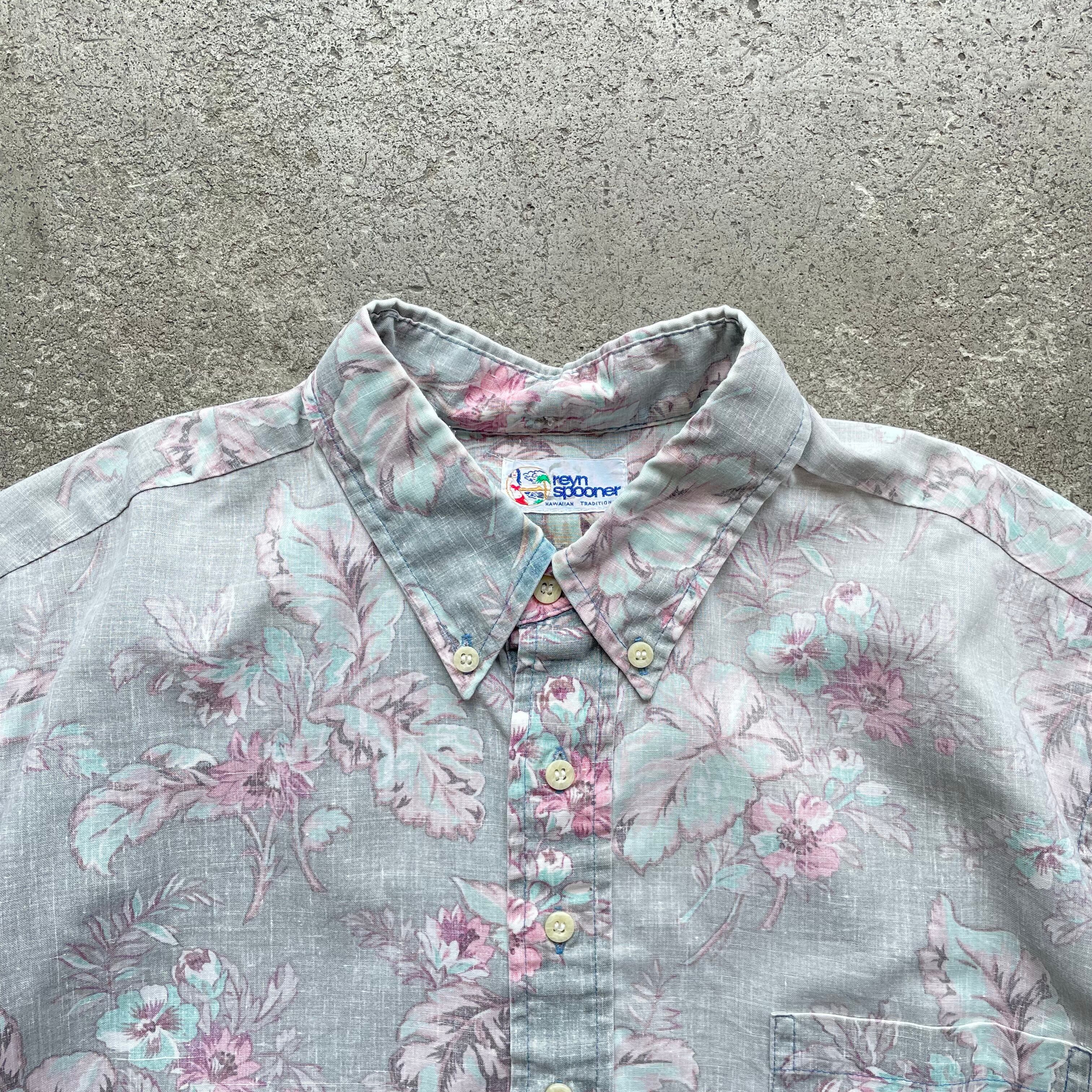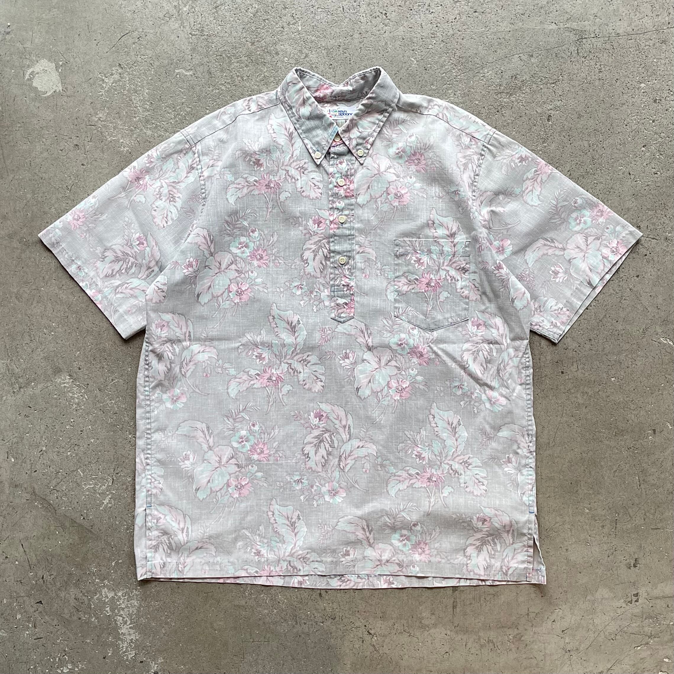 Reyn Spoonerの90年代アロハシャツ。くすみグレーにピンクの淡い花柄が上品でクラシックなプルオーバー×ハーフボタン仕様。ゆったりめのシルエットでラフにもきれいめにも使える1枚です。