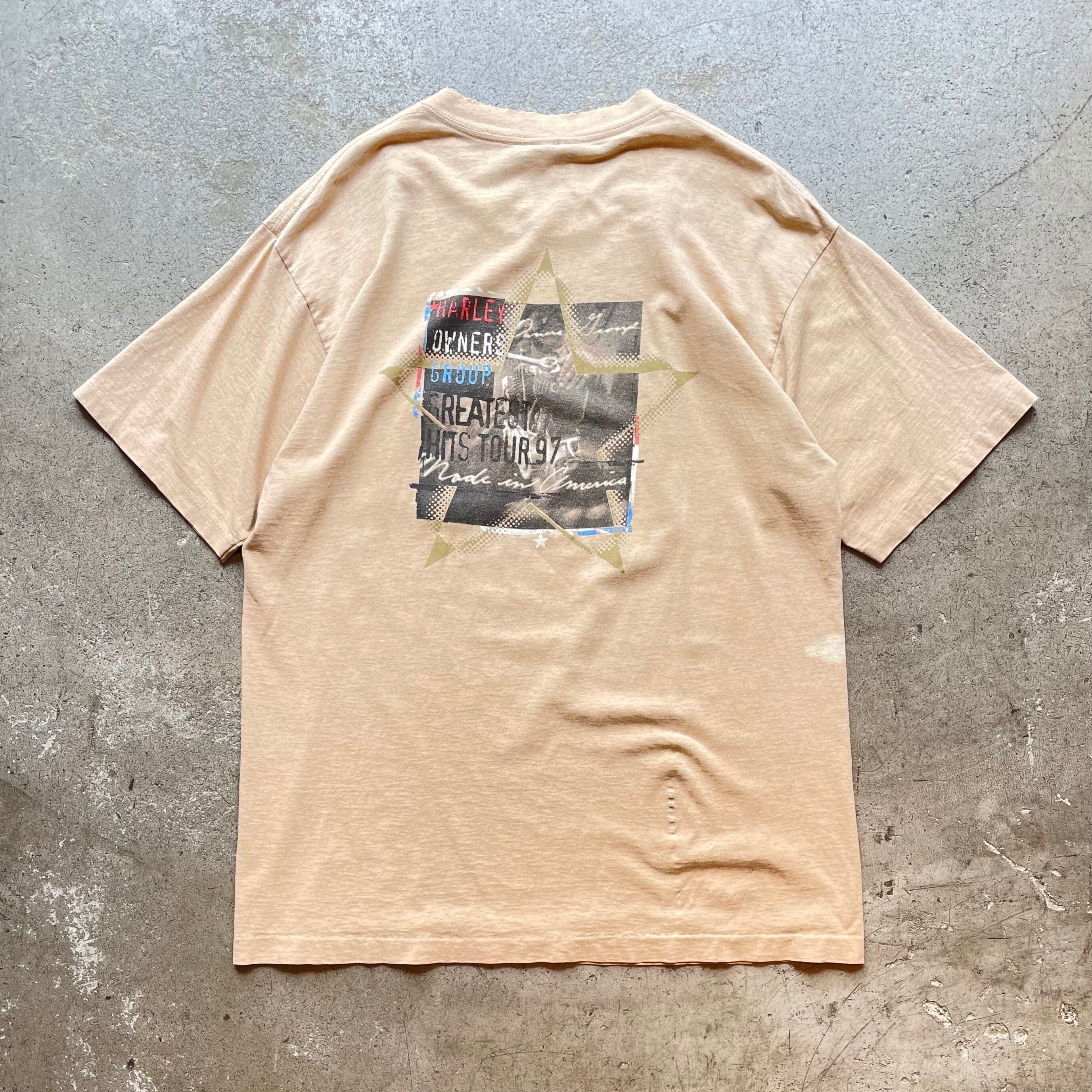 フロントはワンポイントの”HOG”ロゴ、バックには「HARLEY OWNERS GROUP GREATEST HITS TOUR 1997」グラフィックが配されたUSA製Tシャツ。やや褪色したベージュボディに星形のラインとヴィンテージライクなプリントが映える一枚。経年による色落ちとダメージが雰囲気系としての魅力を高めています。