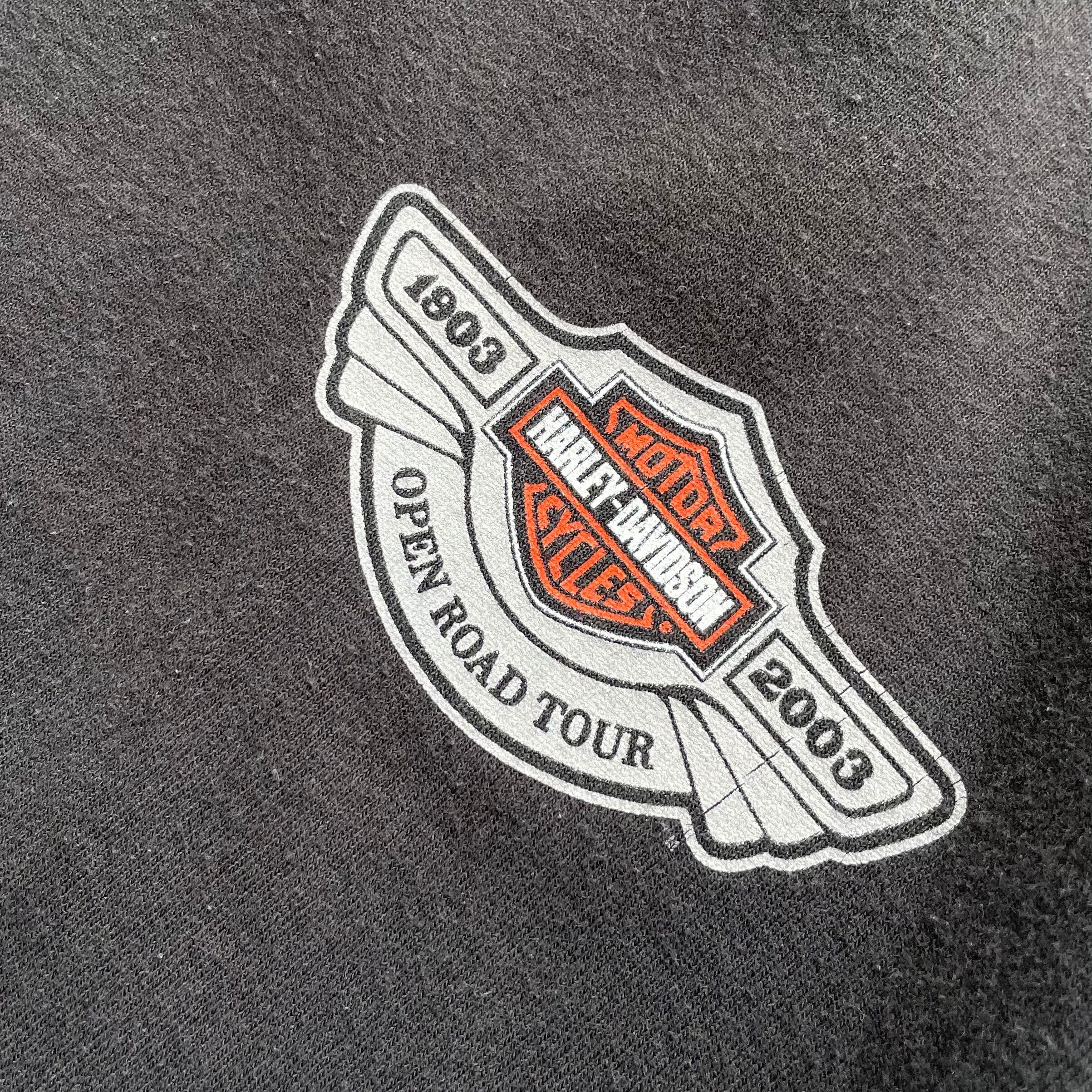 ハーレーダビッドソン創業100周年を記念した2003年「OPEN ROAD TOUR」シリーズの1枚。フロントにはワンポイント、背面にはバイク隊列のシルエットと名言「We’re all born to be wild. At least for a few days.」がプリントされています。現行品では再現されない当時の雰囲気が魅力です。