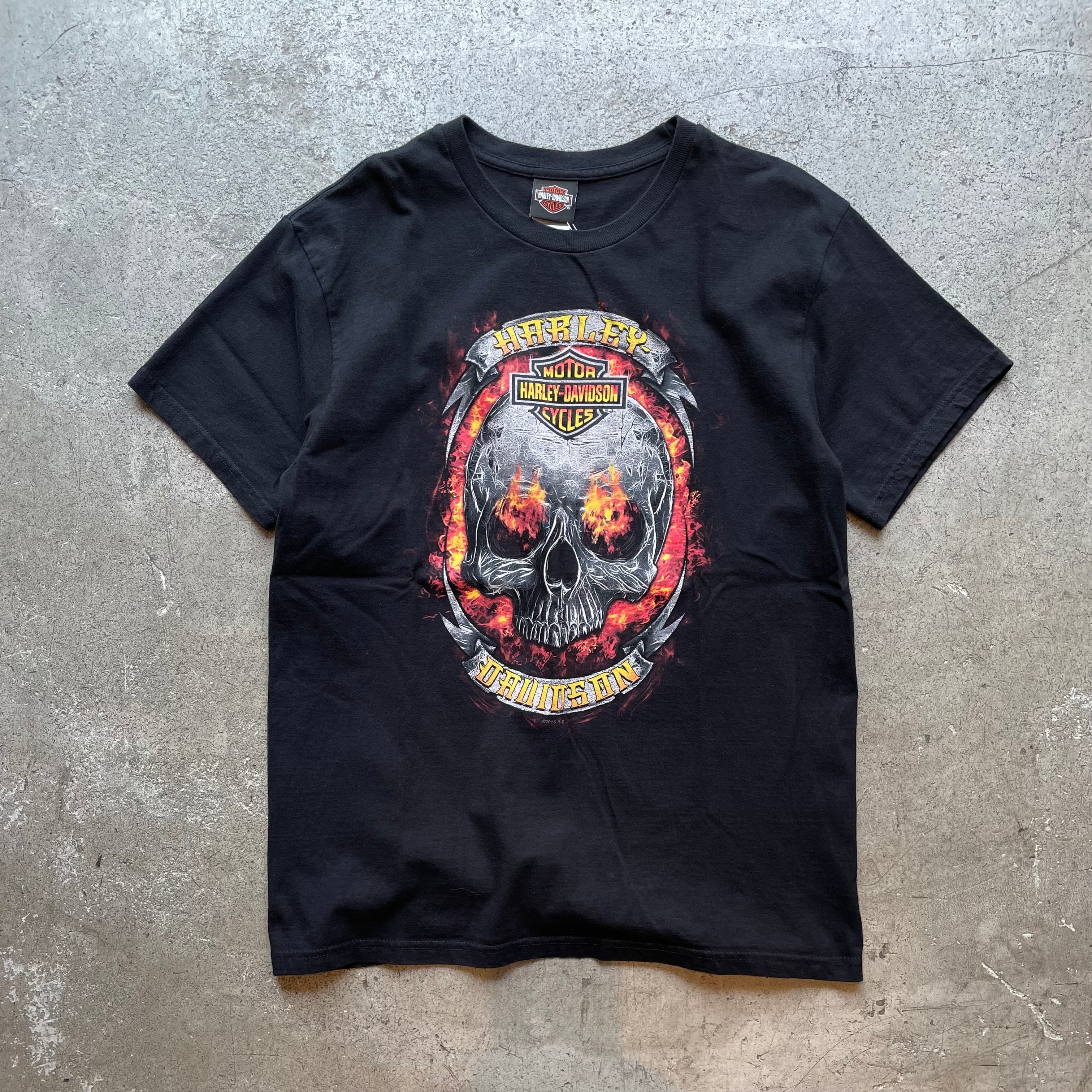 HARLEYらしいファイヤースカルの迫力グラフィック。背面にはノースカロライナ州シャーロットのショップロゴ入り。肉厚でしっかりしたUSA製ボディ。両面プリント仕様で存在感抜群の一着です。