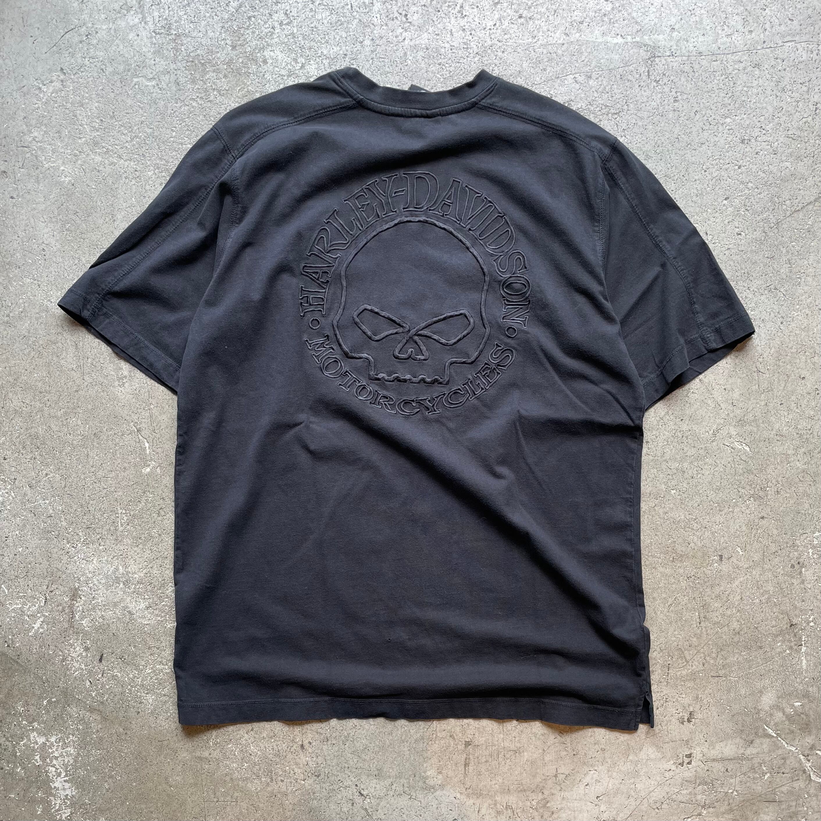 刺繍で仕上げたスカルロゴが印象的な一枚。フロント・バックともにブラック刺繍で統一され重厚感のあるデザイン。定番ながら他と差がつく渋いハーレーTです。