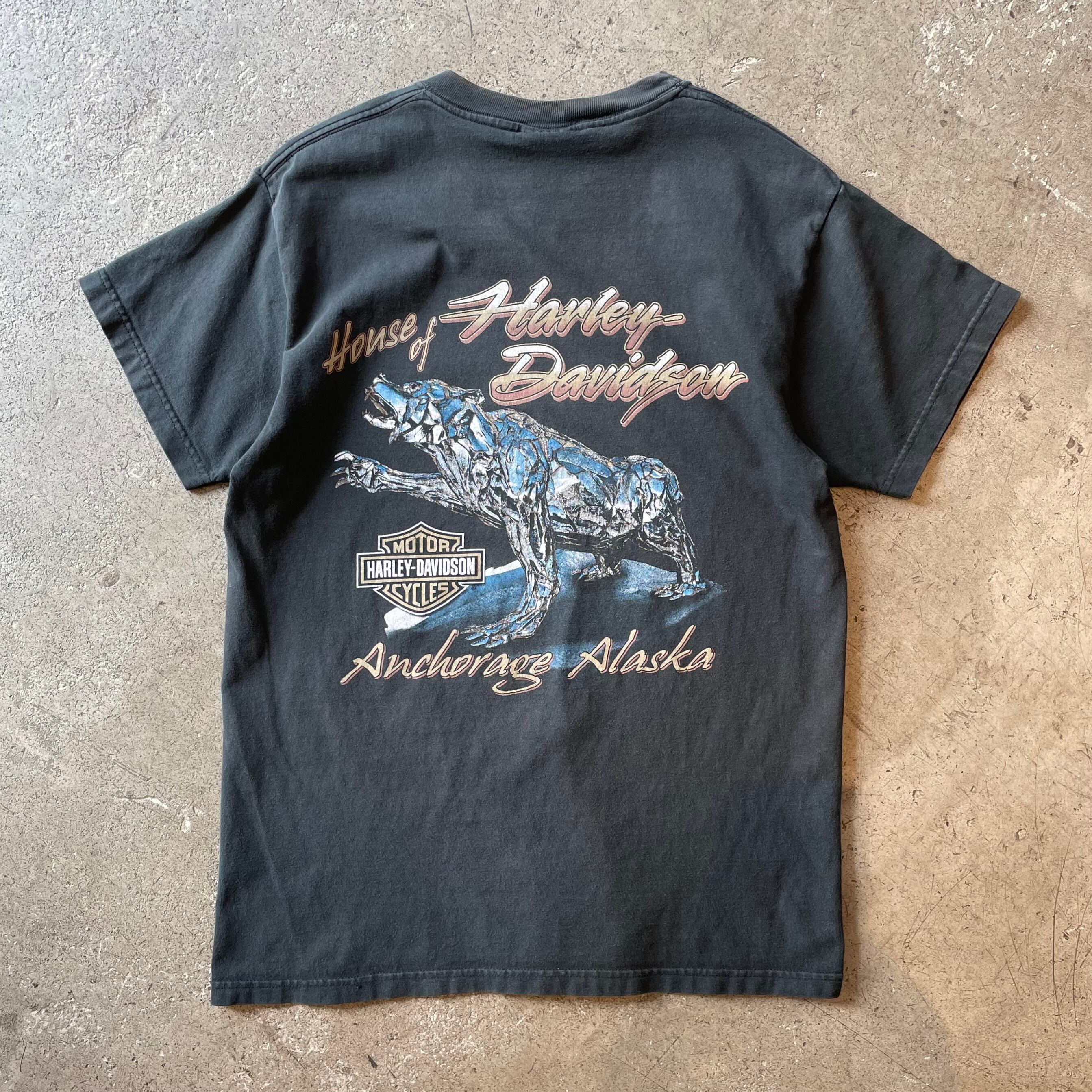 2003年コピーライト入りの一枚。フロントはシンプルながら、バックにインパクト抜群の「House of Harley-Davidson / Anchorage Alaska」ロゴとシルバーベアのグラフィックが目を引きます。USA製らしいしっかりとしたボディに加え、R.K. Stratman Inc.製のタグ付きでコレクタブルな1着です。
