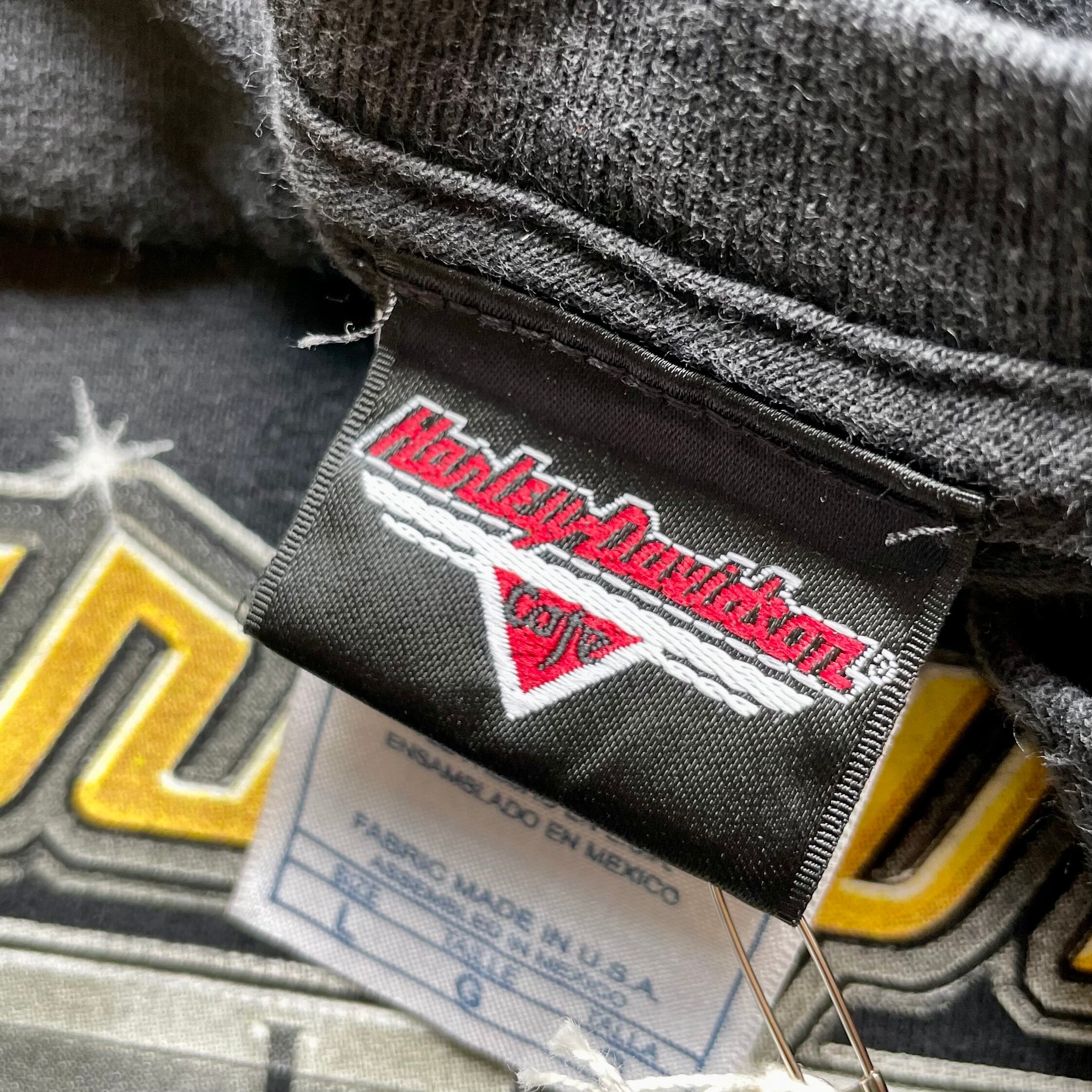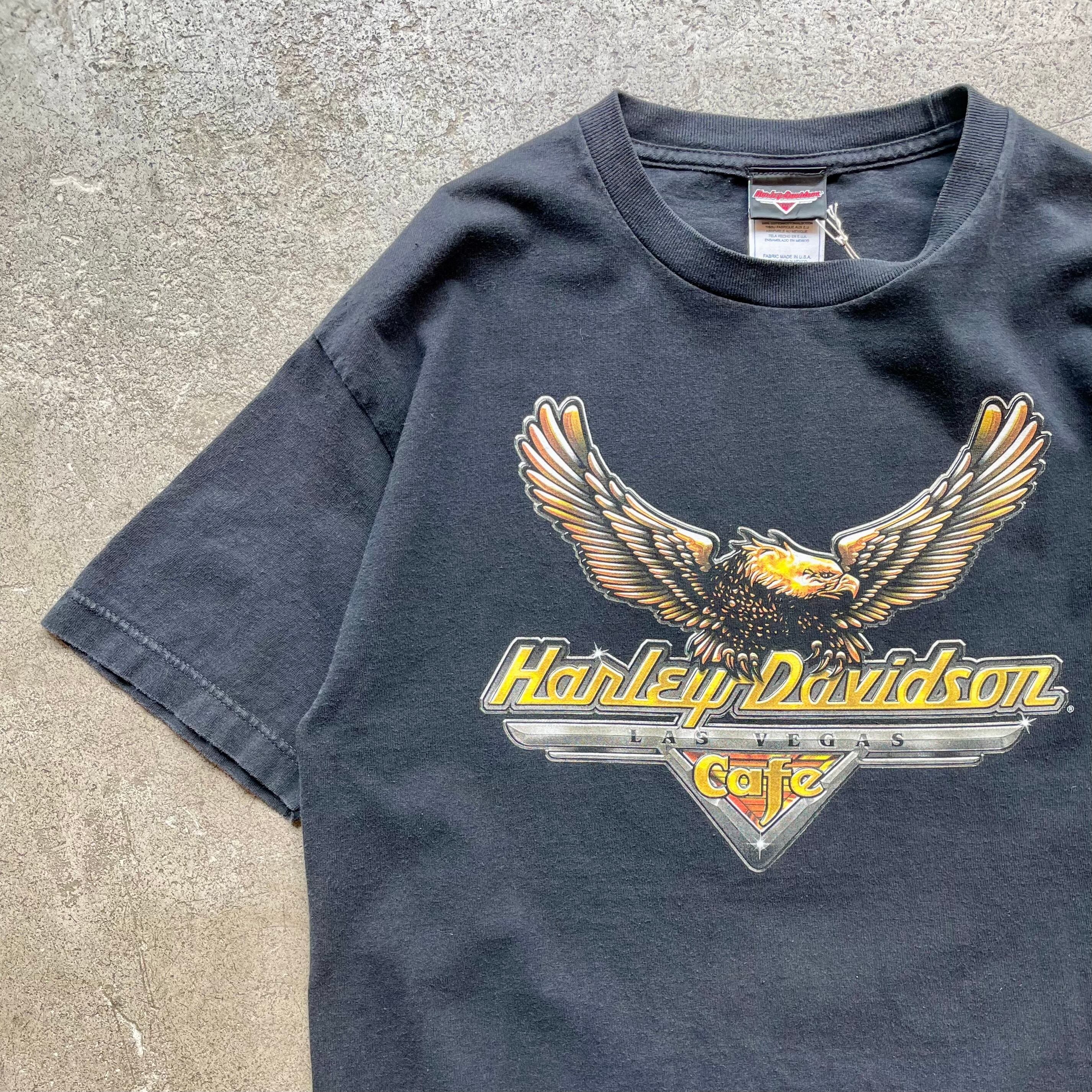 1990年代製、Harley-Davidsonの“Cafe Las Vegas” 両面プリントTシャツ。アメリカンイーグルとヴィンテージバイクの迫力あるグラフィックが特徴的。カフェ店舗ロゴ仕様でコレクターからの人気も高い希少モデルです。
