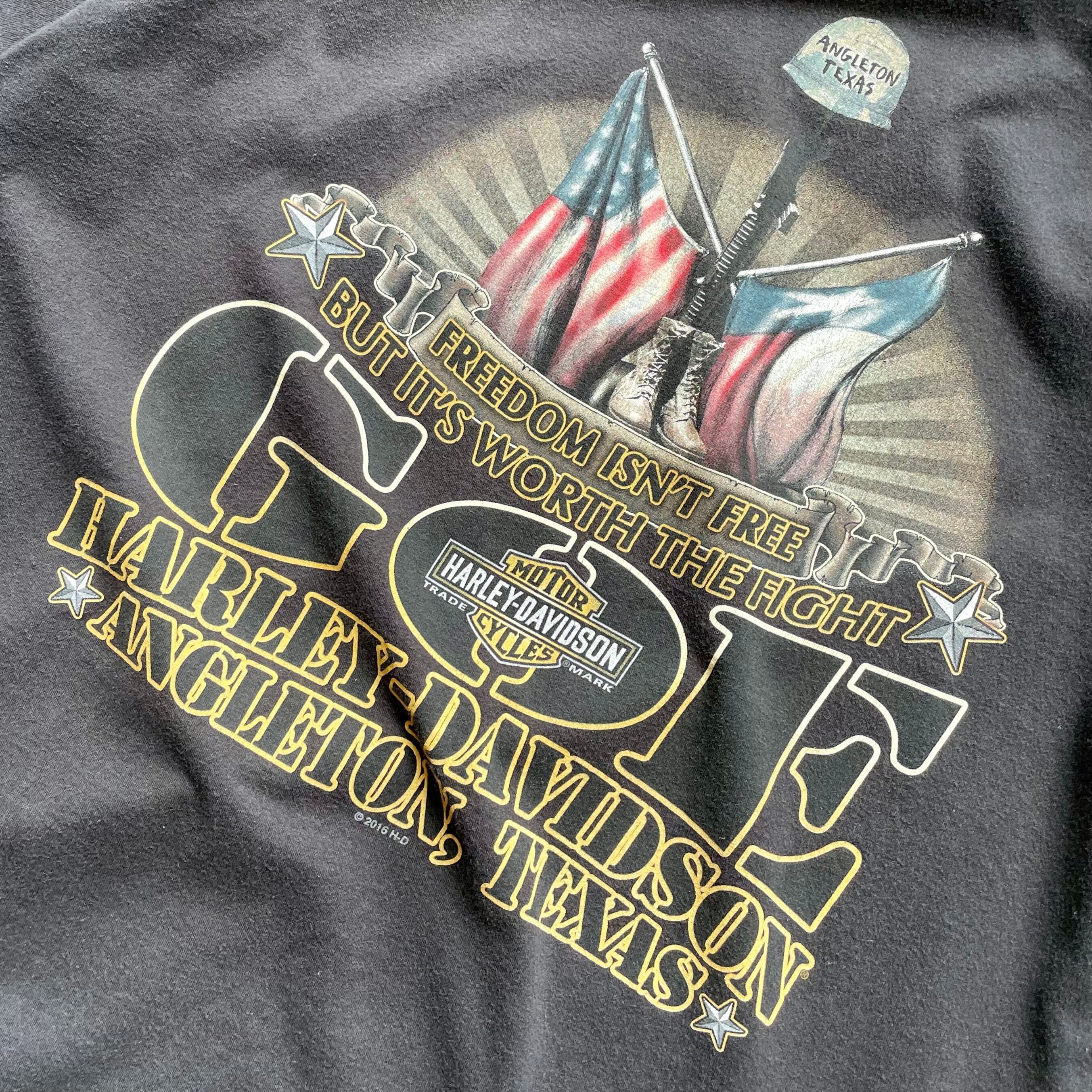2016年コピーライト入りの“BROTHERHOOD”デザイン。フロントにはバイカー3人のシルエット、バックはテキサス州ANGLETON店舗の両面プリント仕様。迫力あるグラフィックが魅力の一枚です。