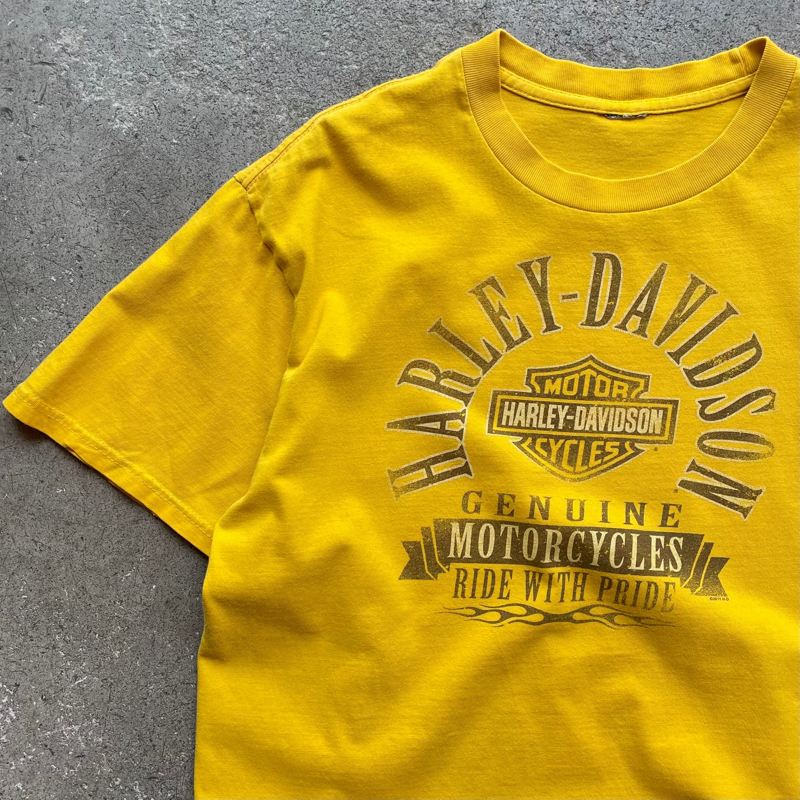 発色の良いイエローが目を引くバックプリント付きのハーレーダビッドソンTシャツ。アメリカ・コロラド州PUEBLOの店舗が描かれたデザインで旅情感も◎。「RIDE WITH PRIDE」の文字が映える1枚です。