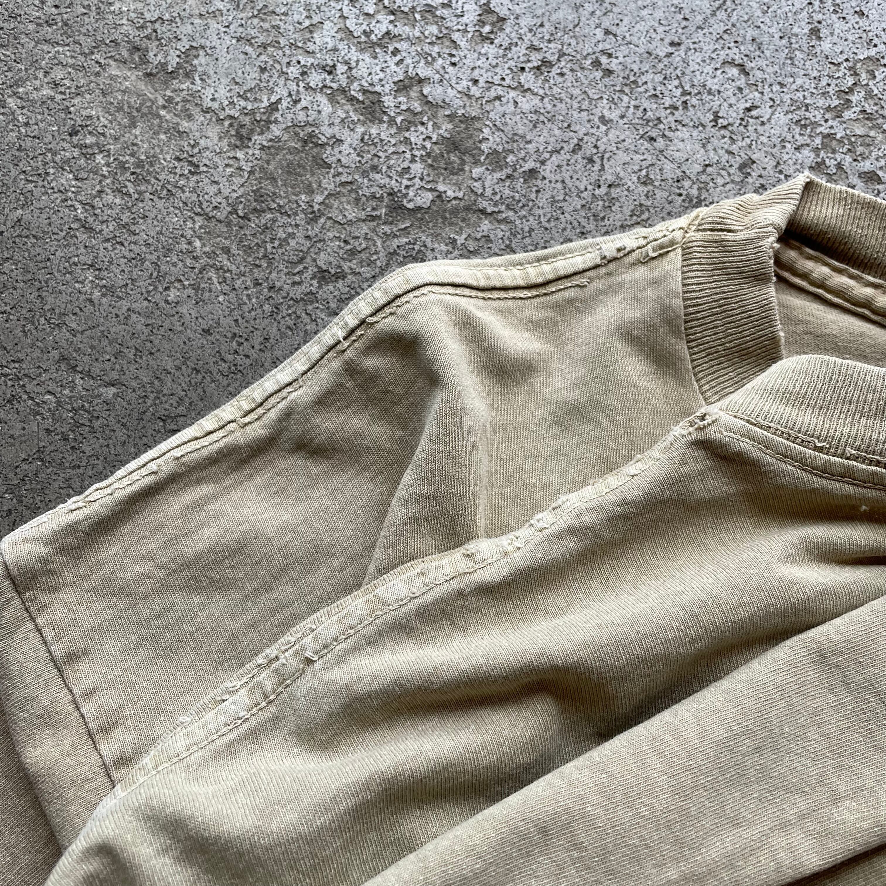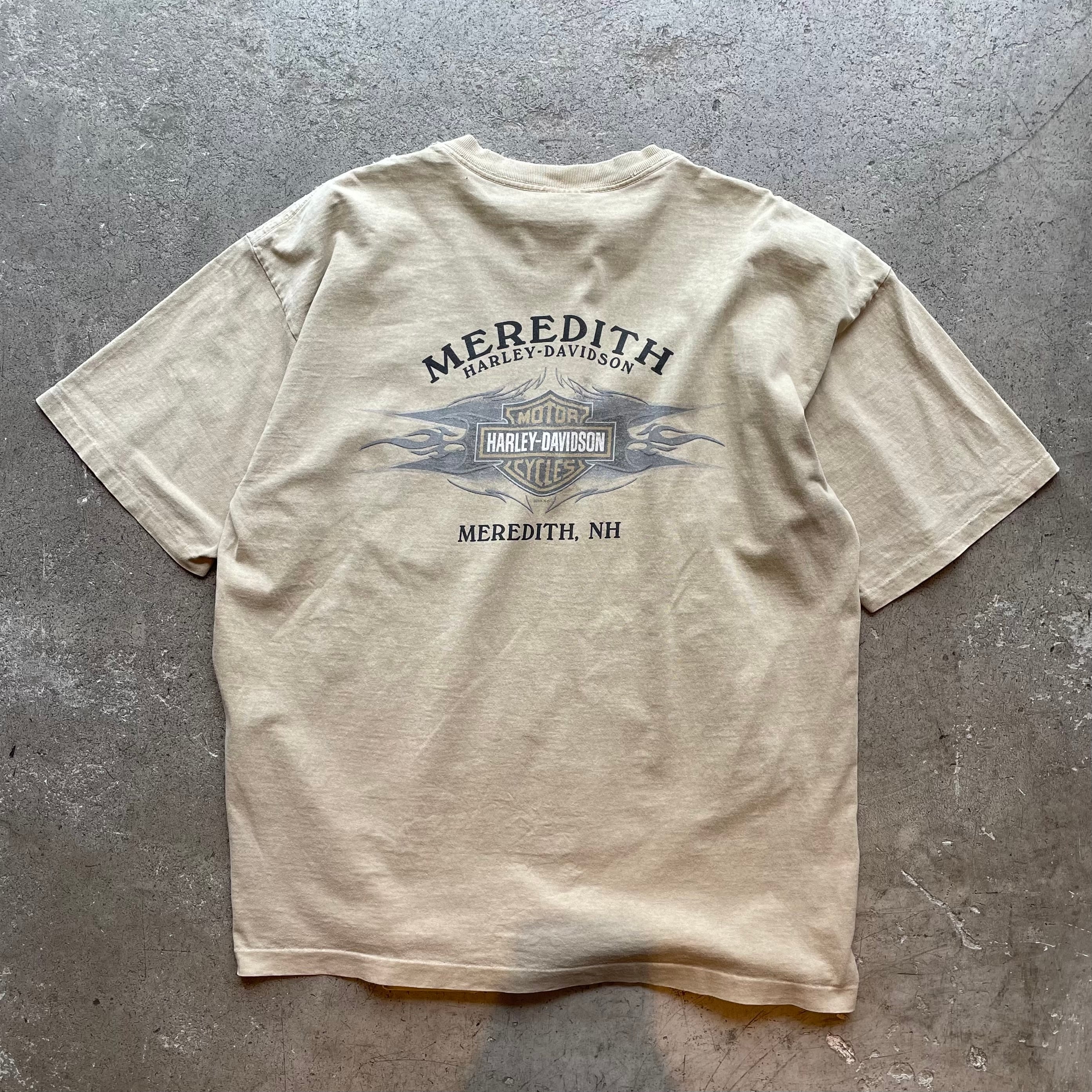 ニューハンプシャー州Meredith店のバックプリントが映える一枚。くすんだベージュカラーがヴィンテージ感を引き立てタウンユースでもバイクシーンでも活躍する万能Tシャツです。袖・裾ともにシングルステッチ使用。