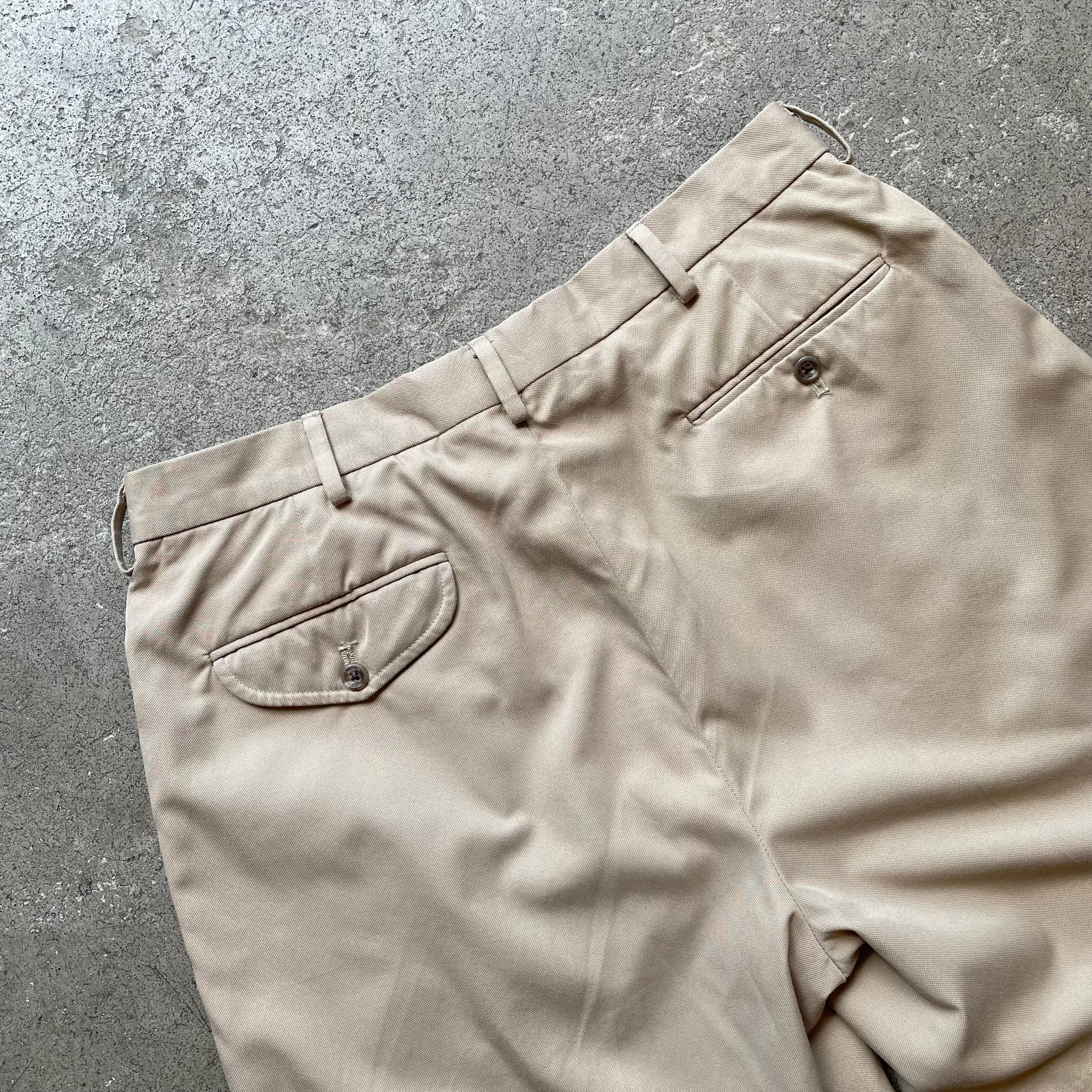 90年代製のポロゴルフ、タック入りのスラックスショーツ。スラックスらしい綺麗めな雰囲気で大人のリゾートコーデに映える一本です。ポリエステル素材でシワになりにくく、ドレスとカジュアルのバランス感も◎