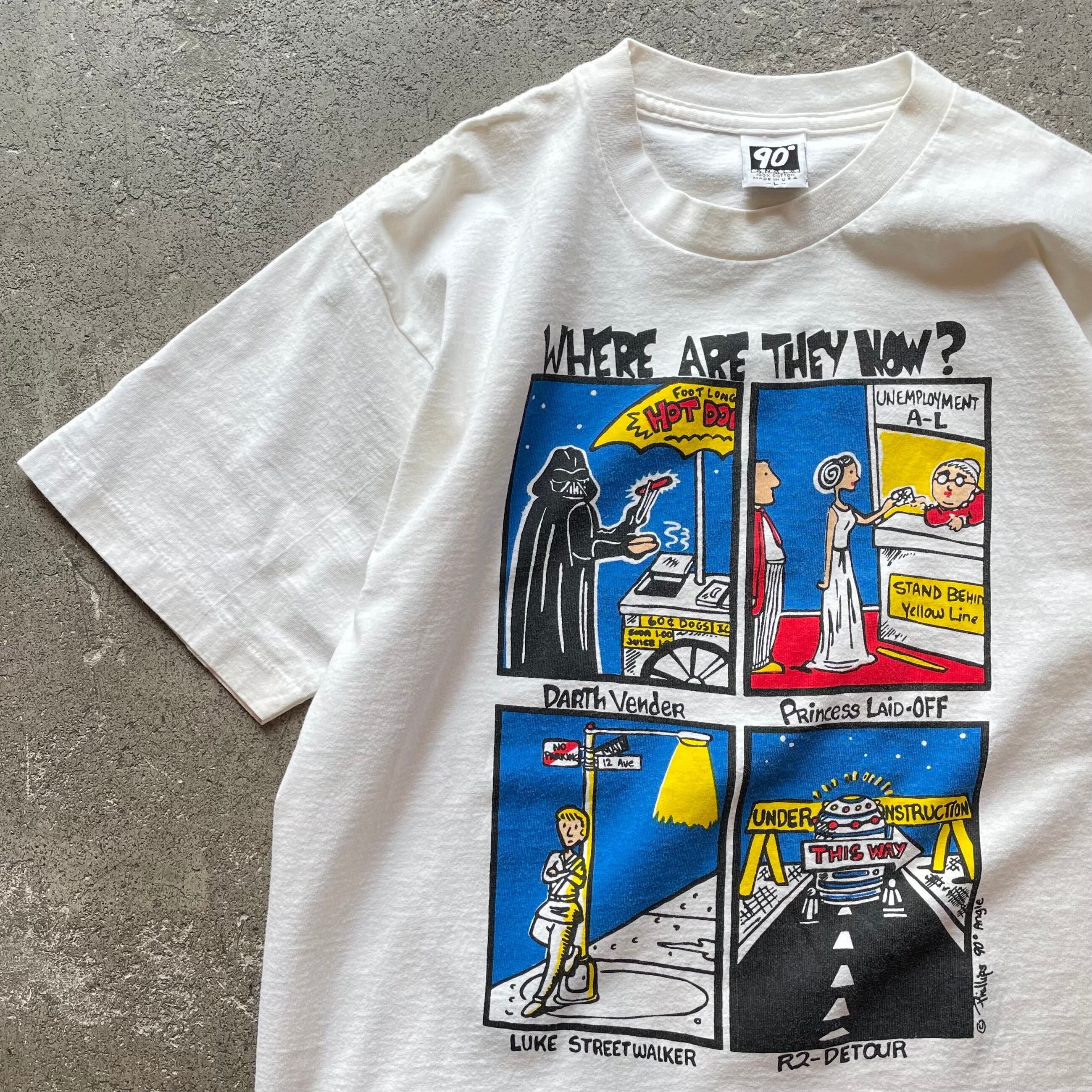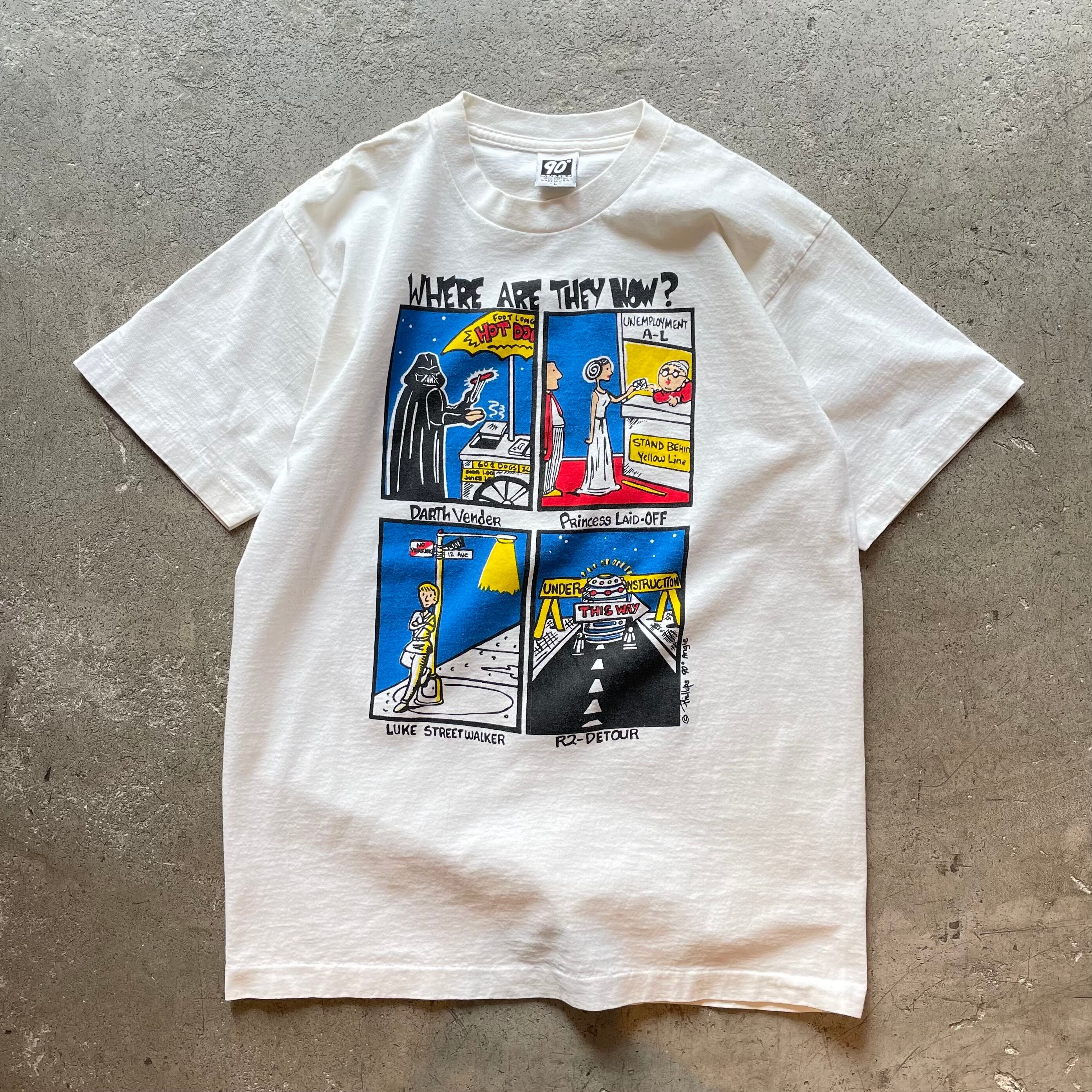 スターウォーズのキャラクターを風刺的に描いた90sらしいパロディデザイン。「Darth Vender」「Princess Laid-Off」「Luke Streetwalker」「R2-Detour」などユーモア満載のグラフィック。インパクトのあるプリントTをお探しの方におすすめの一枚。