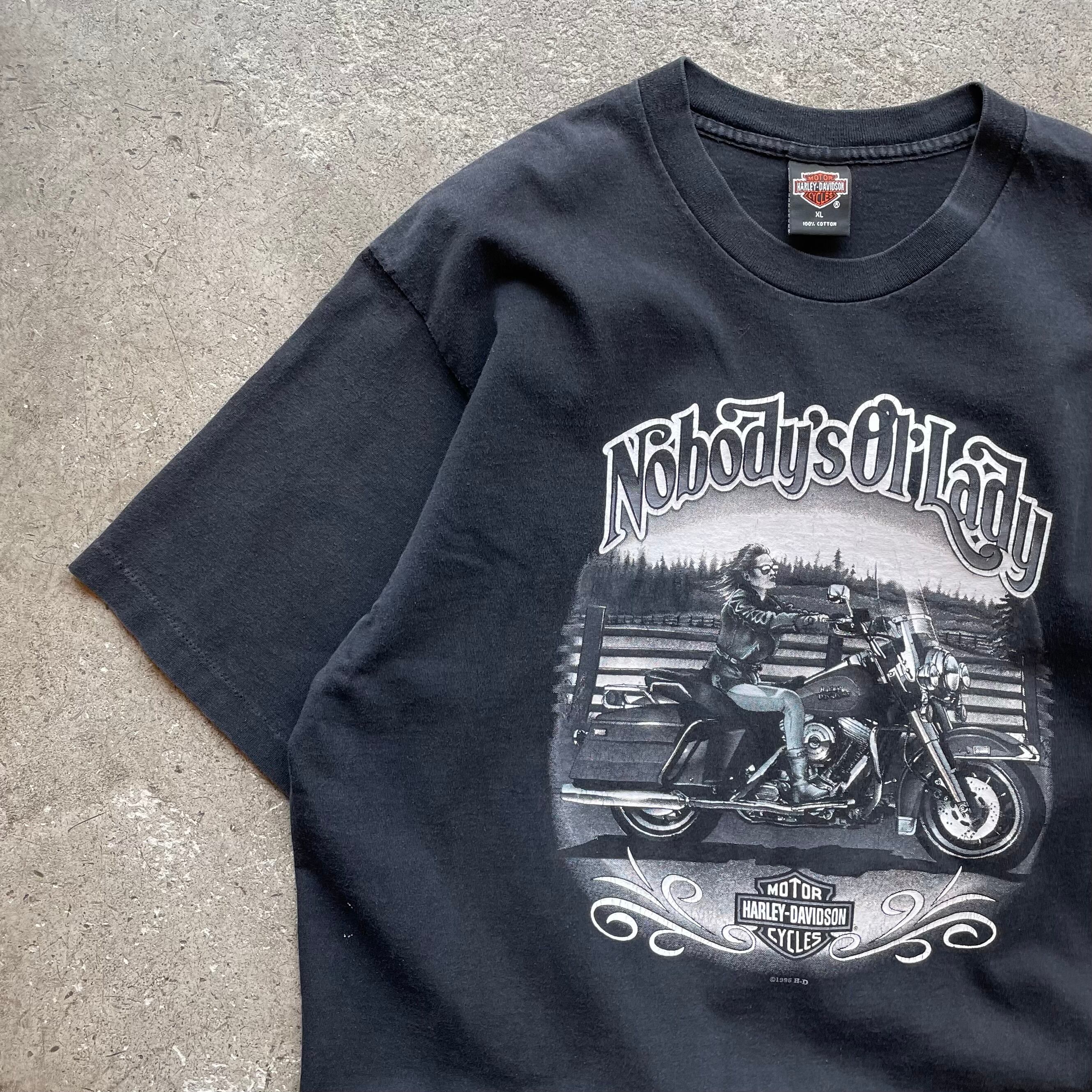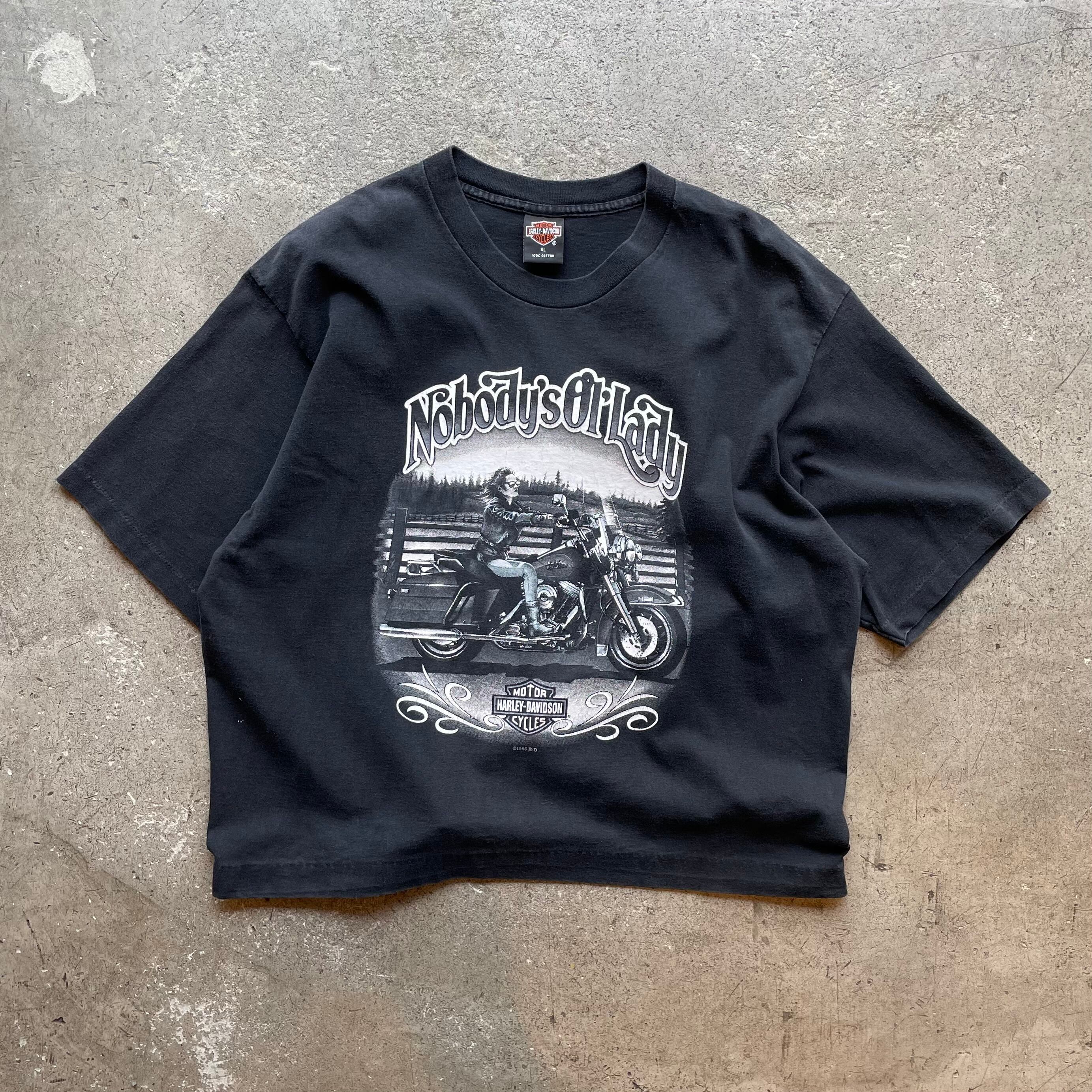 1996年コピーライト入りのハーレーTシャツ。フロントに“Nobody’s Ol’ Lady”と女性ライダーのグラフィック、バックにMONTY’S店舗ロゴ(マサチューセッツ州WEST BRIDGEWATER)。HOLOUBEK製のUSA製ボディを使用。裾はリメイクによりカットオフされています。