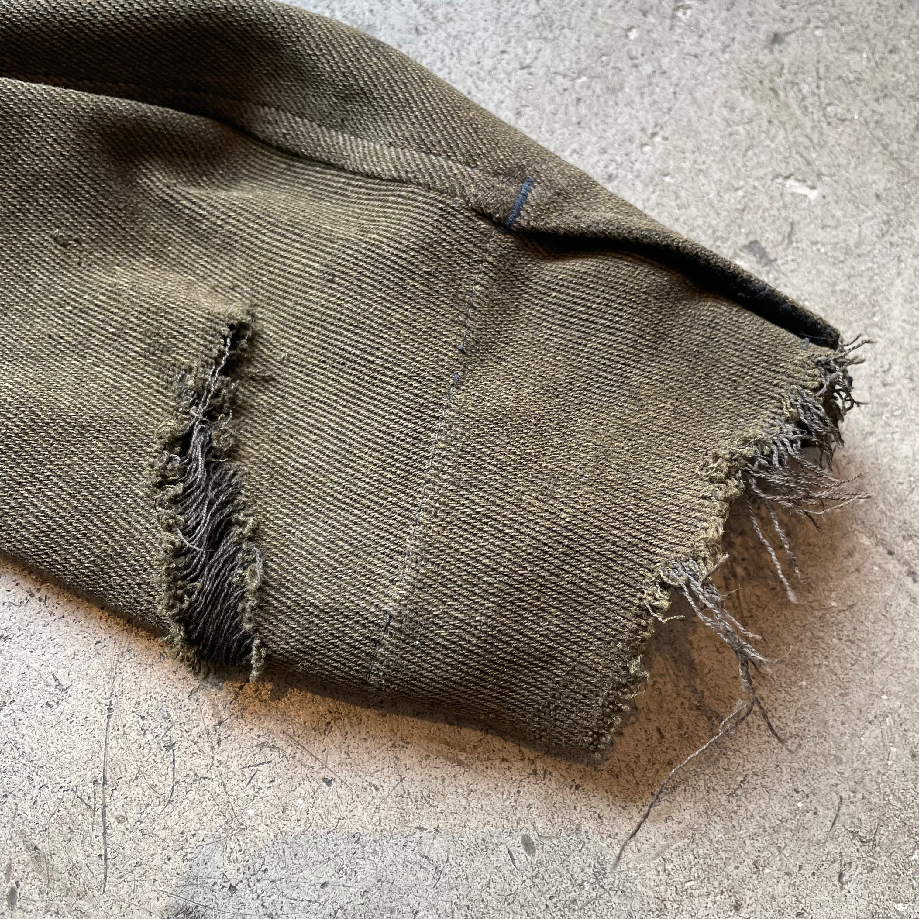 程よくエイジングされたカーキブラウンのウール地は粗く武骨な質感でヴィンテージファンにはたまらない雰囲気。袖口にはダメージがありますがスタイリング次第で“味”として楽しんでいただけます。
