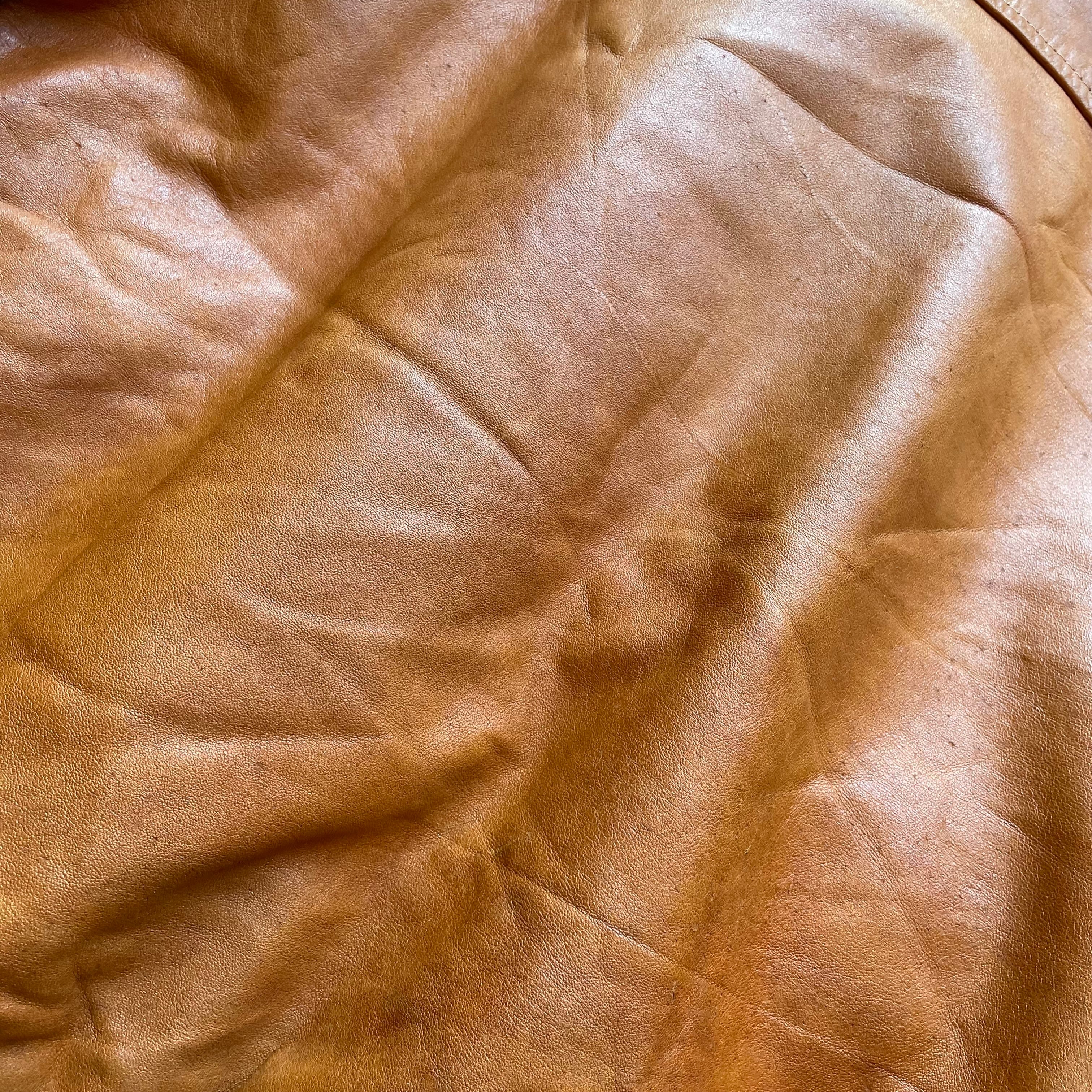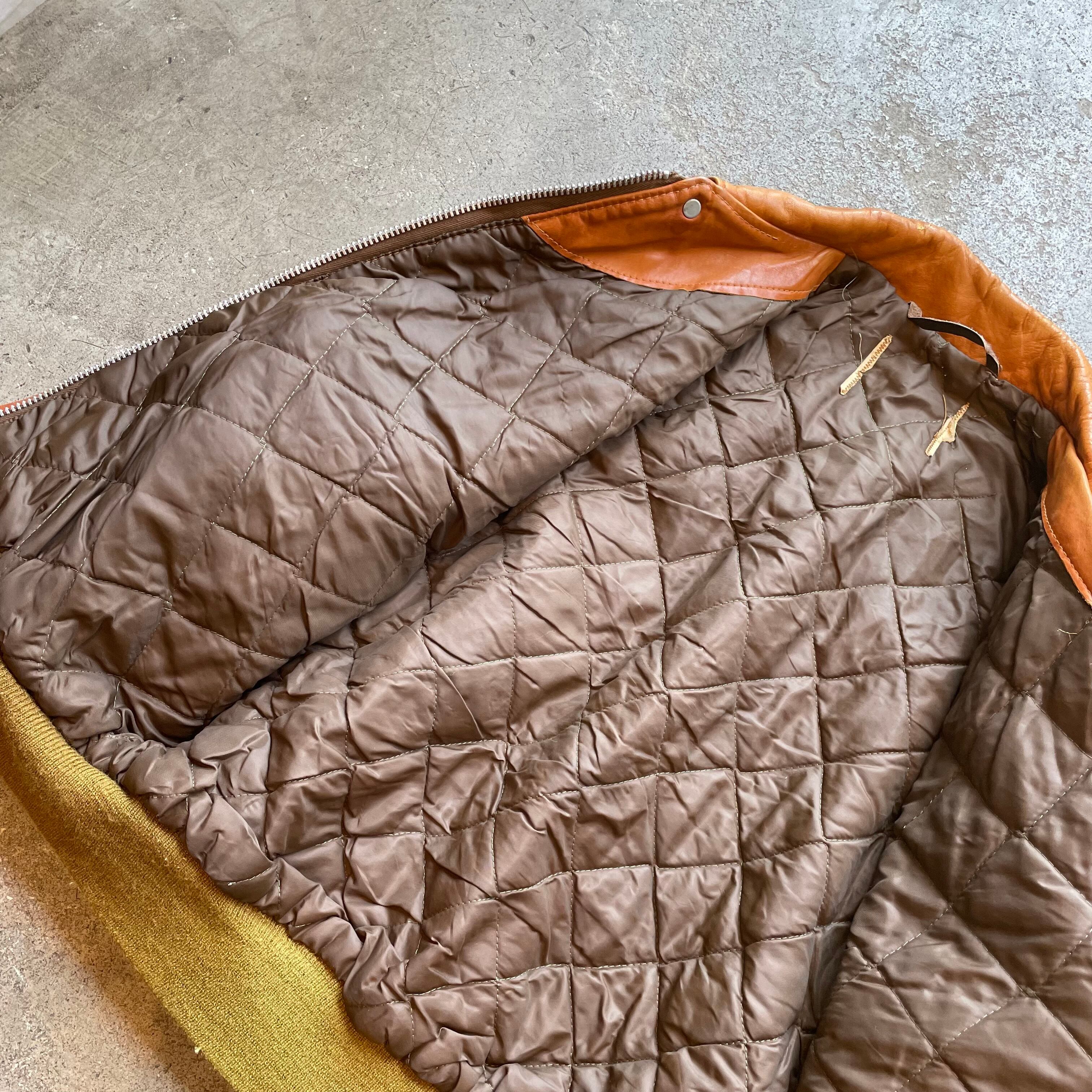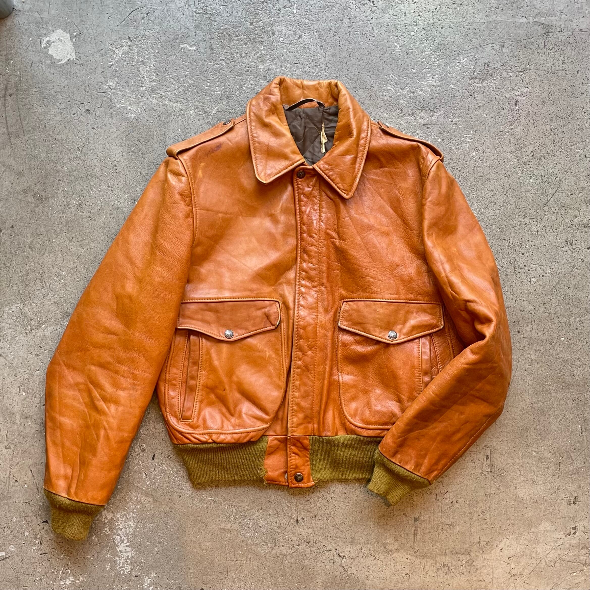 TALONジッパー、SCHOTT刻印ボタン、ダイヤ型キルティングライナーなど70年代中頃のディテールが詰まったヴィンテージフライトジャケット。武骨でありながら上品さも感じさせるブラウンレザーが時間の経過と共に唯一無二の表情に。リアルな経年変化が楽しめるレザーファン垂涎の一着です。