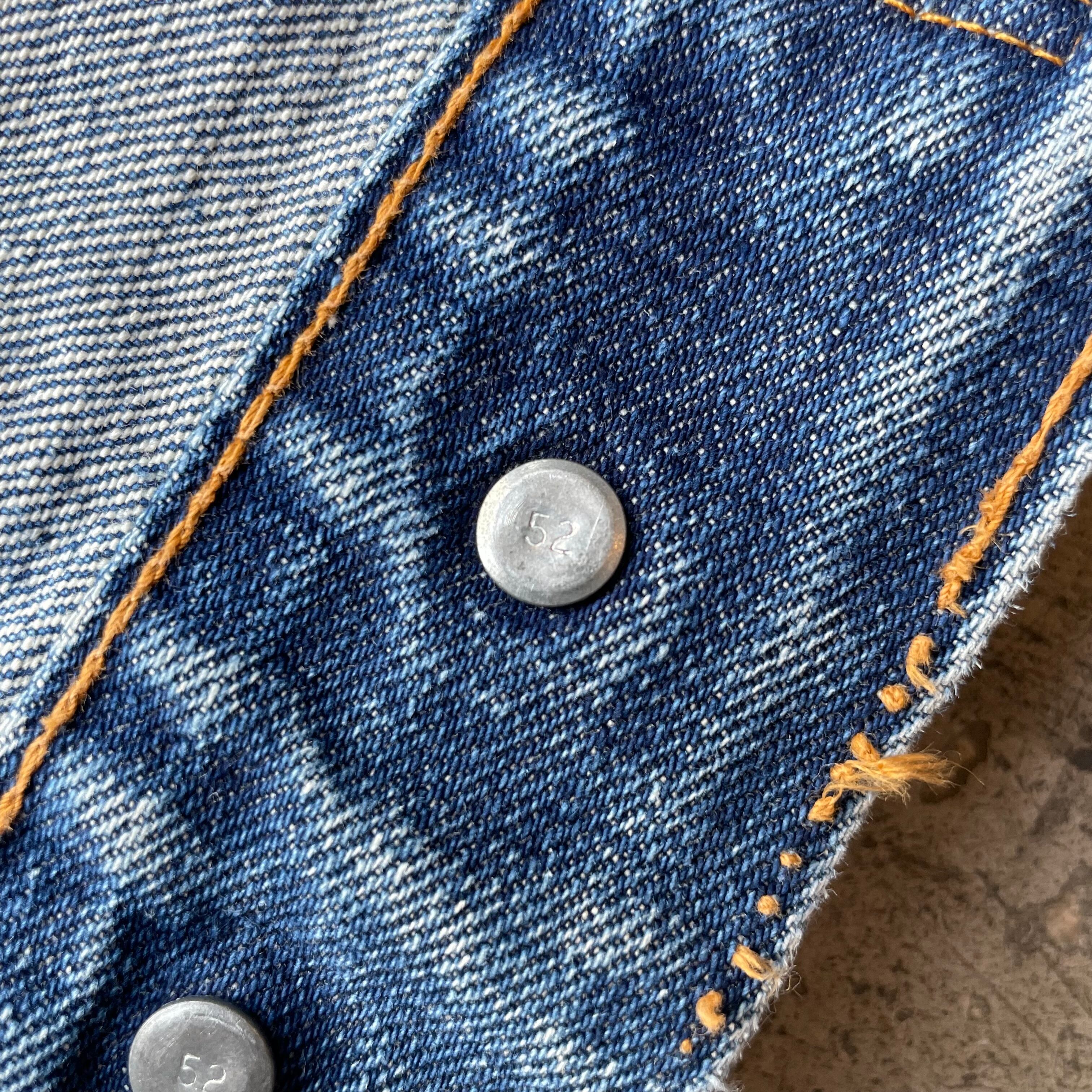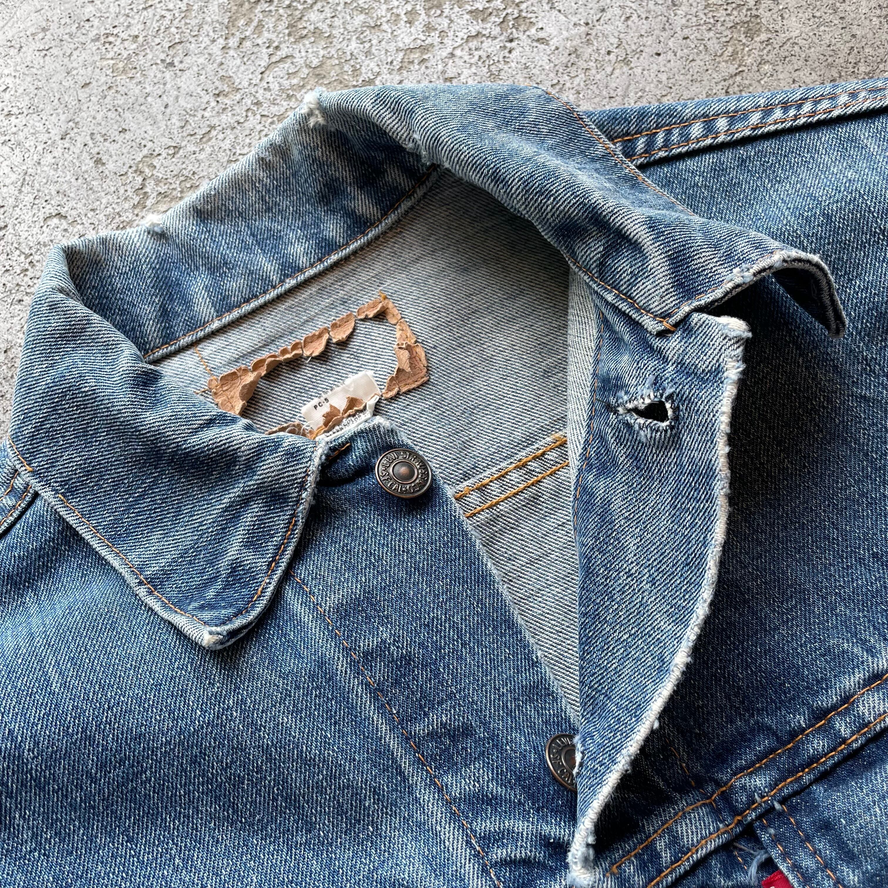 全体的に使用感あり。襟・袖に若干の擦れあり。紙パッチは欠損していますが、縫い跡、赤タブ、ボタン刻印などから年代判別可能。