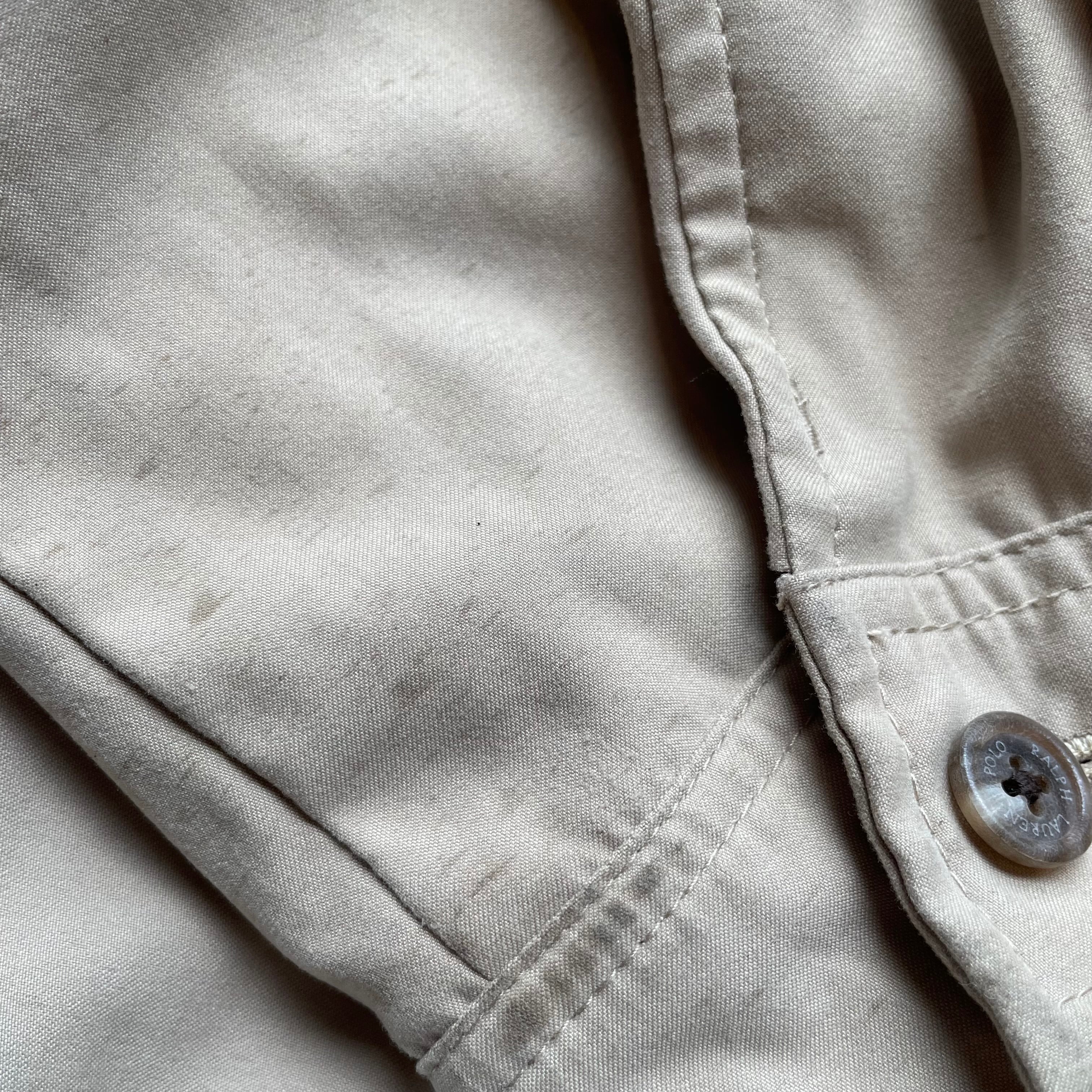 軽量で扱いやすいポリエステルシェルにコットンの胴裏を合わせたスイングトップ。シンプルなベージュカラーにワンポイントロゴが映えるデザイン。幅広いコーディネートに対応可能な万能アイテムです。
