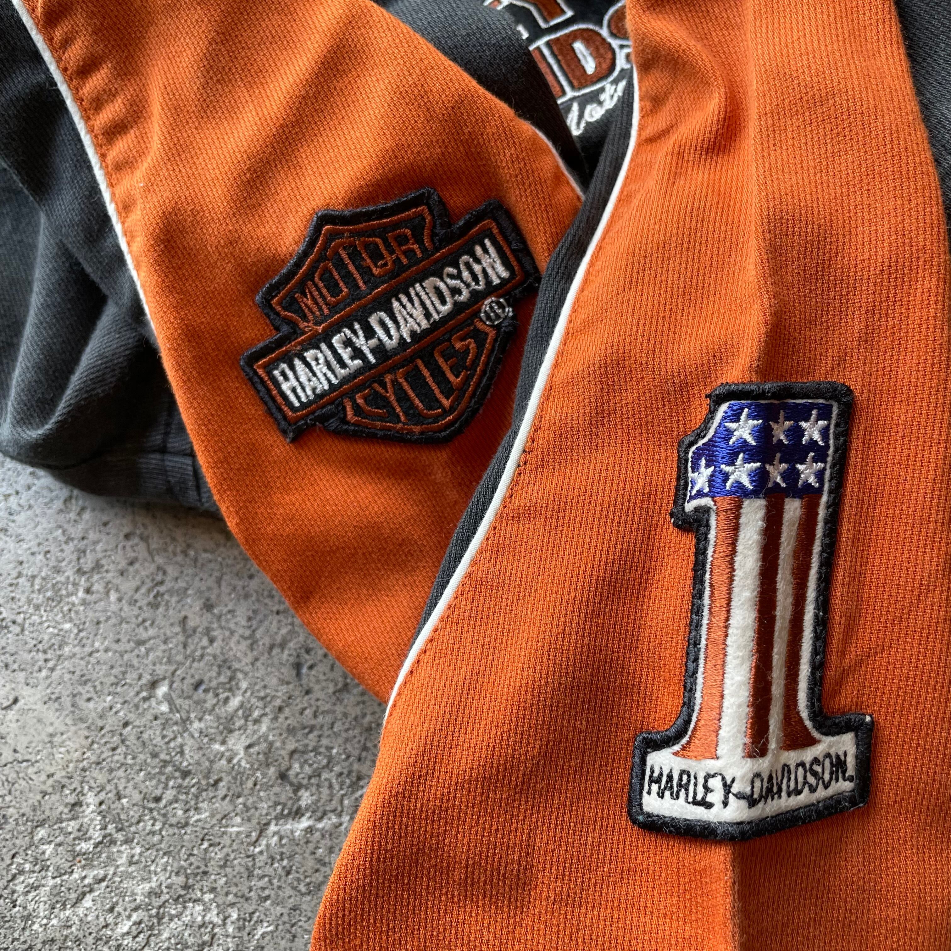 フロント・バックともに迫力あるロゴ刺繍を施したHarley-Davidsonの半袖ワークシャツ。ブラックボディにオレンジの切り替えが映え、袖には「Since 1903」の刺繍入り。バイクシーンはもちろんストリートスタイルのアクセントにもおすすめの一着です。