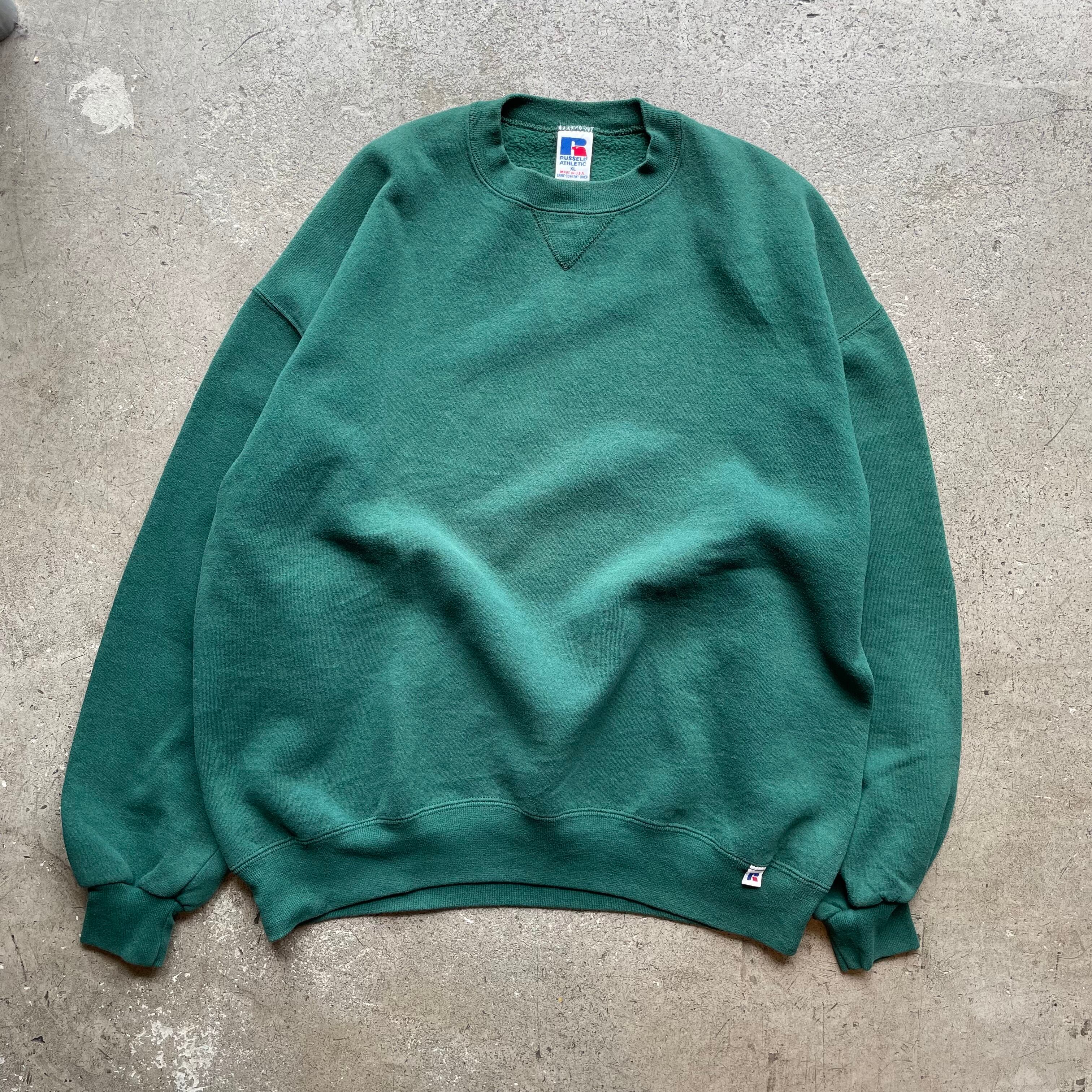 アメリカ製Russell Athleticの無地スウェット。ヴィンテージらしい肉厚な生地感と落ち着いたグリーンカラーが特徴。シンプルなデザインで着回しやすく古着らしい風合いを楽しめます。