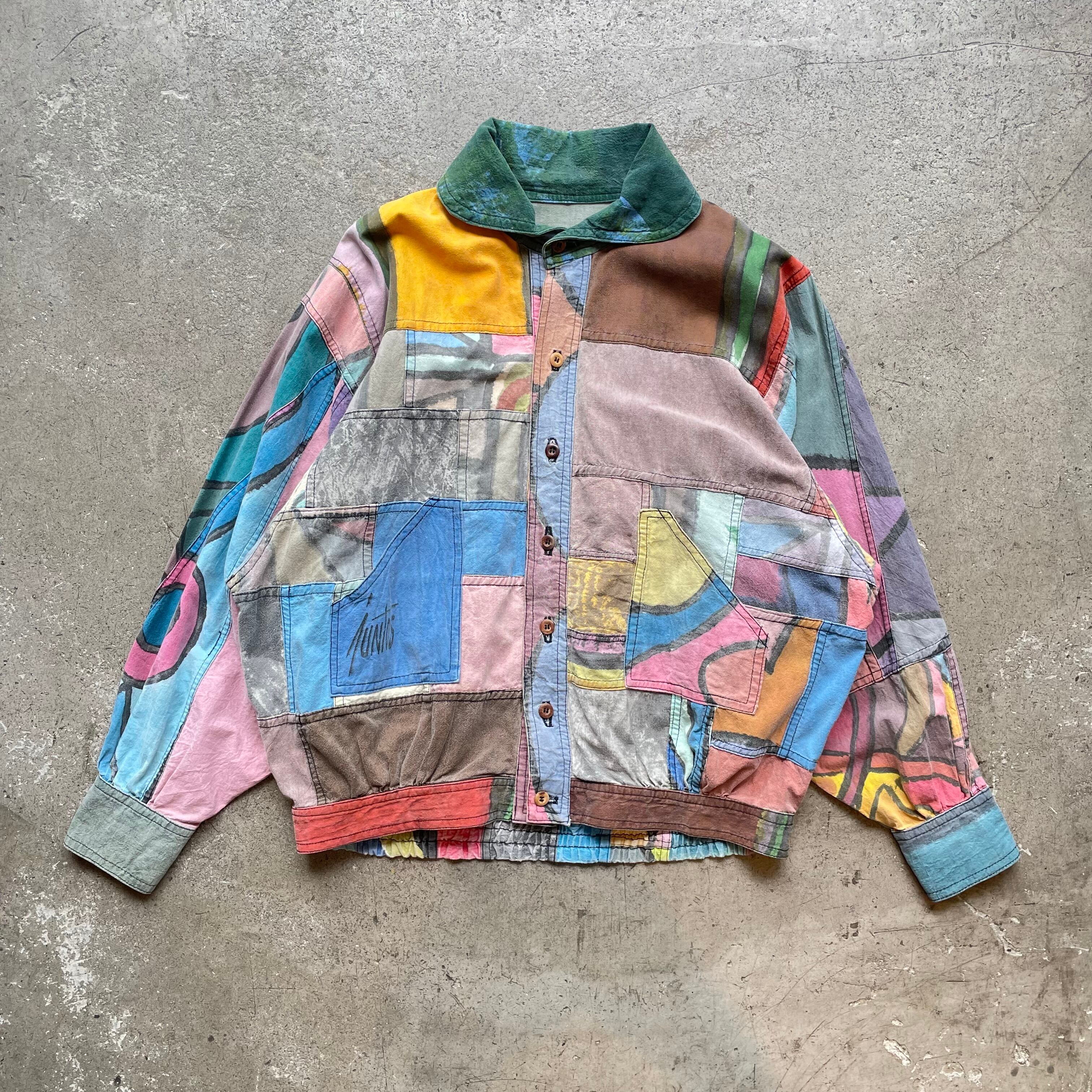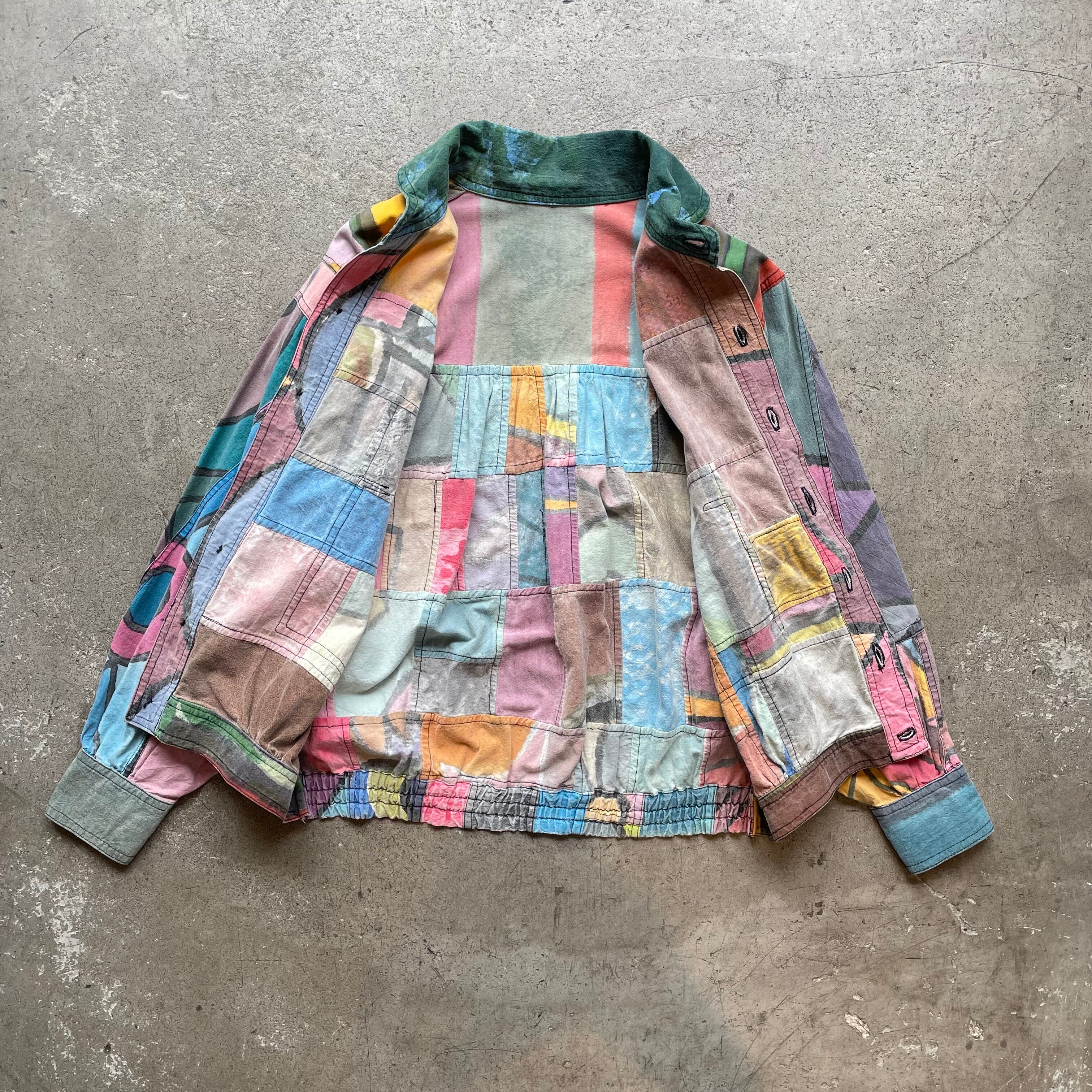 存在感抜群の総柄パッチワークジャケット。アーティスティックなグラフィックとマルチカラーの切り替えが目を引く1枚。タグがないため詳細不明ですが唯一無二のデザインを楽しみたい方におすすめ。