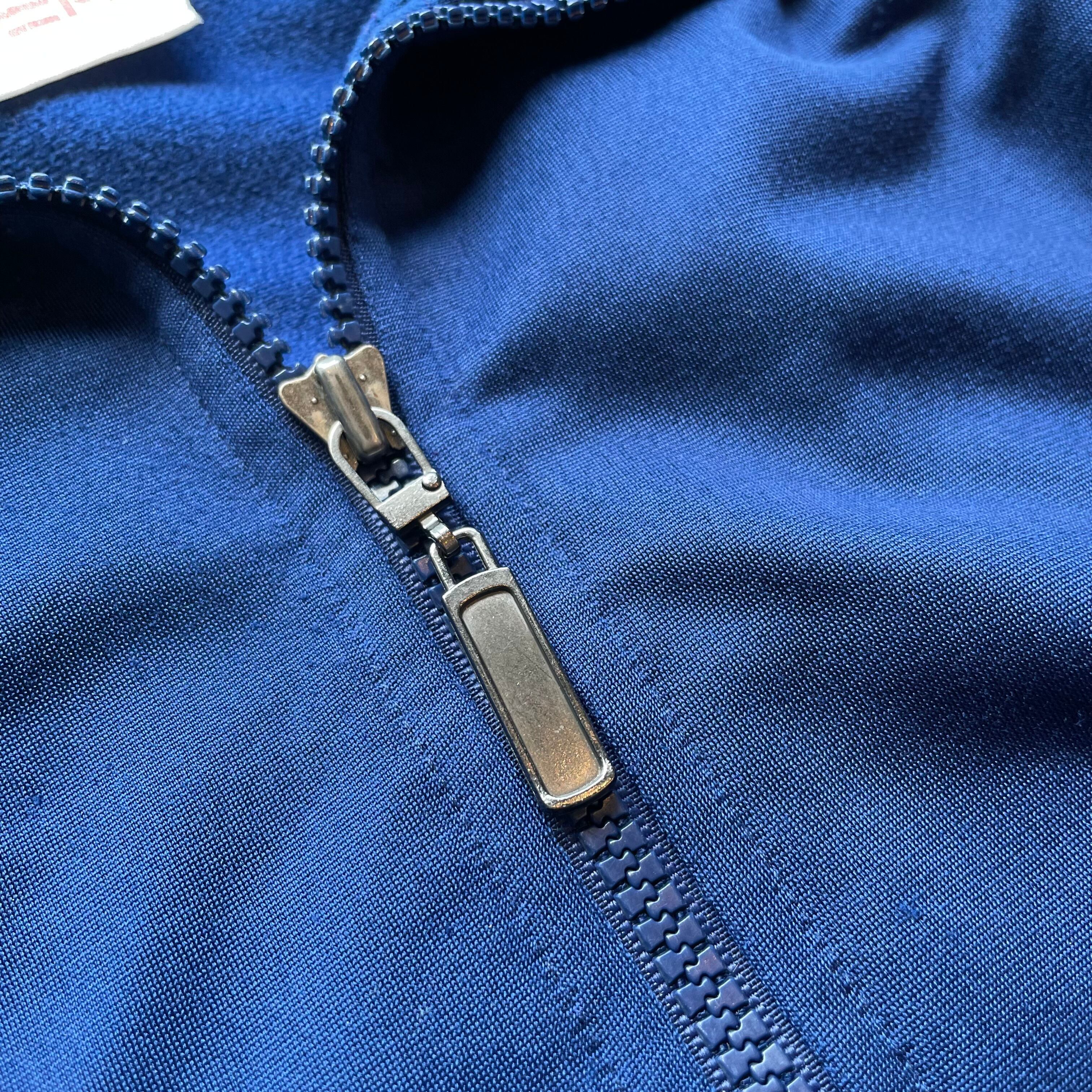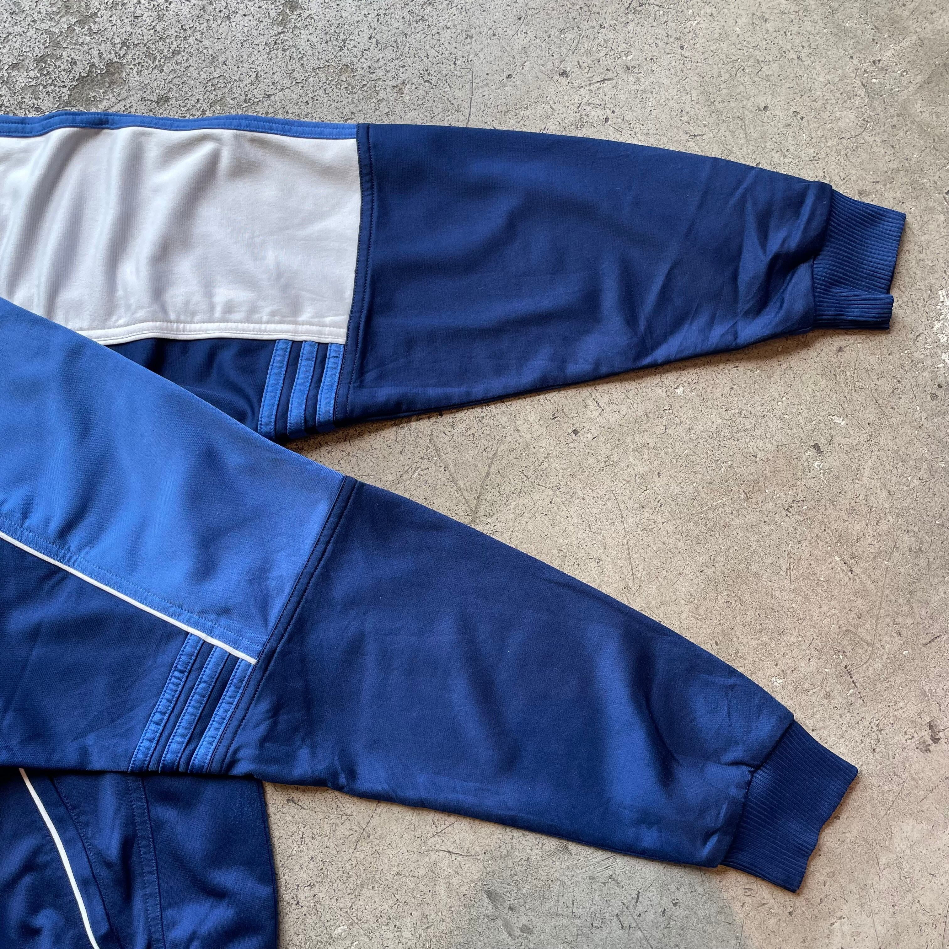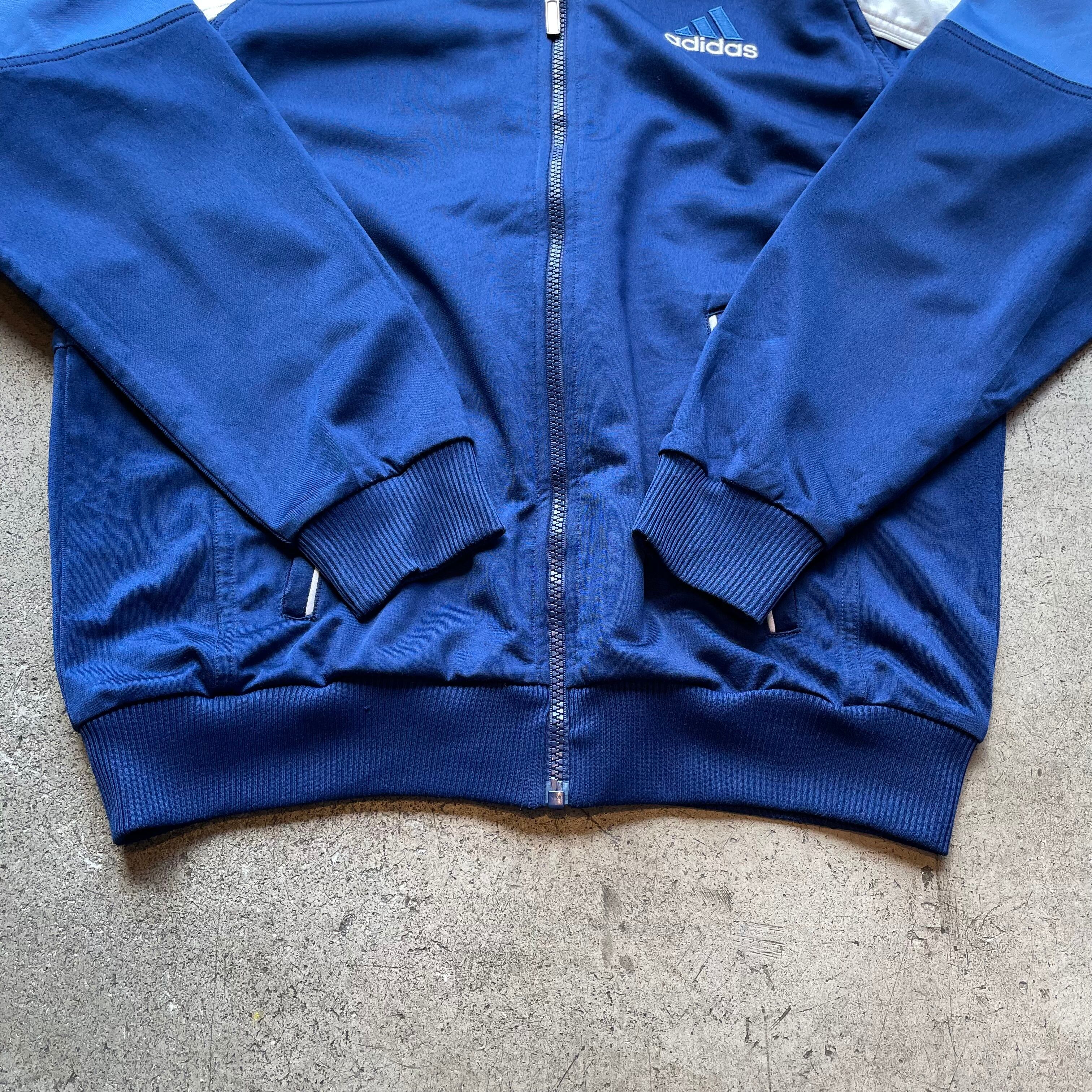 ブルーを基調にホワイトの切り替えが映えるadidasトラックジャケット。胸元のワンポイントロゴと3ラインディテールが特徴的です。ドルマンスリーブ仕様でゆったりとしたシルエットを楽しめます。