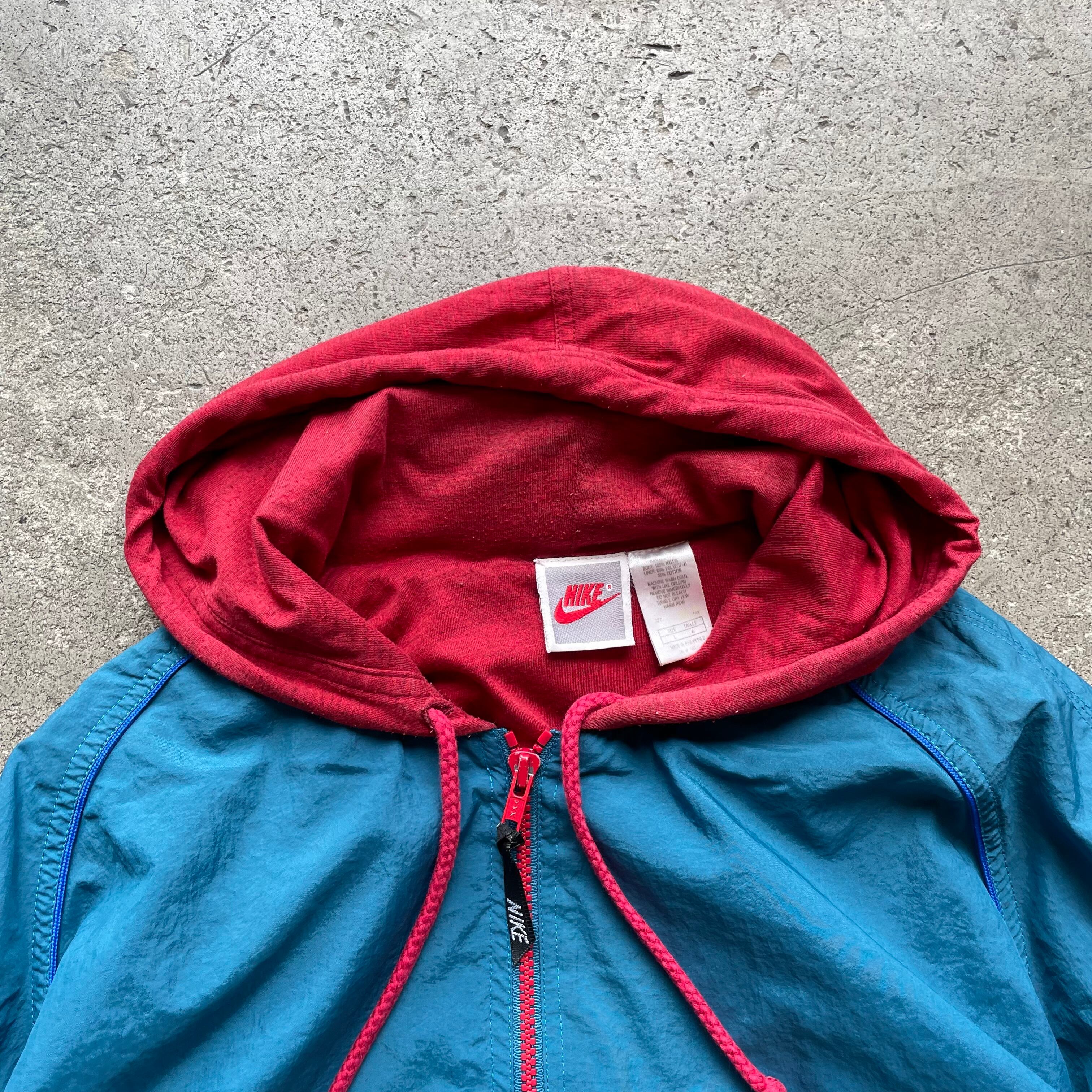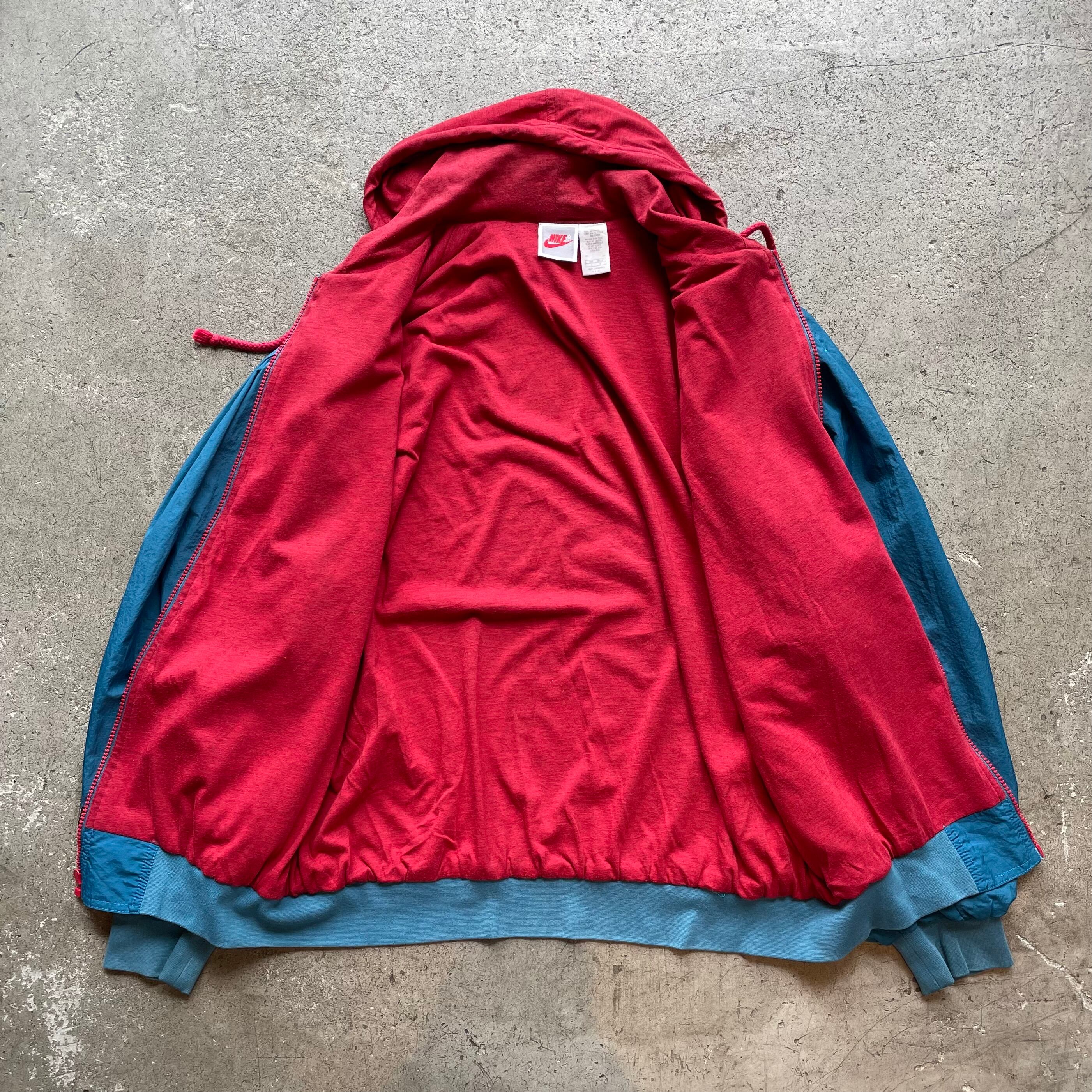90年代NIKEのフルジップフーディジャケット。ブルーとレッドの大胆なカラーリングが印象的でストリートでも映える一着です。ドルマンスリーブのゆったりしたシルエットはトレンド感もあり軽い羽織として季節を問わず活躍します。