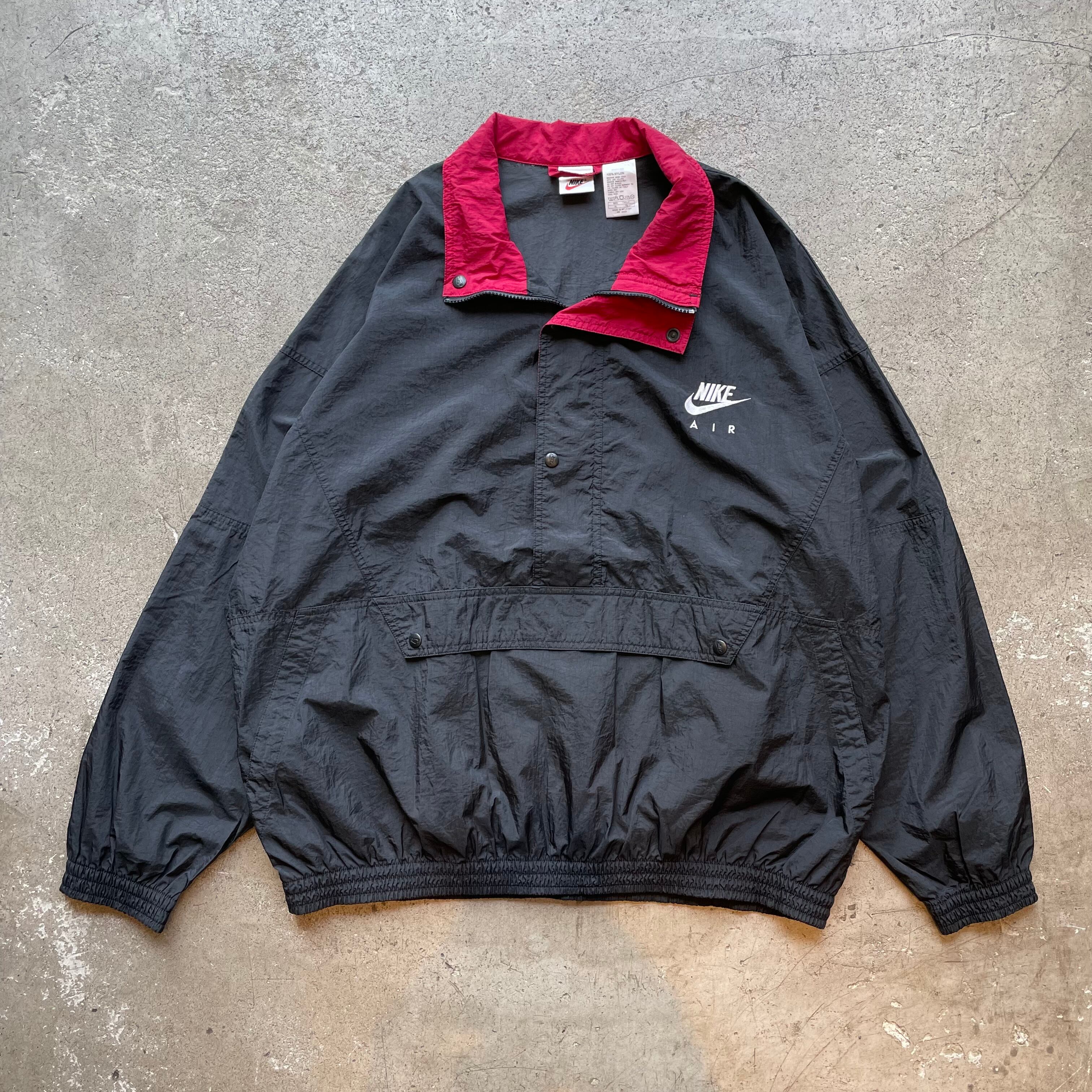 90年代NIKE AIRのハーフジップナイロンアノラック。胸元のスウォッシュロゴと赤いスタンドカラーが存在感を放つデザイン。カンガルーポケット付きで実用性も高く、90sナイキならではの希少なディテールが魅力の一着です。