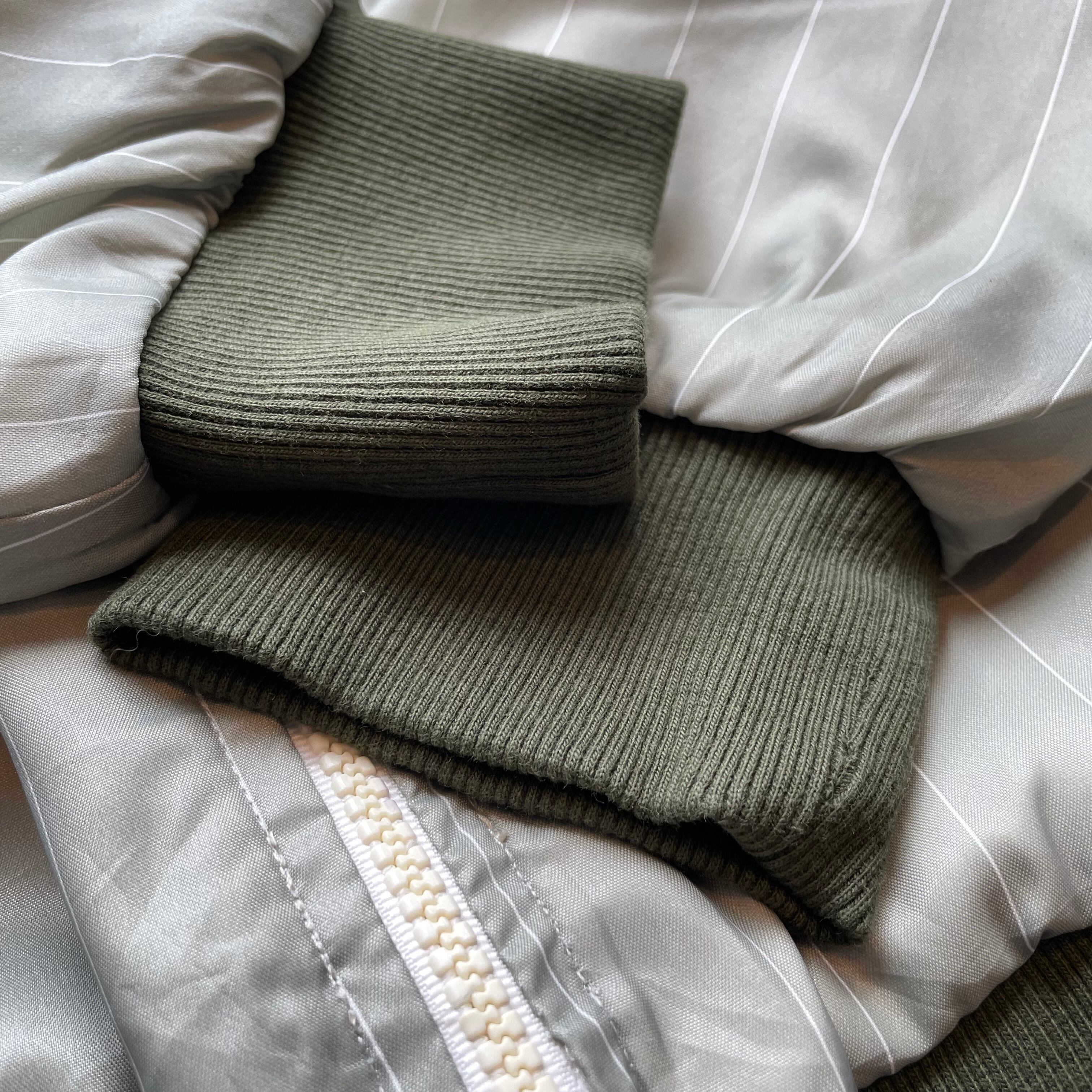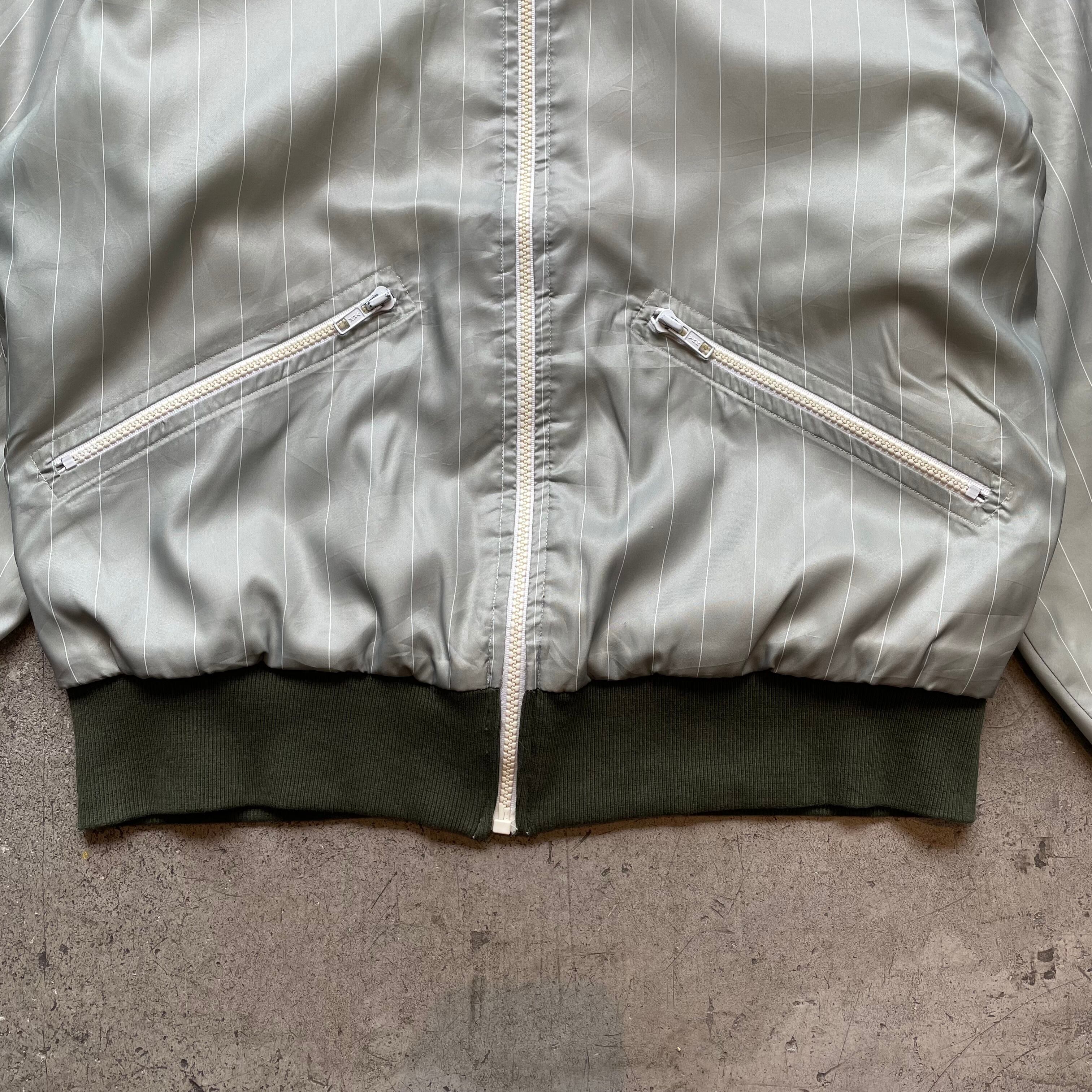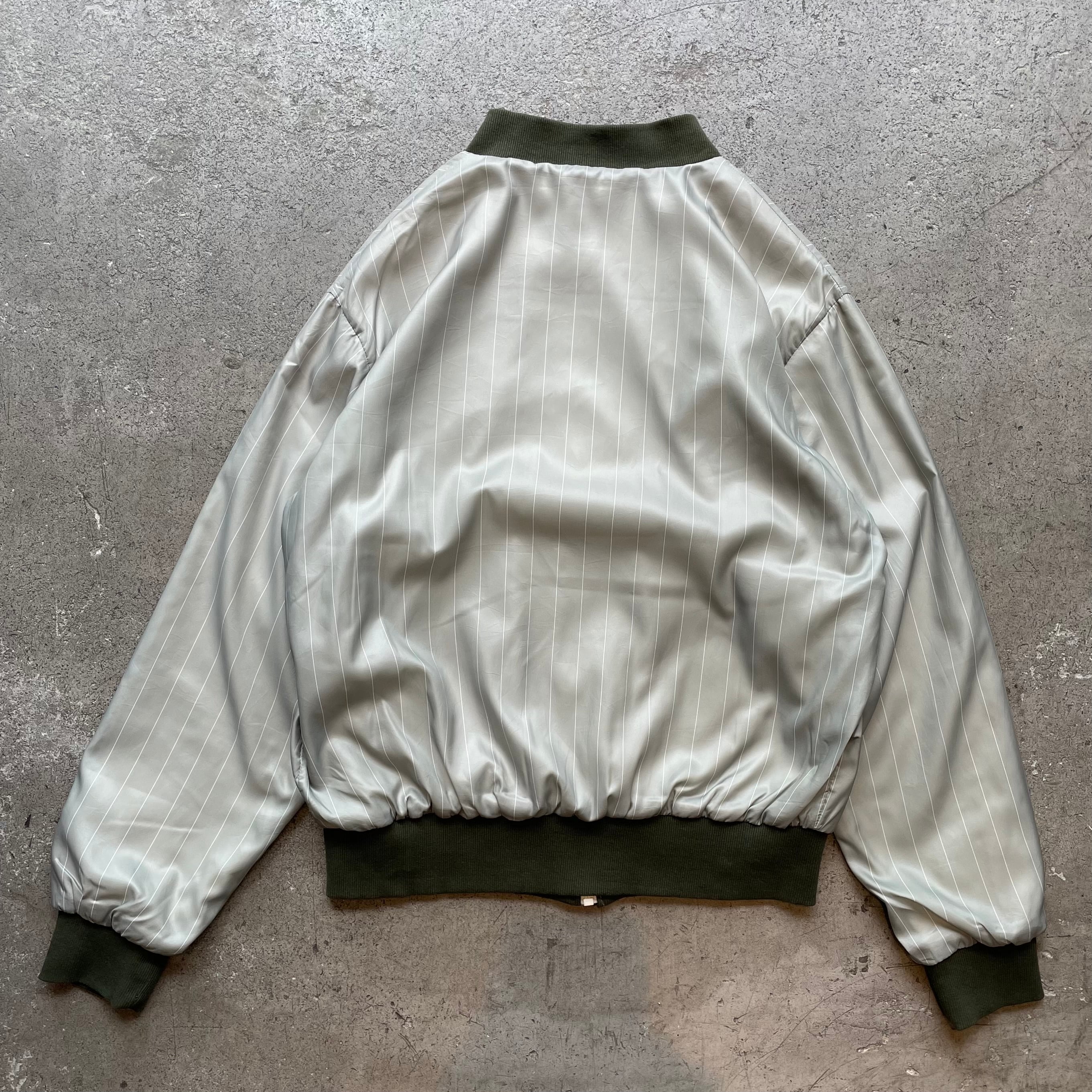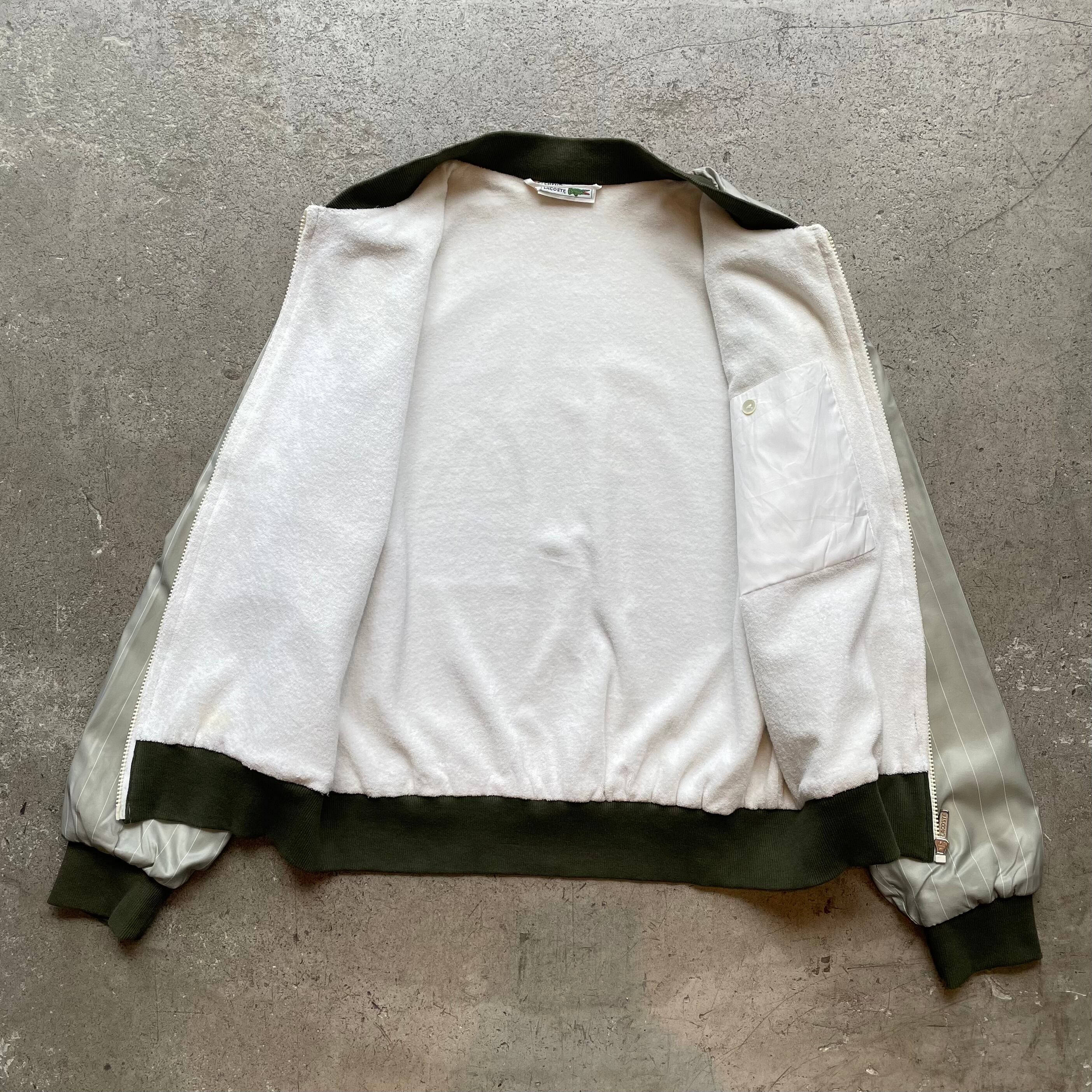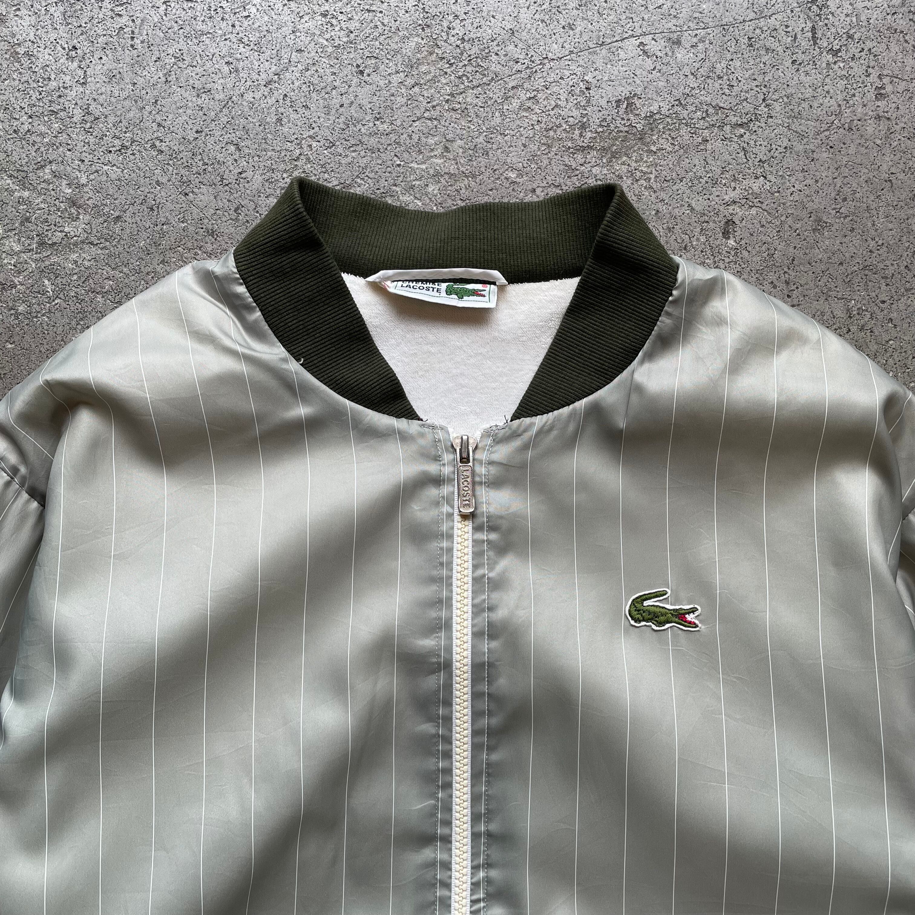 90年代フランス製ラコステのナイロンジャケット。ピンストライプが効いたクリーンなデザインにパイル地の裏地が柔らかな着心地をプラス。程よい光沢感とリブカラーのコントラストが都会的な印象を演出します。スポーティながらも洗練されたムードを持つ一着です。