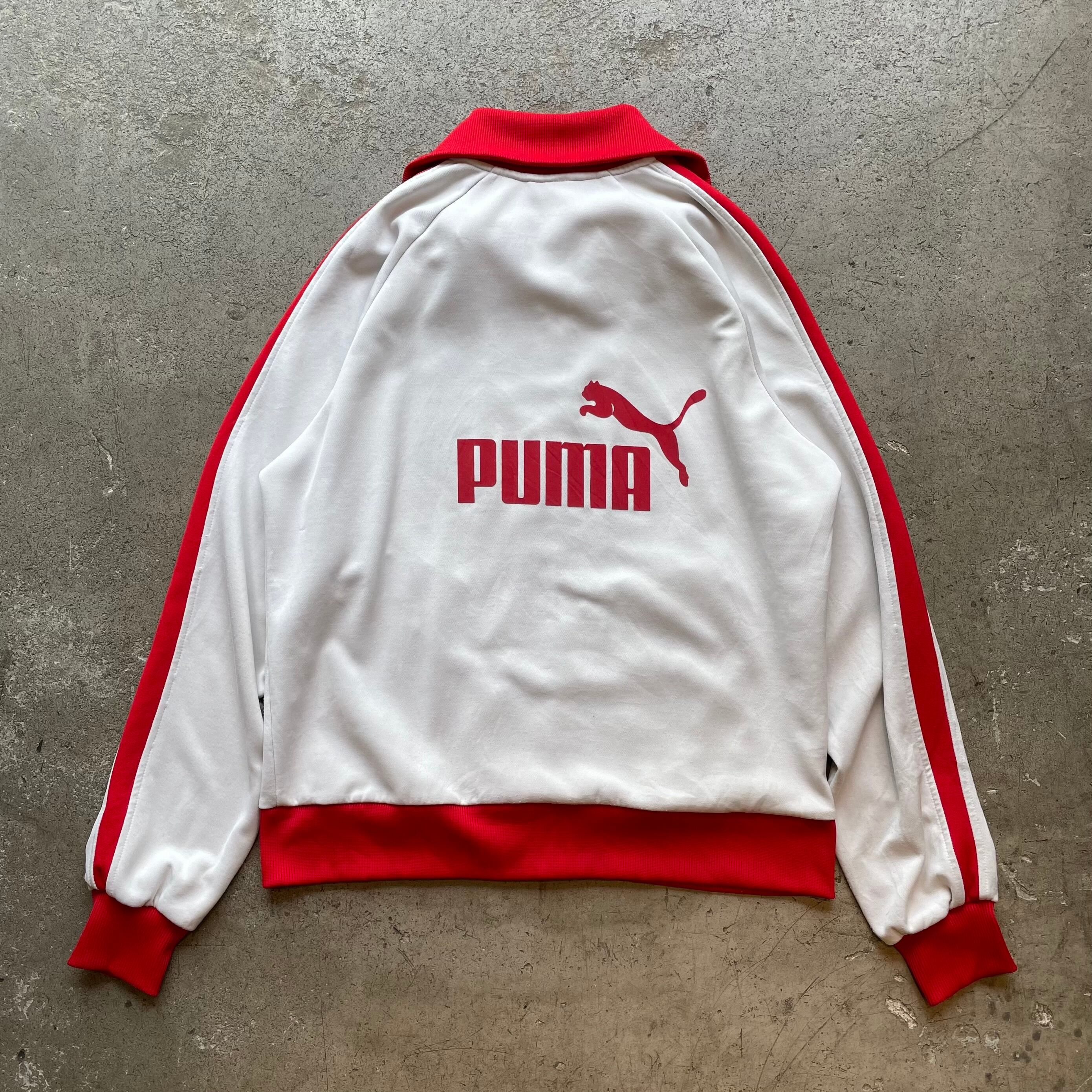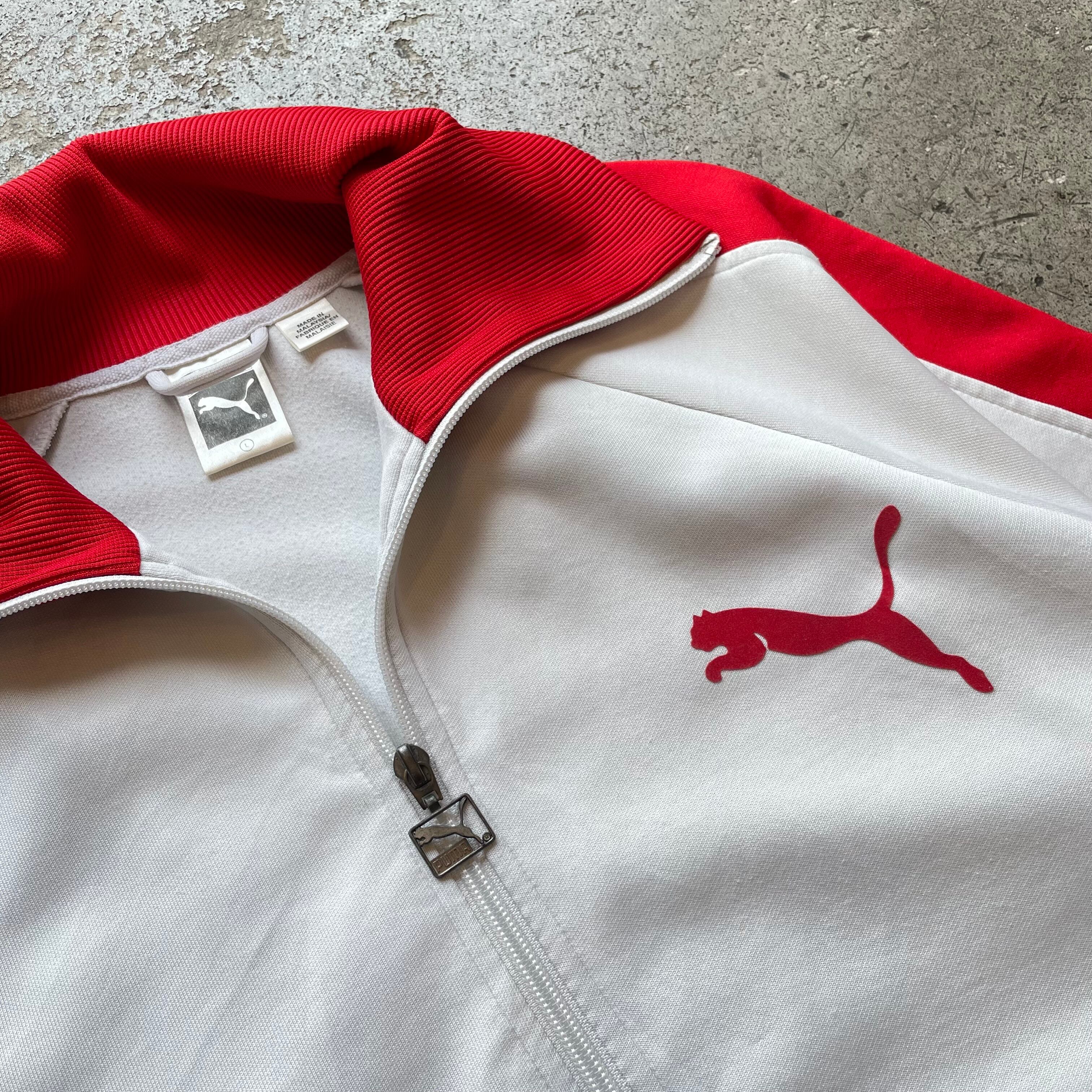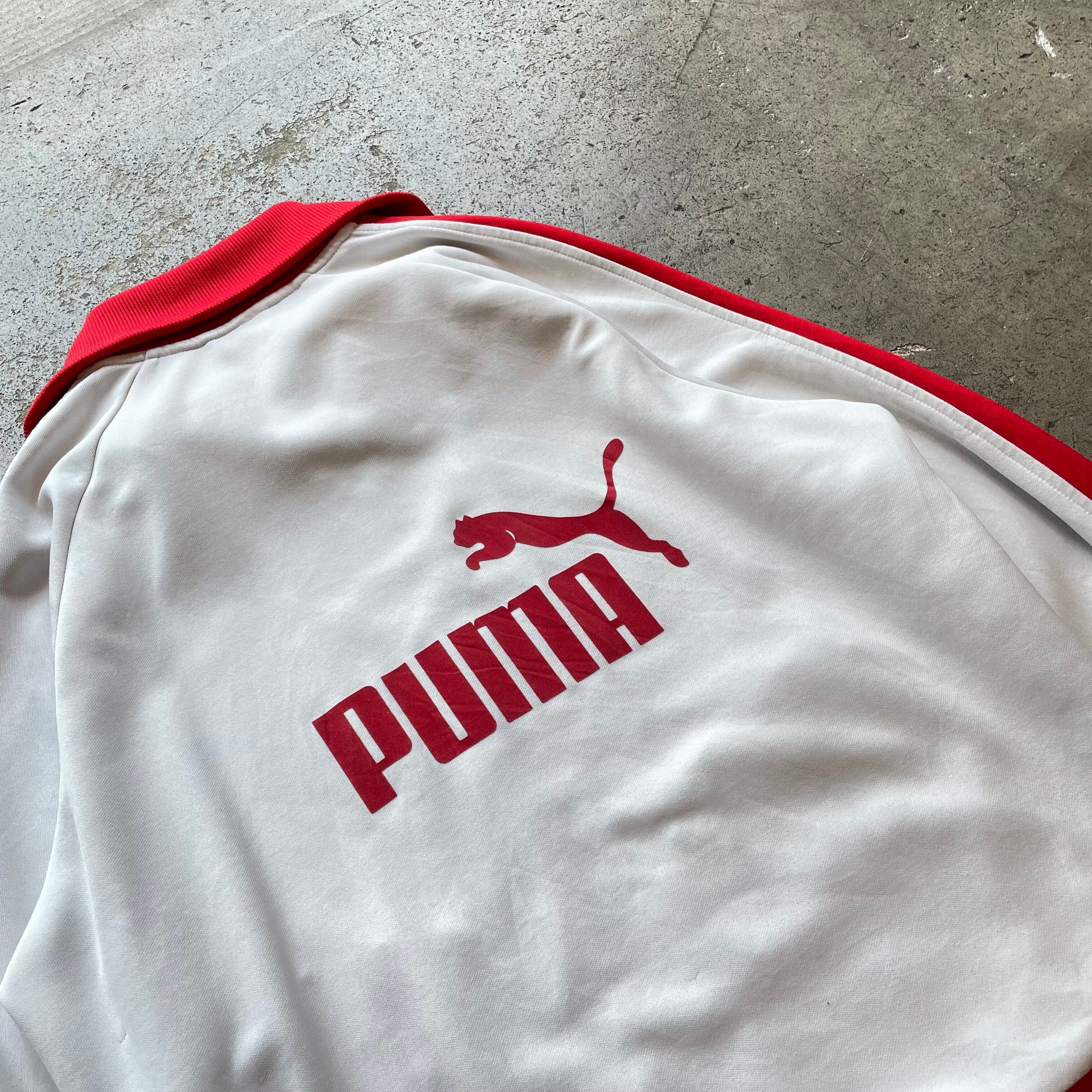 スポーツミックススタイルの定番として人気を誇るPUMAのトラックジャケット。ホワイトをベースに鮮やかなレッドの切り替えが映える一枚です。フロント胸元とバックに施されたブランドロゴが存在感を放ち、シンプルながらもクラシックなムードを演出します。幅広いスタイリングに取り入れやすいユーズド市場でも評価の高いアイテムです。