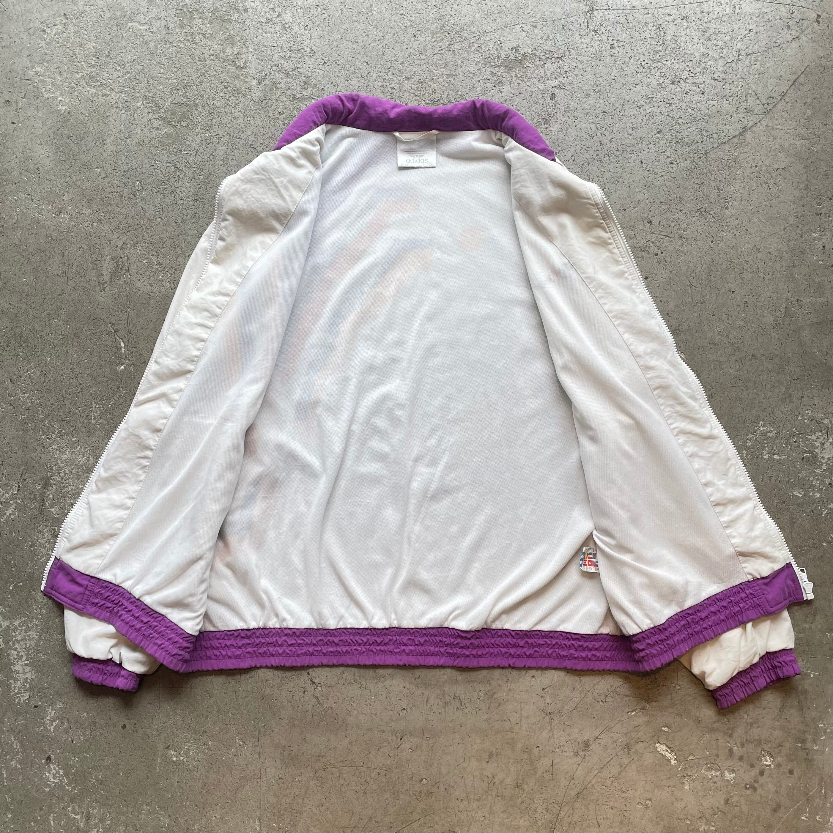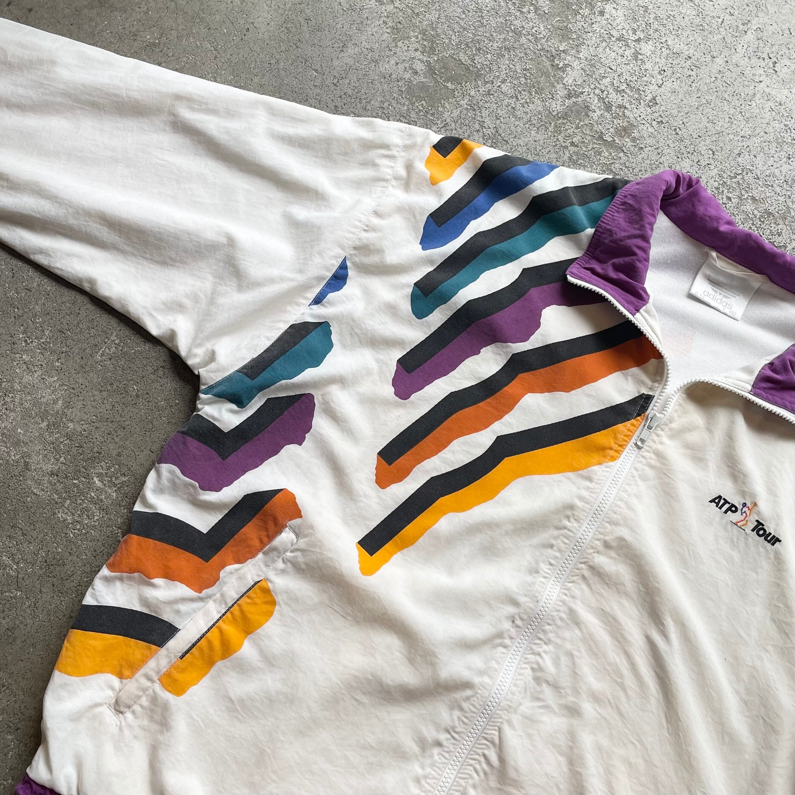 90年代の「ATP Tour」公式ラインとして展開されたadidas製ナイロンジャケット。フロントにATP Tourの刺繍ロゴ、スリーブにトレフォイルロゴを配した特別仕様です。公式ウェアならではの存在感に加え当時のテニスカルチャーを象徴するデザインが魅力。大胆なマルチカラープリントとパープルの切り替えはまさに90sらしいスポーツ×ストリートの融合を感じさせます。コレクション性も高い一着。
