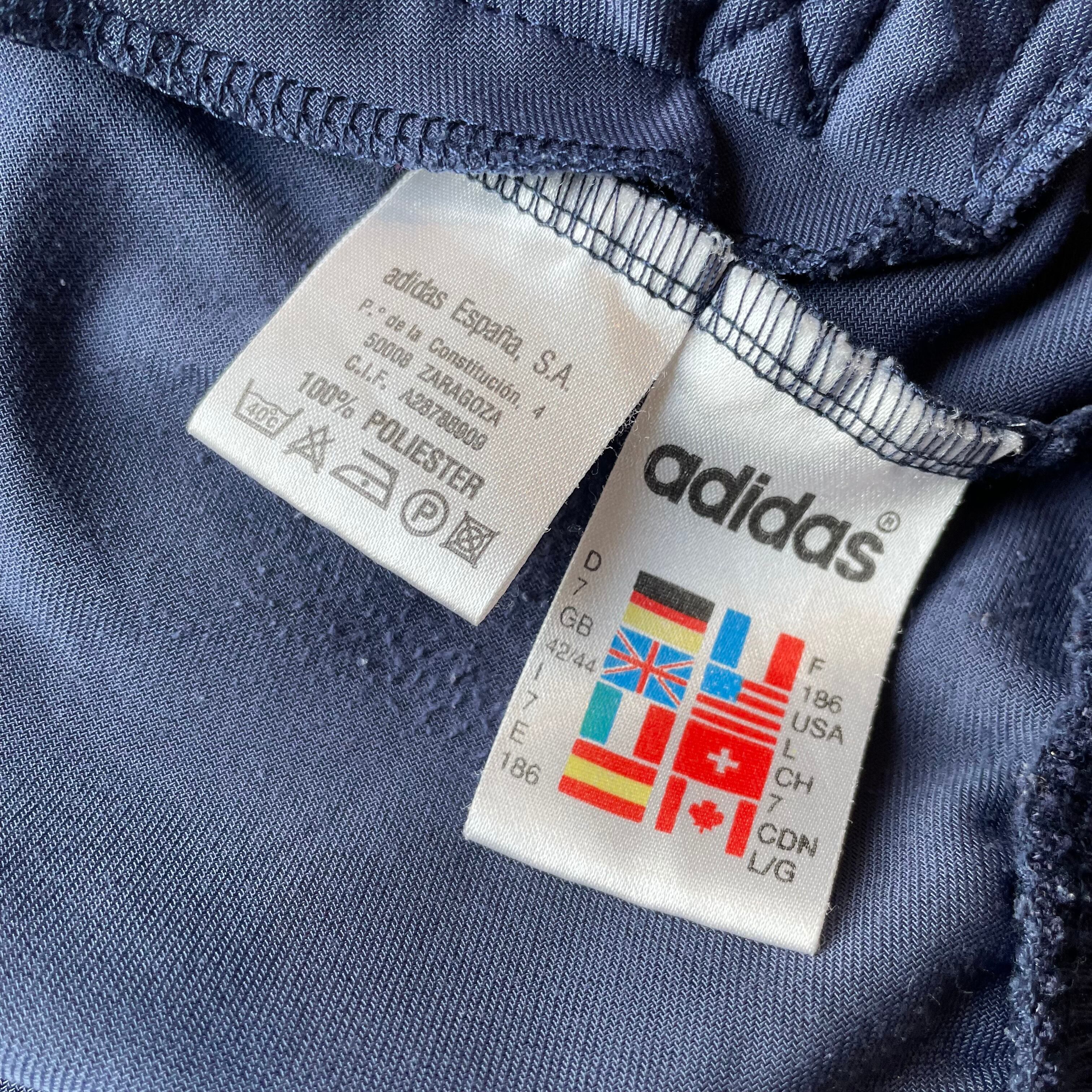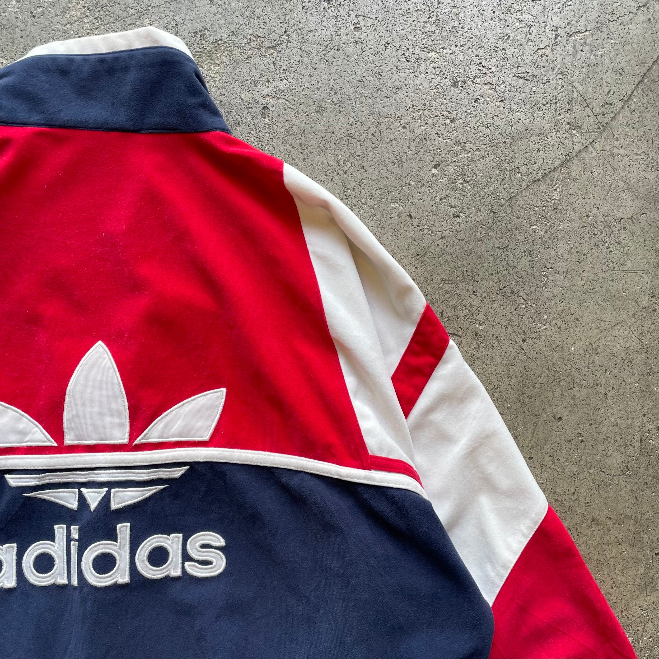 希少なEUライン、スペイン製のベロアトラックジャケット。胸元の刺繍ロゴに加え、背面には大きなトレフォイルロゴが入るインパクト抜群のデザイン。ベロア特有の光沢感とトリコロール配色が相まって90年代ならではの存在感を放つ一着です。