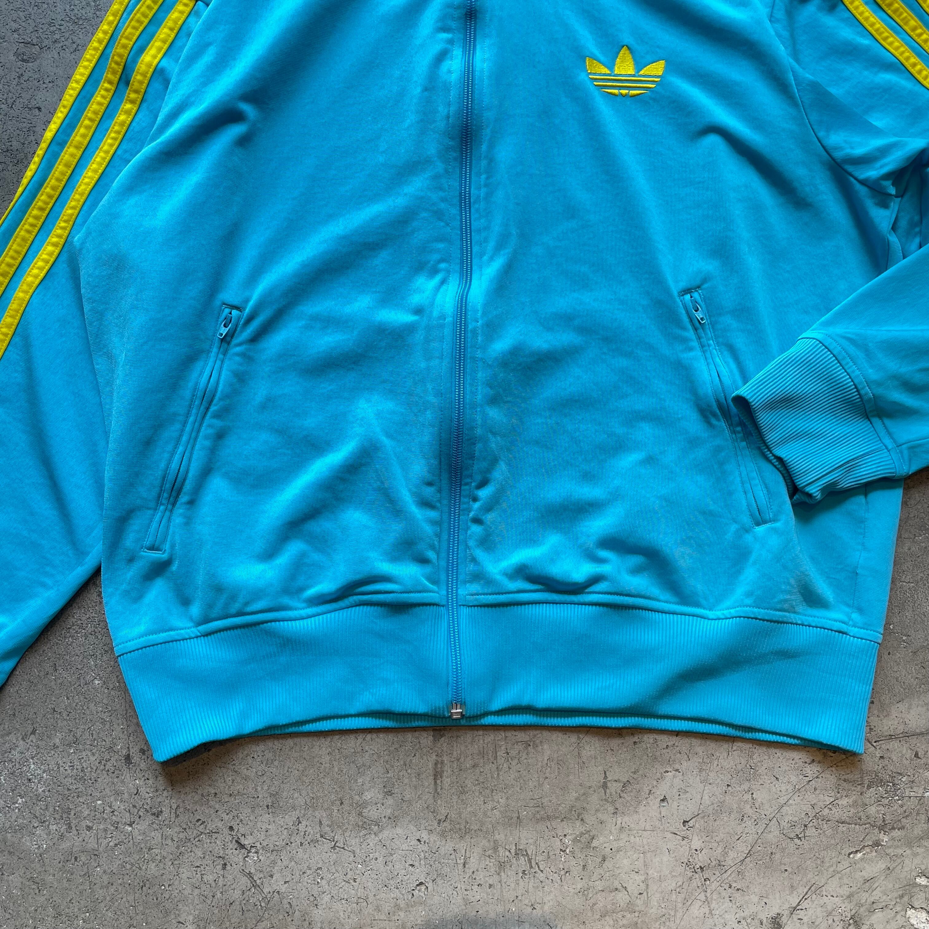 鮮やかなターコイズブルーにイエローのスリーストライプが映えるadidasのトラックジャケット。クラシックなトレフォイルロゴと伝統的なシルエットがスポーツミックスやストリートスタイルに定番として取り入れやすい一着です。明るいカラーリングがスタイリングのアクセントとして活躍します。
