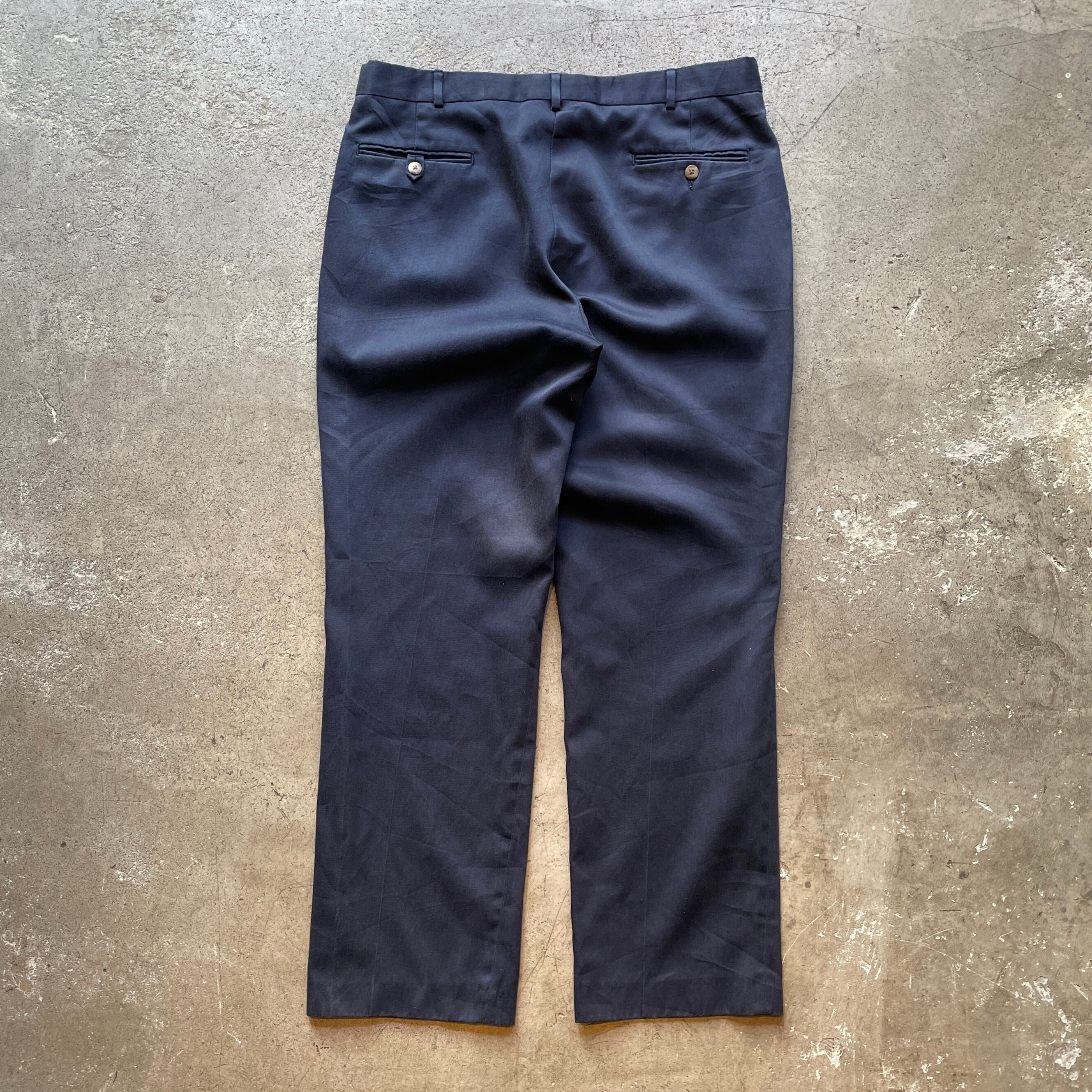 L.L.Beanのネイビースラックス。無駄を省いたシンプルなデザインで程よいテーパードシルエットが特徴。カジュアルからきれいめまで幅広く取り入れやすい一本です。裾にあたりや小さなダメージはありますが古着らしい味として楽しめるコンディション。