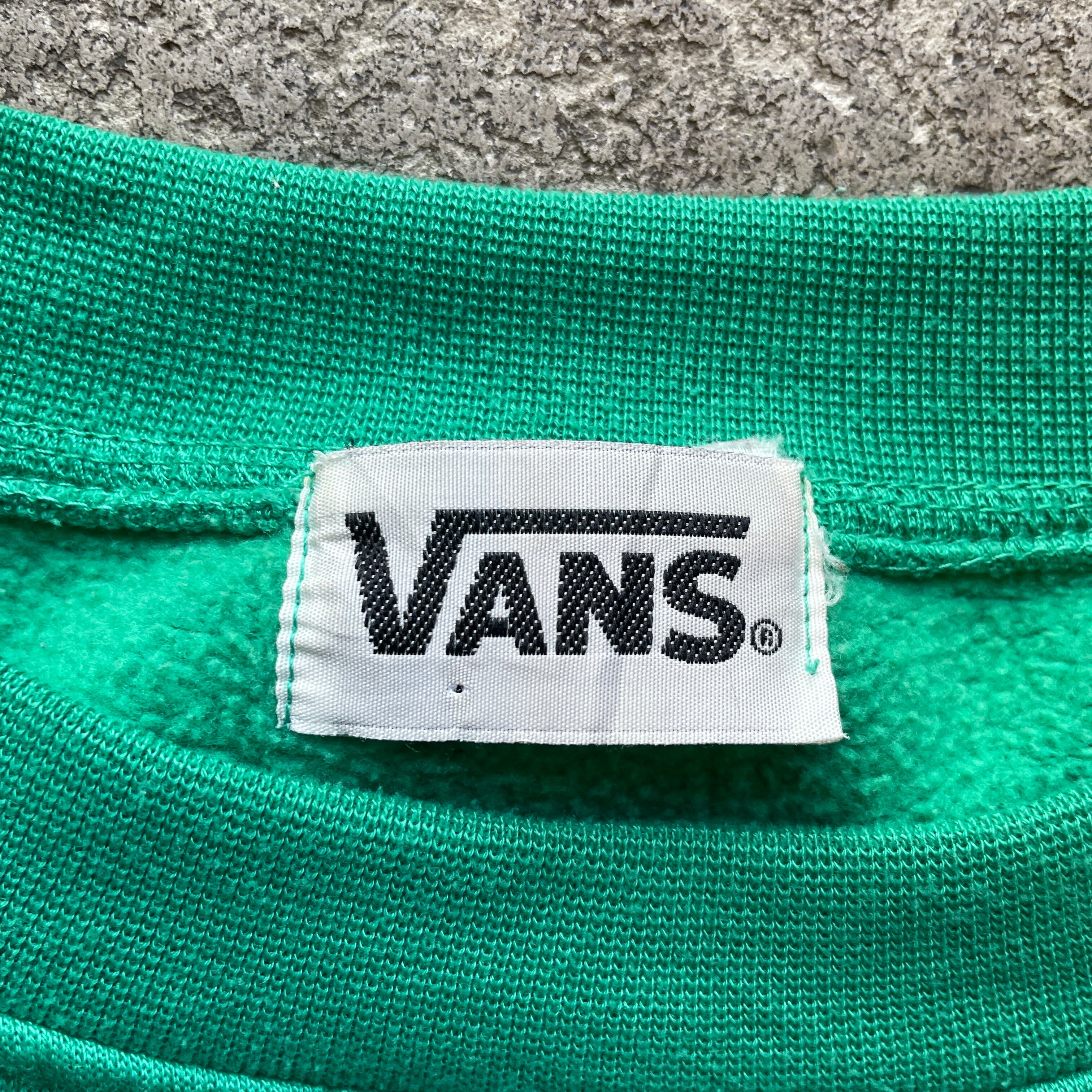 90年代VANSのスウェット。パームツリーとサンセットが描かれた鮮やかなグリーンボディにマルチカラーのプリントが映える一枚です。ストリート感のあるデザインながら90sらしいゆったりシルエットが魅力。古着好きにはもちろん、コーディネートの差し色にもおすすめです。