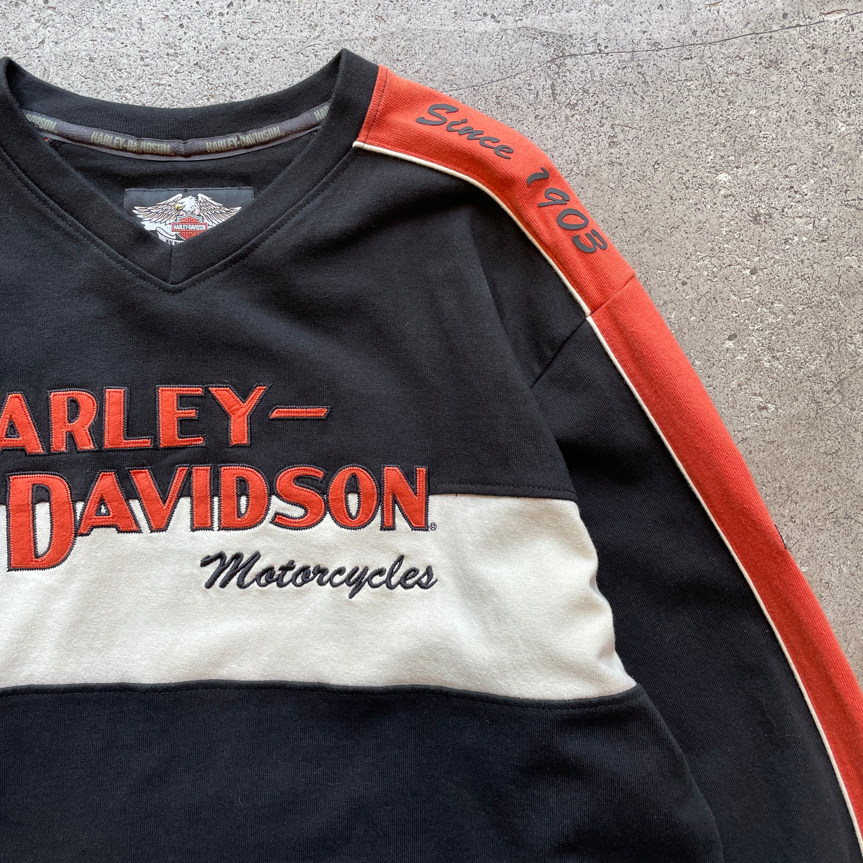 2006年製のHARLEY-DAVIDSONロゴスウェット。両袖と背面にもブランドロゴが入る存在感抜群の1枚。厚手のコットン生地にVネックデザインが映えるヴィンテージ感とスポーティさを兼ね備えた一着です。