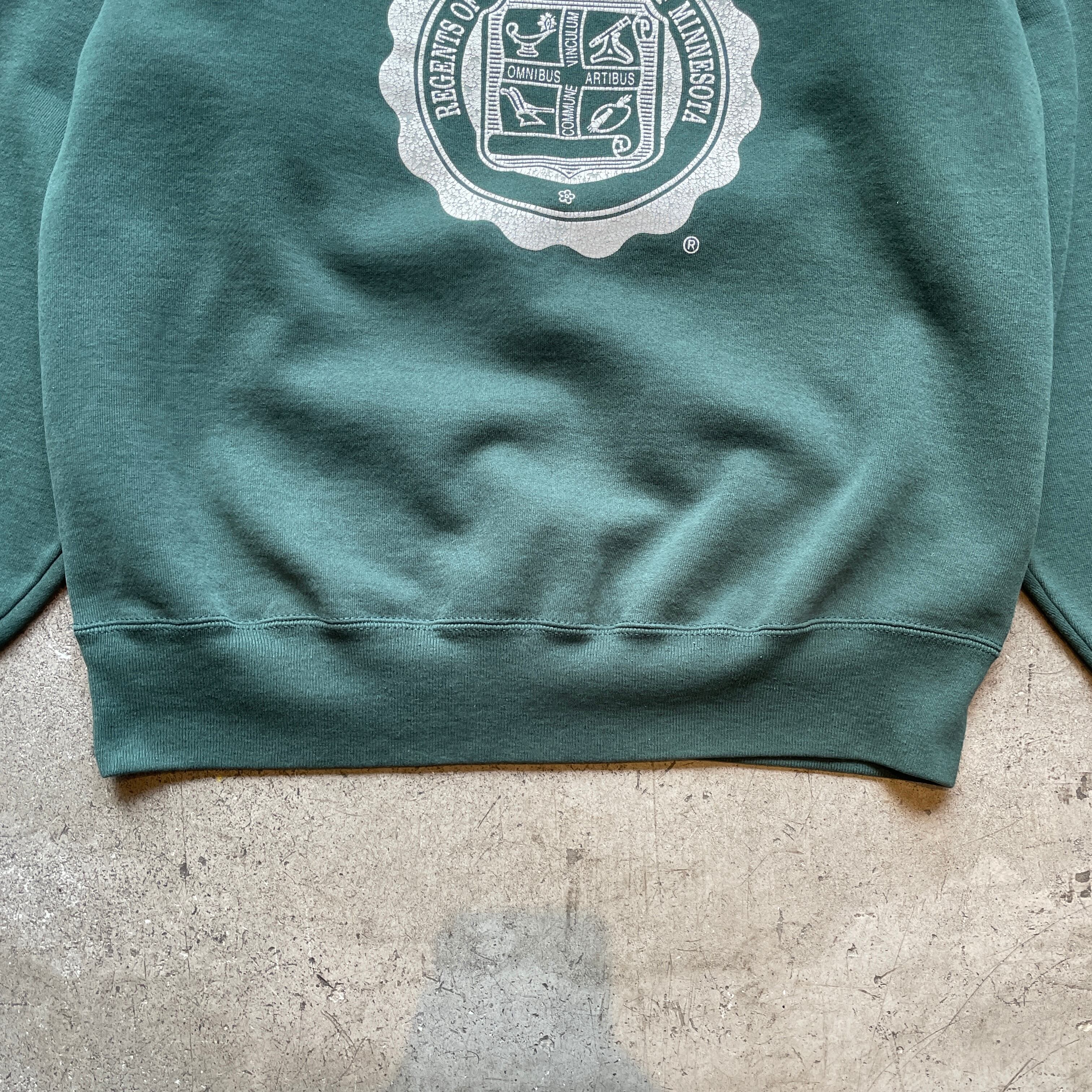 90年代Champion製、アメリカ製スウェット。“MINNESOTA”のカレッジロゴと大学エンブレムが入った王道デザイン。深みのあるグリーンカラーとゆったりしたサイズ感で古着らしい雰囲気を楽しめる一着です。