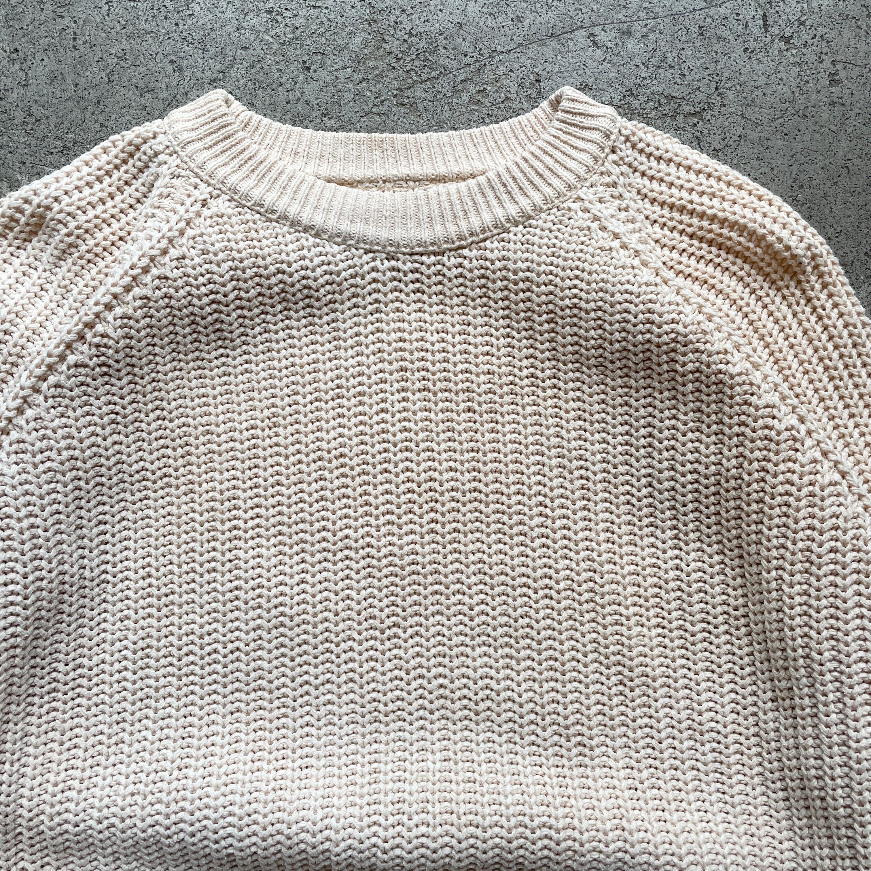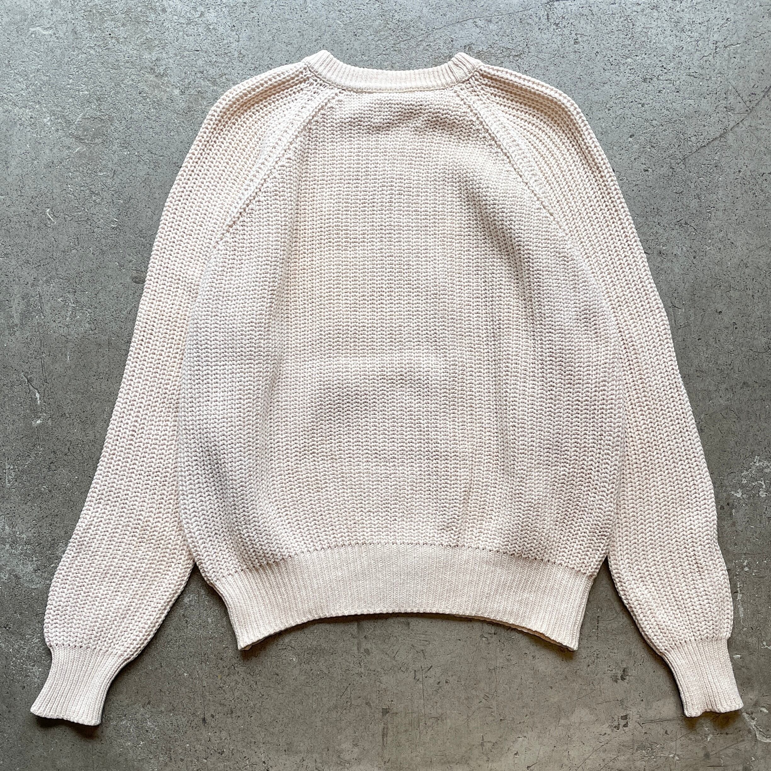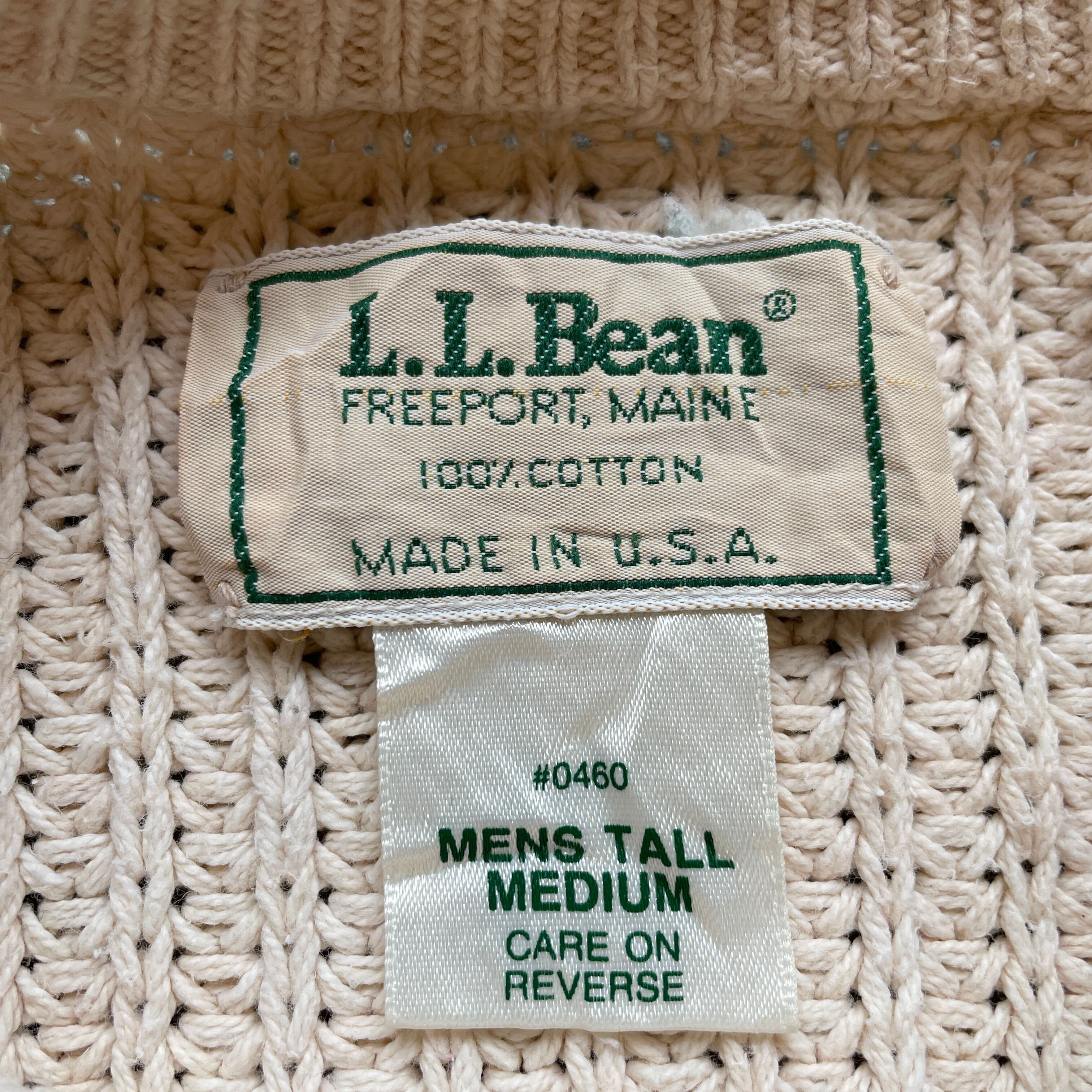 L.L.Beanの80年代USA製コットンニット。ざっくりとした編み地と程よくワイドなシルエットが魅力の一枚。肉厚ながらもコットン素材特有のドライな質感で季節の変わり目にも着やすい万能アイテムです。ナチュラルなトーンでどんなコーデにも馴染み、ヴィンテージらしい風合いを楽しめます。