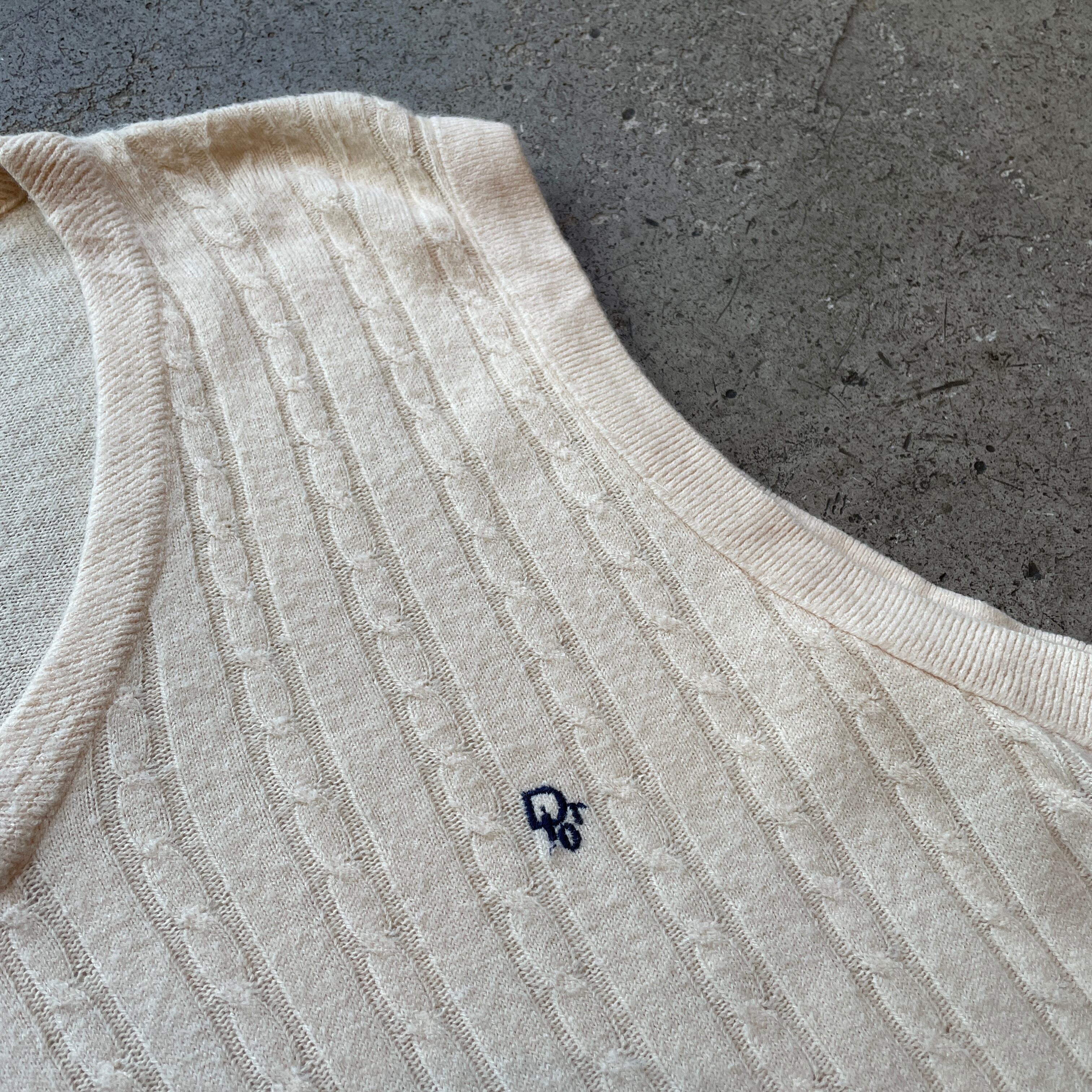 Christian Dior MONSIEURのケーブル編みニットベスト。クラシックなケーブルパターンに胸元の“CD”ロゴ刺繍が映える上品な一枚です。アイボリーカラーの柔らかな雰囲気がシャツやジャケットとのレイヤードにも最適。90年代頃の上質なディオールらしい落ち着いた大人のスタイルを演出してくれます。