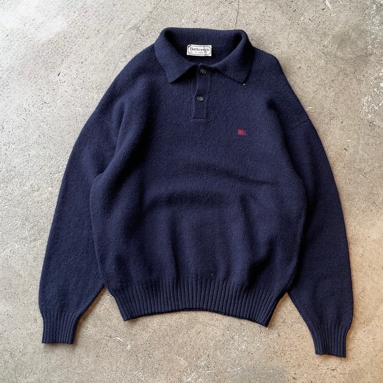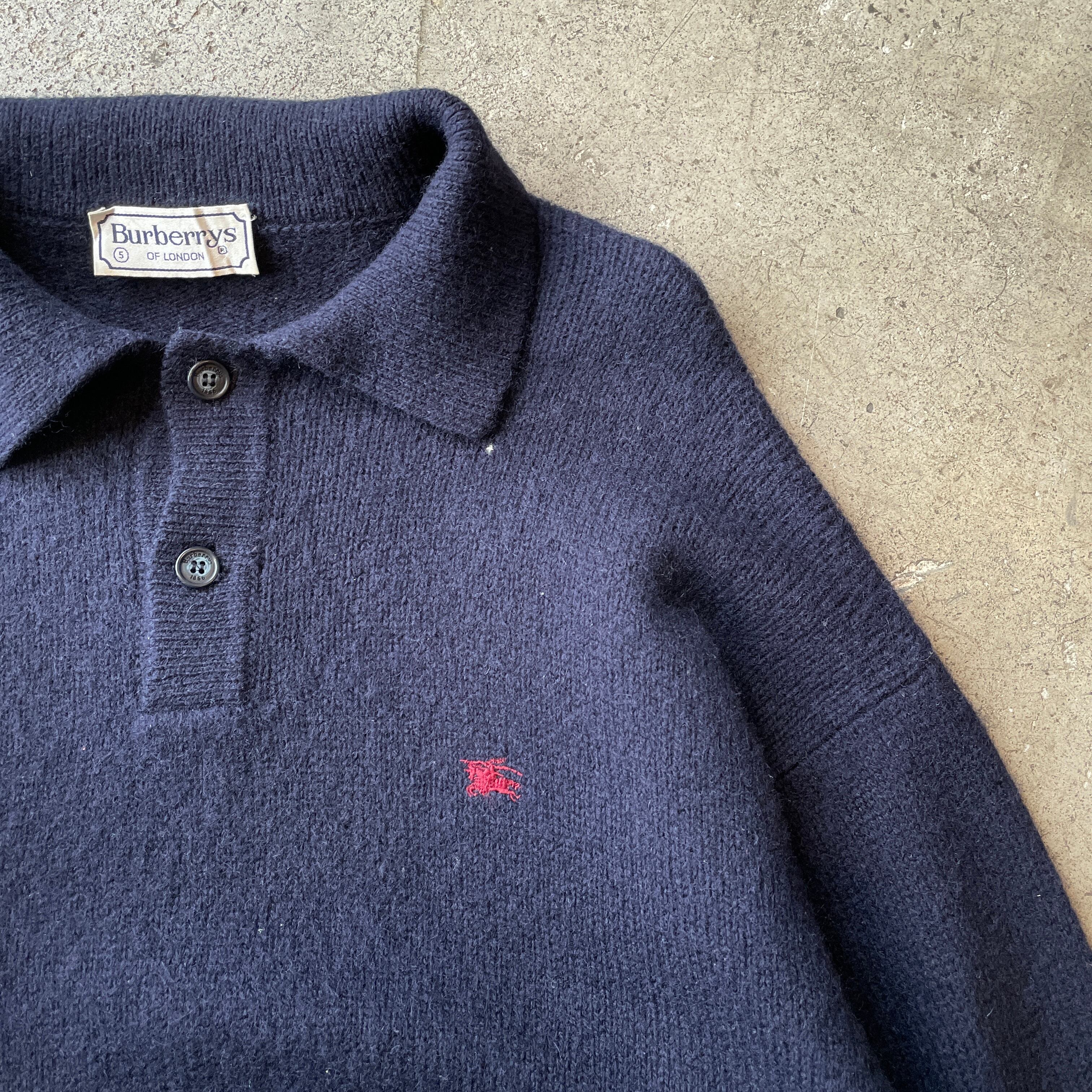 旧ロゴ「Burberrys」時代のポロニットセーター。柔らかなウール素材で程よく厚みのあるミドルゲージニット。胸元には赤のホースロゴ刺繍入り。上品な印象のネイビーカラーでジャケットのインナーにも使いやすいクラシックな一枚です。