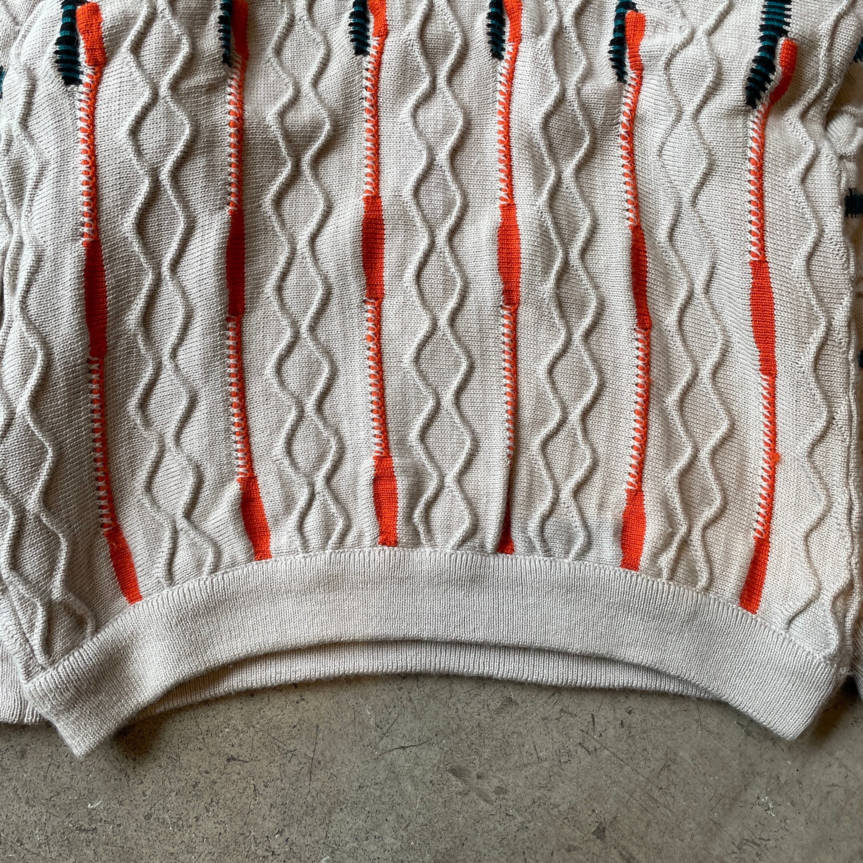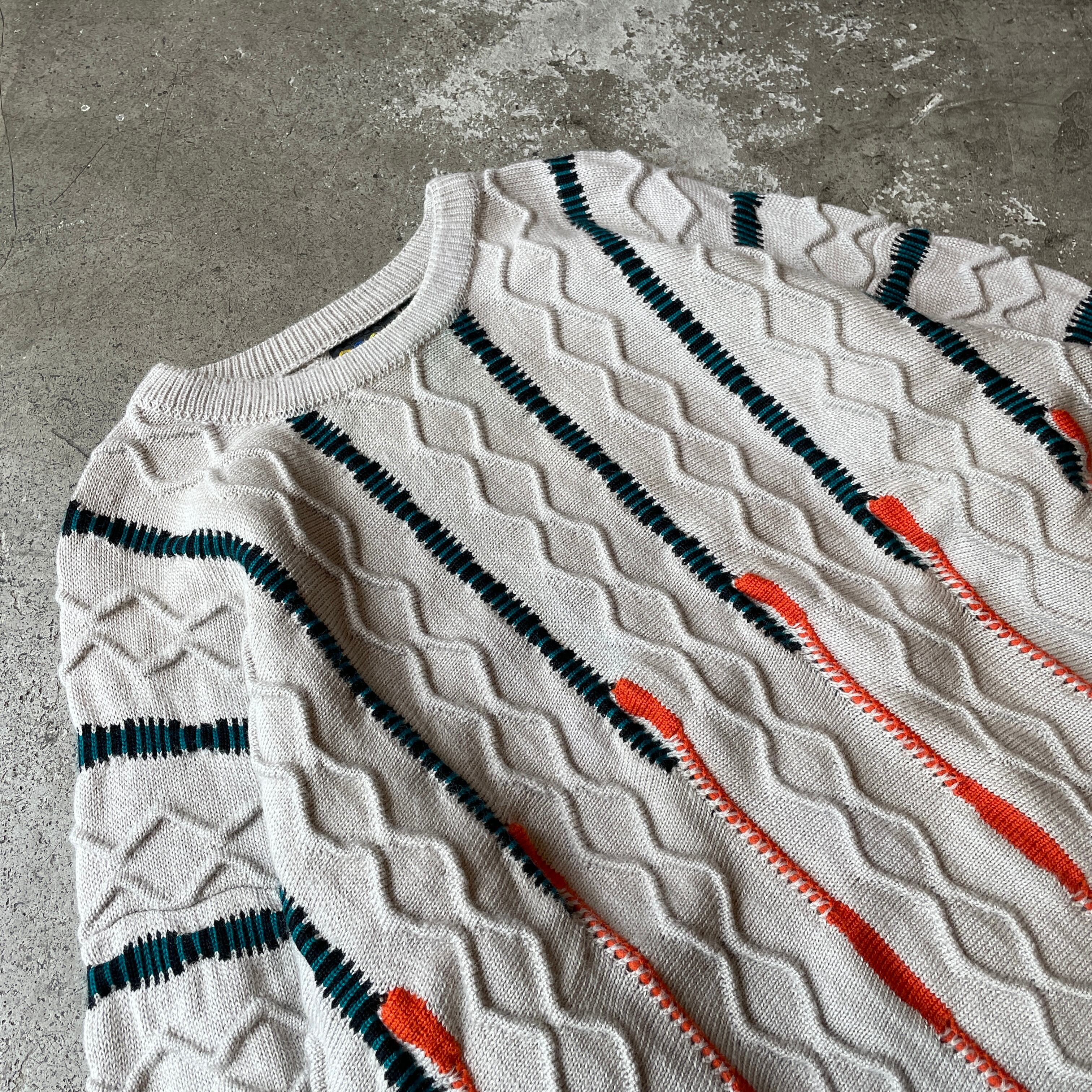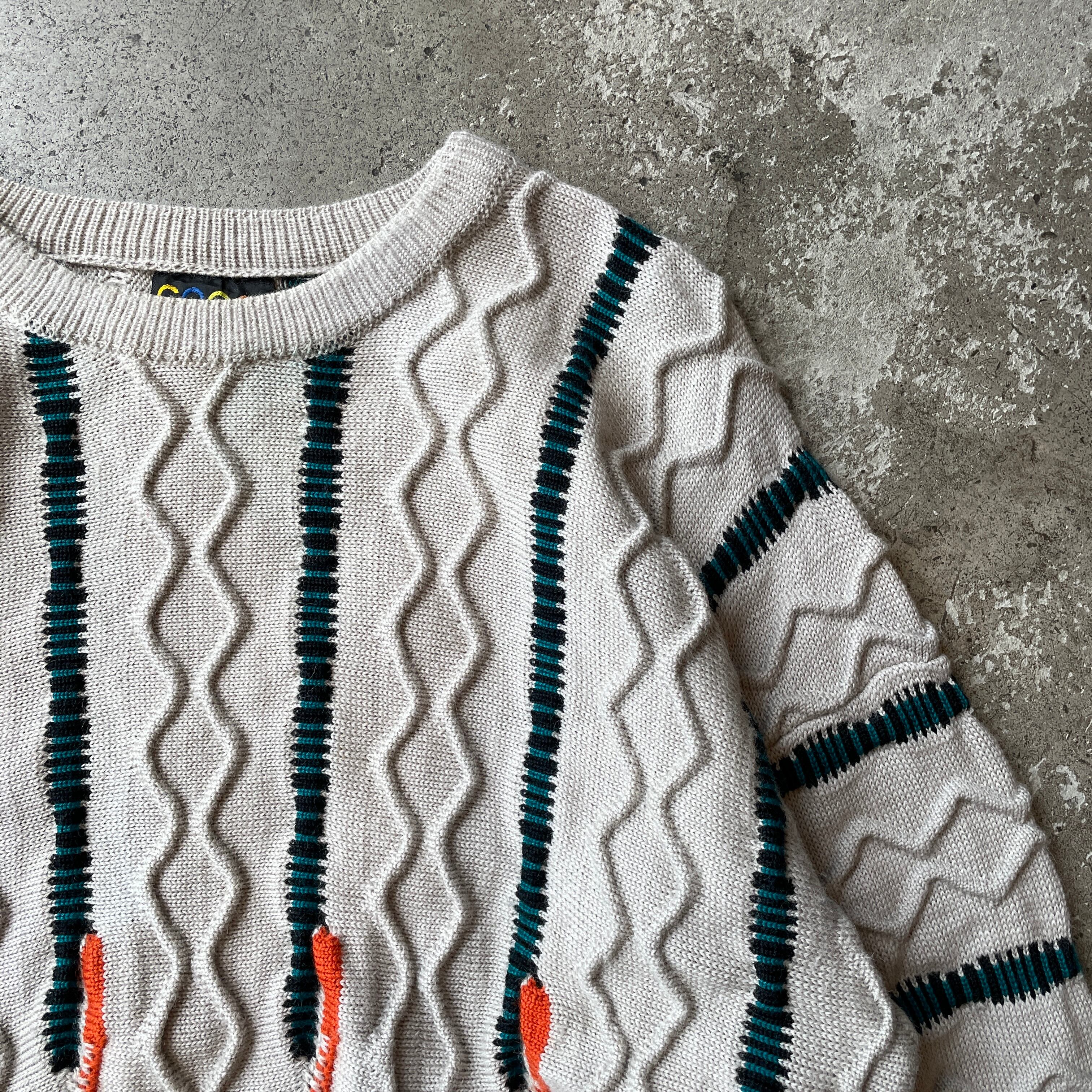 オーストラリア発の高級ニットブランド「COOGI」から独特の立体編みとカラーラインが特徴的なピュアウールニット。通常のCOOGIとは異なるフラットなケーブル編みに鮮やかなストライプ状の配色を施した珍しいデザインです。一点一点異なる編み立てパターンと重厚な質感が魅力で、ヴィンテージ市場でも注目度の高いアイテム。