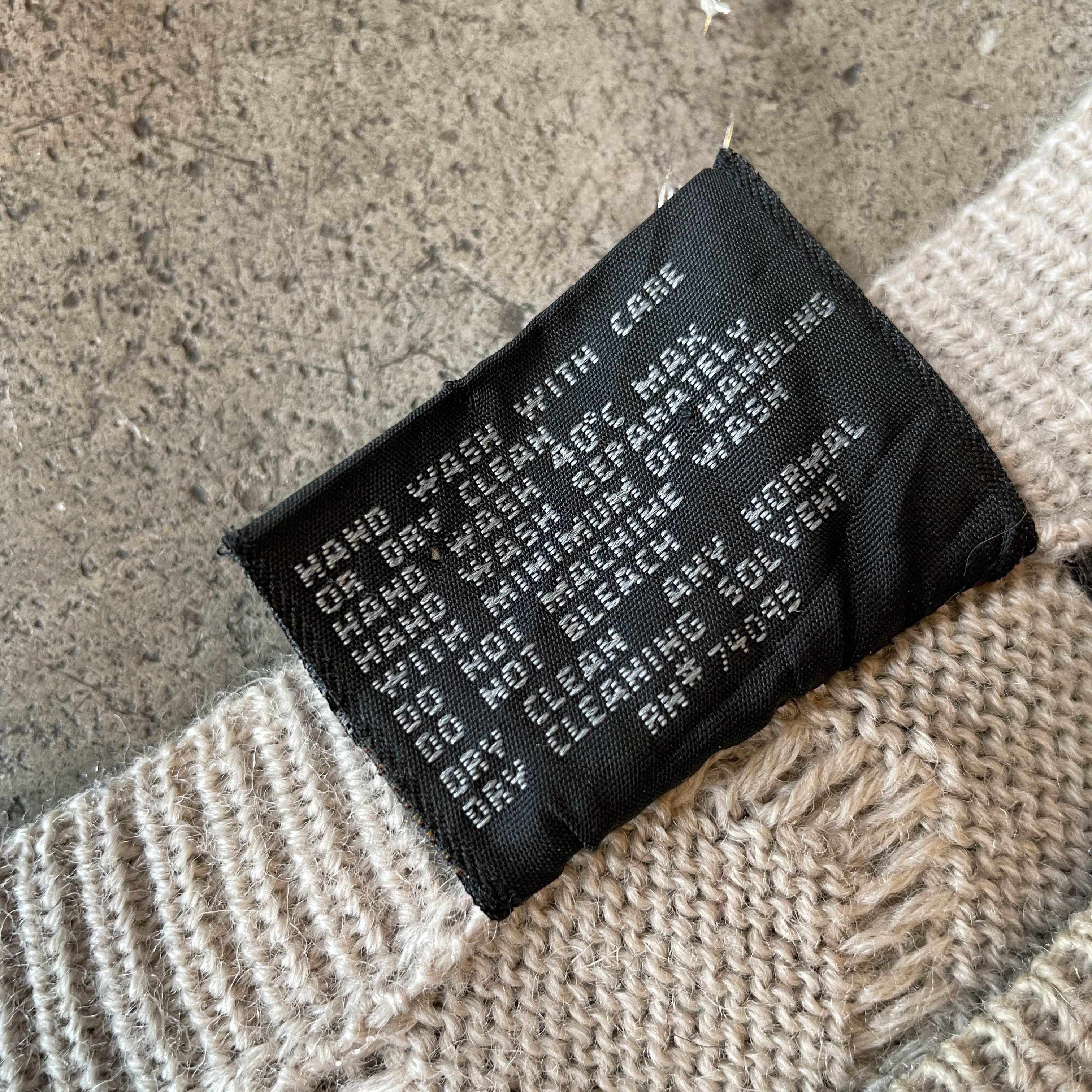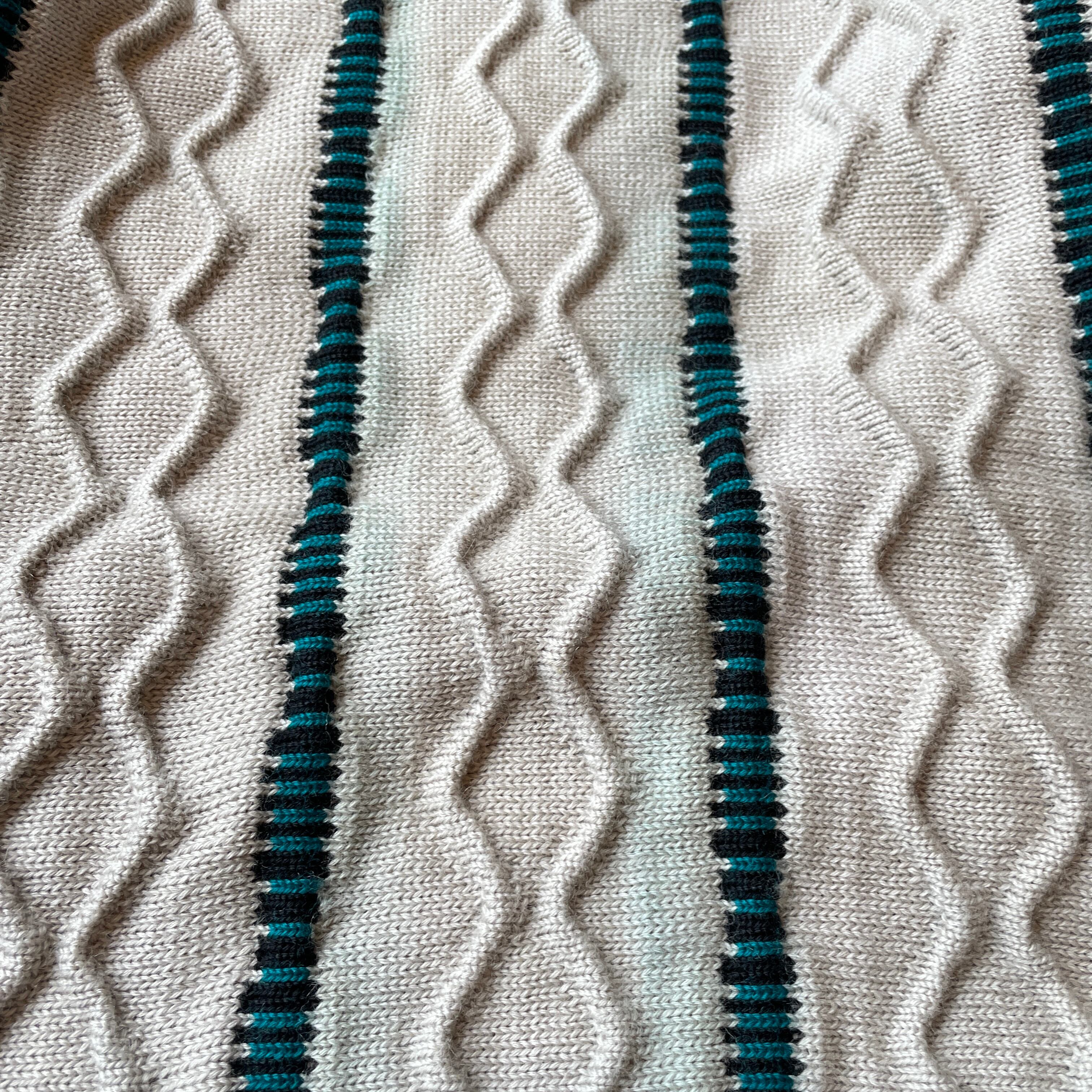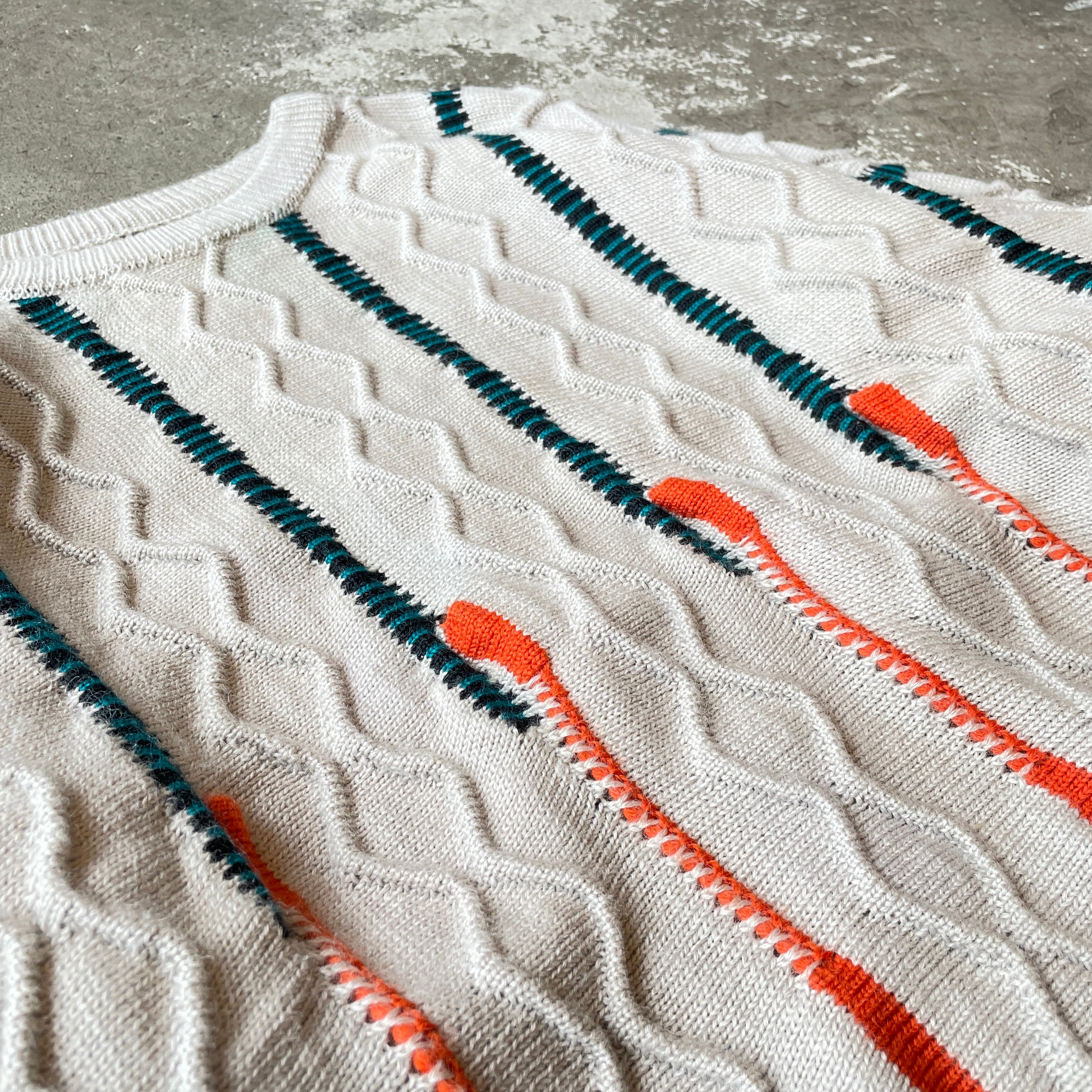 オーストラリア発の高級ニットブランド「COOGI」から独特の立体編みとカラーラインが特徴的なピュアウールニット。通常のCOOGIとは異なるフラットなケーブル編みに鮮やかなストライプ状の配色を施した珍しいデザインです。一点一点異なる編み立てパターンと重厚な質感が魅力で、ヴィンテージ市場でも注目度の高いアイテム。
