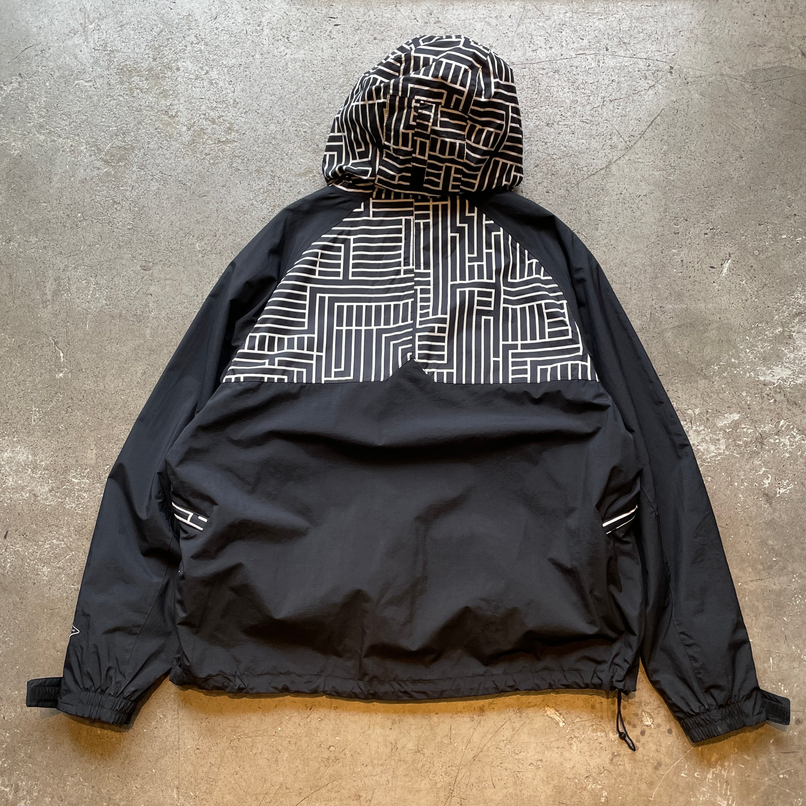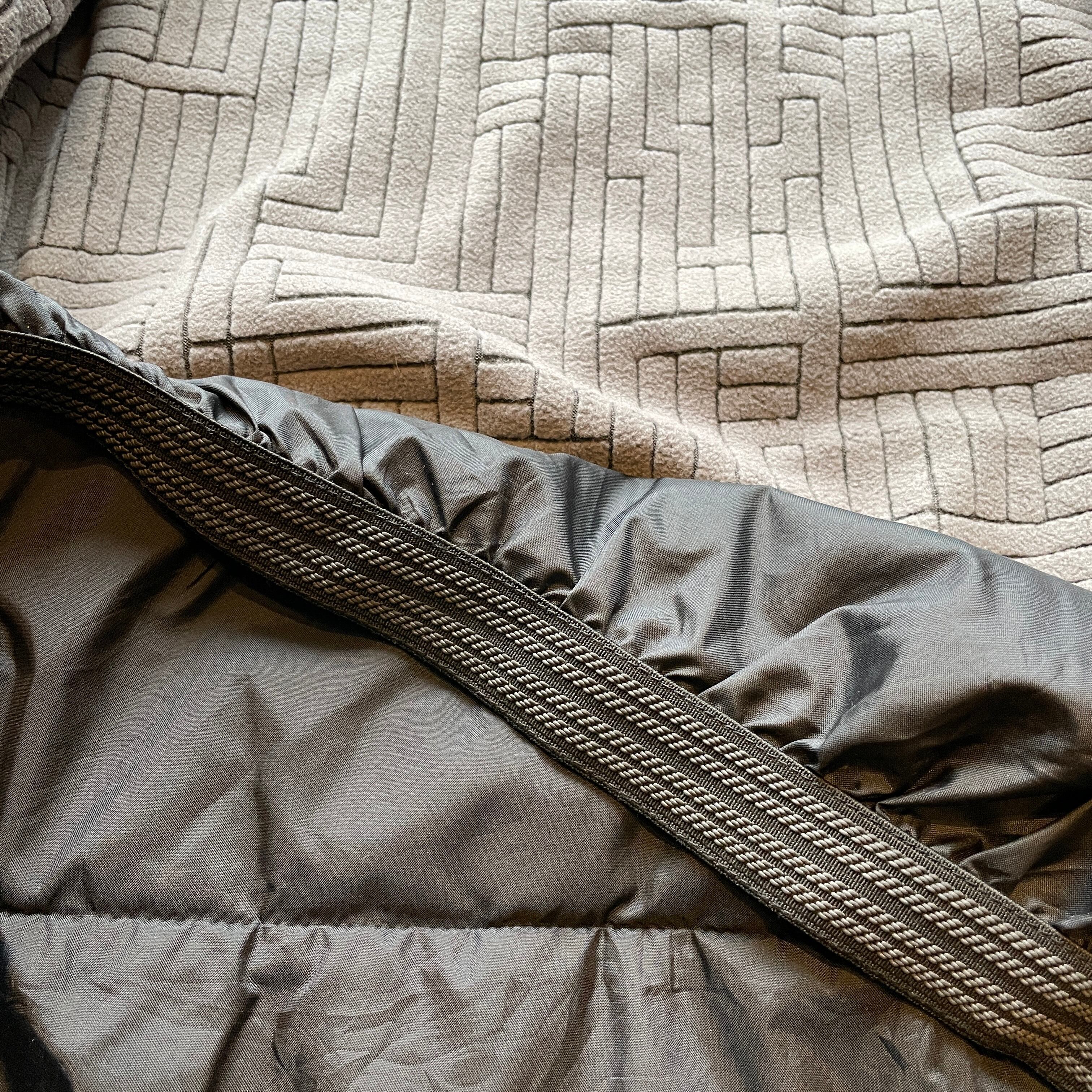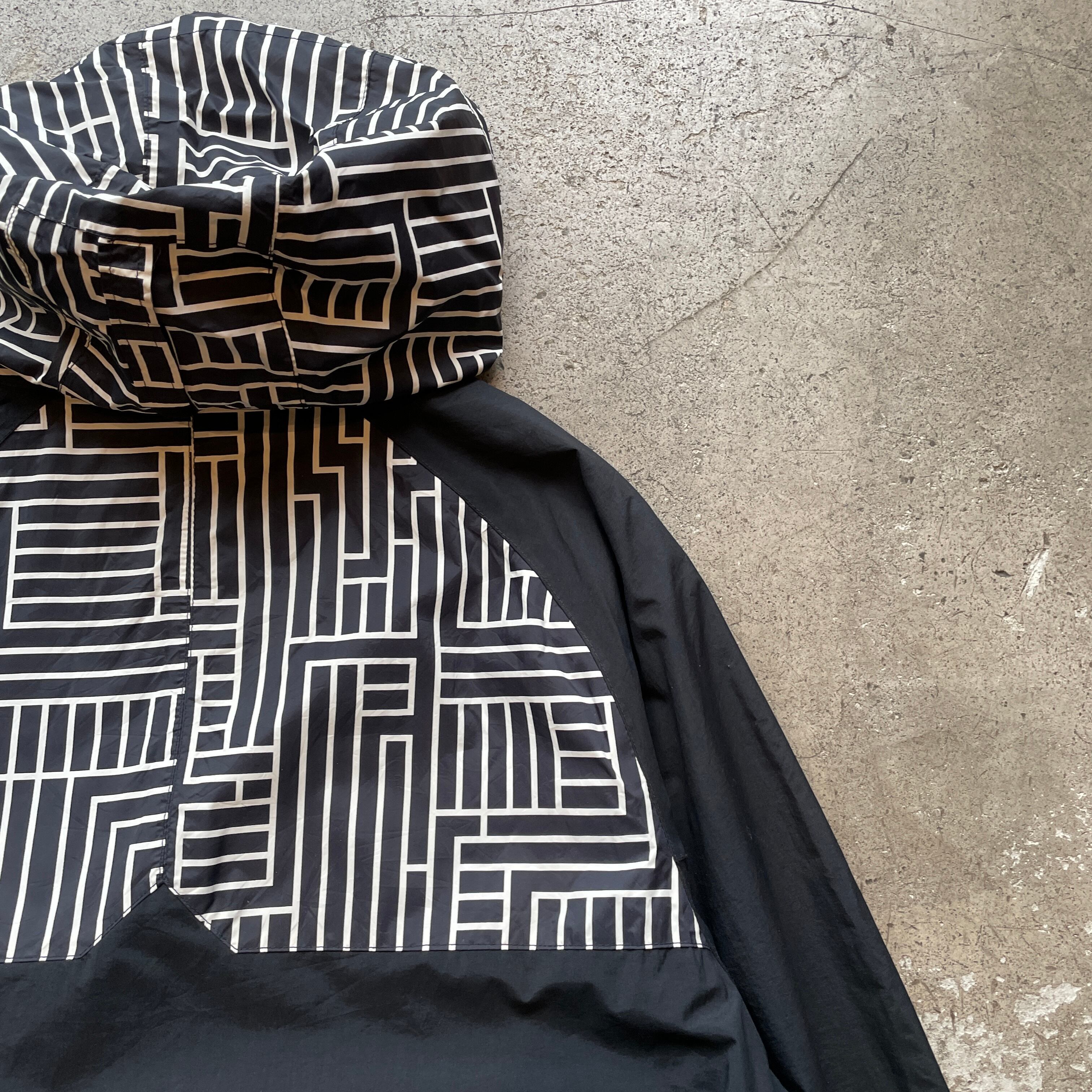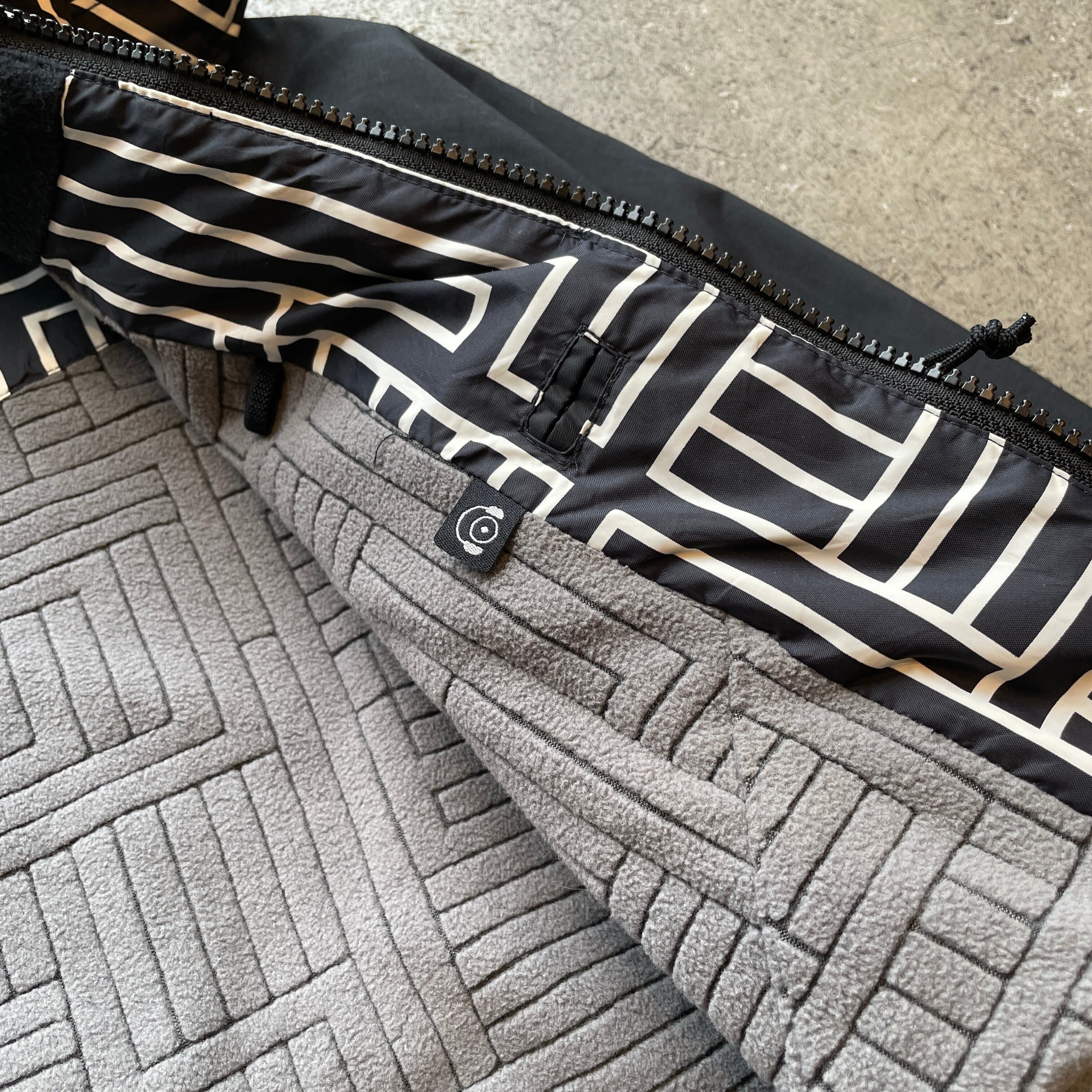幾何学模様の総柄デザインが目を引くColumbiaのマウンテンジャケット。軽量ながら保温性の高いフリースライナー付きで、街着からアウトドアまで幅広く対応。モノトーンの配色でスタイリングを引き締める一着です。