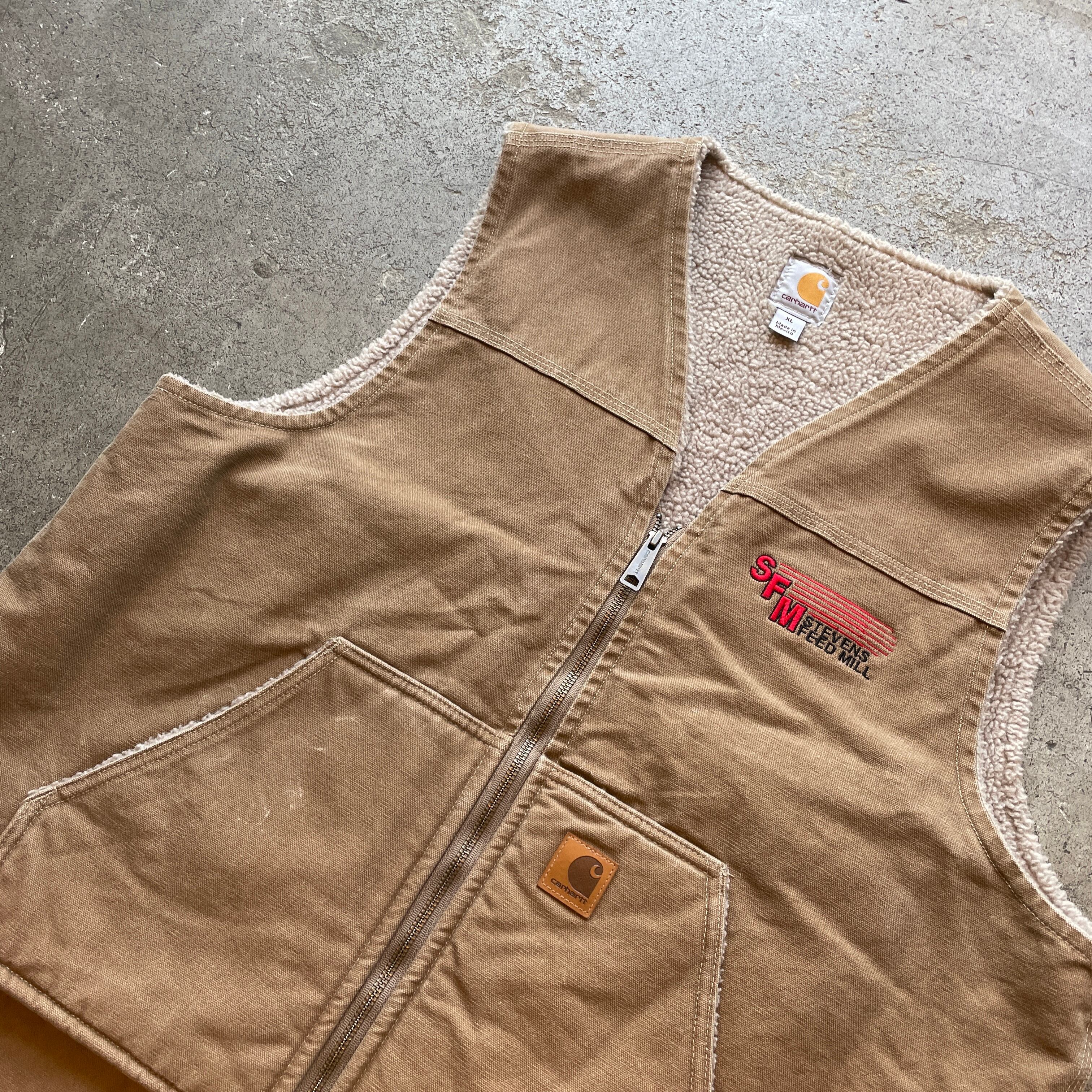 Carhartt定番のシェルパライナーダックベスト。フロントにアメリカ・ペンシルベニア州にある家畜用飲料の製造・販売会社「SFM / Stevens Feed Mill」の企業ロゴ刺繍入りで、実際に業務用ユニフォームとして使用されていた希少な一着。肉厚な生地とボアライニングで保温性に優れ、ワークスタイルからストリートまで幅広く活躍します。