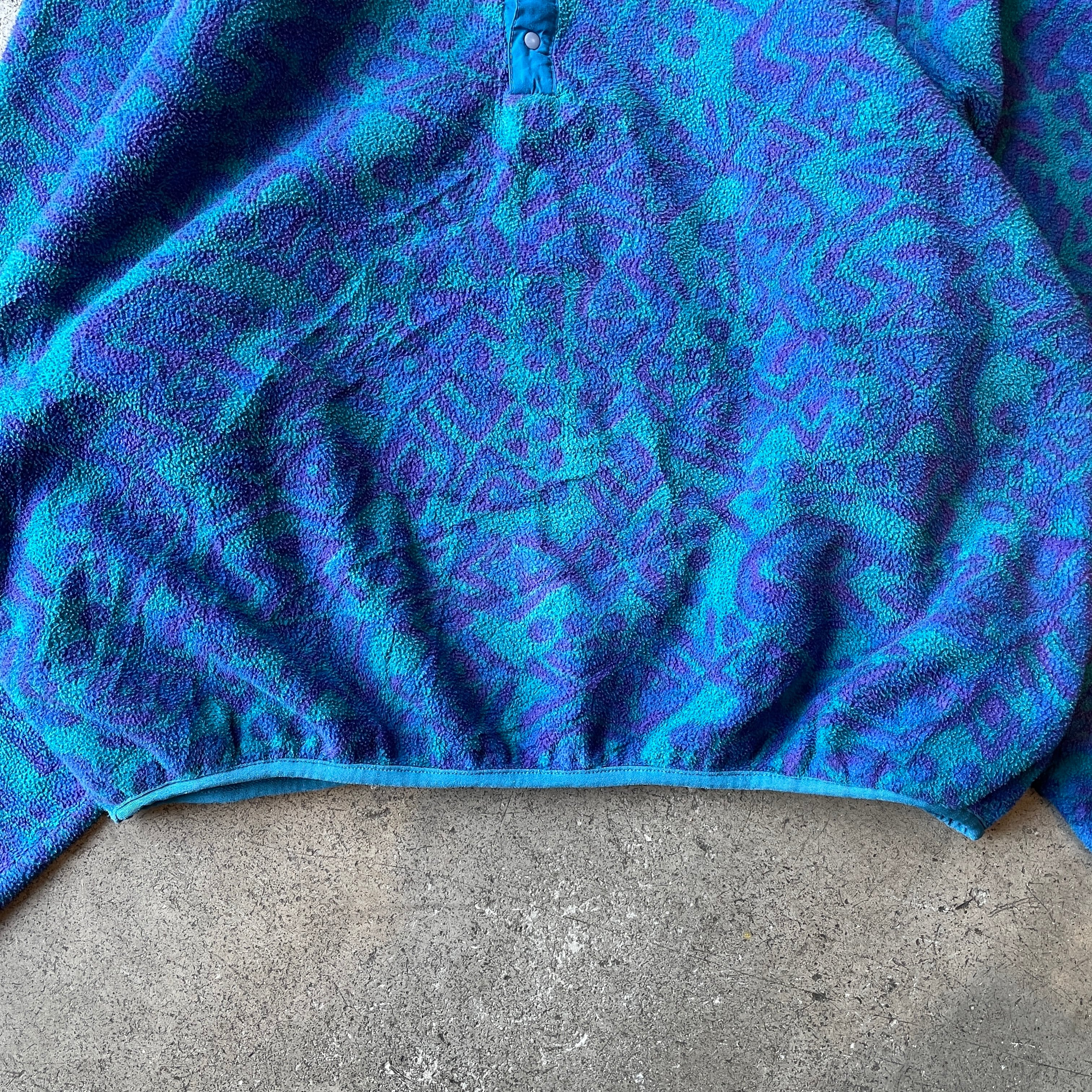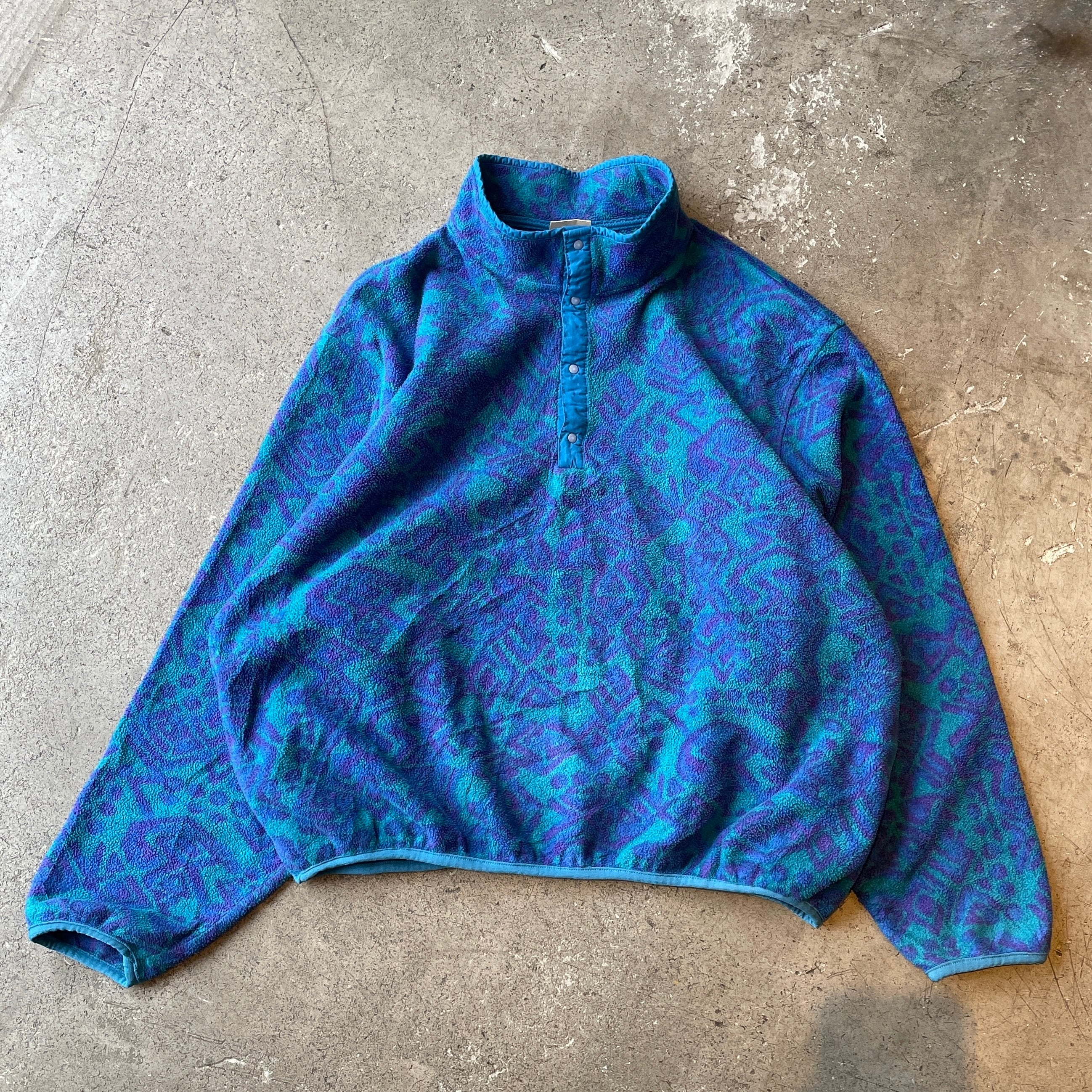 90年代L.L.Beanの総柄フリースプルオーバー。鮮やかなブルーの幾何学模様が印象的でアウトドアテイストながらファッション性の高いデザイン。スナップボタン仕様のクラシックなスタイルでレトロフリース好きにはたまらない一着です。