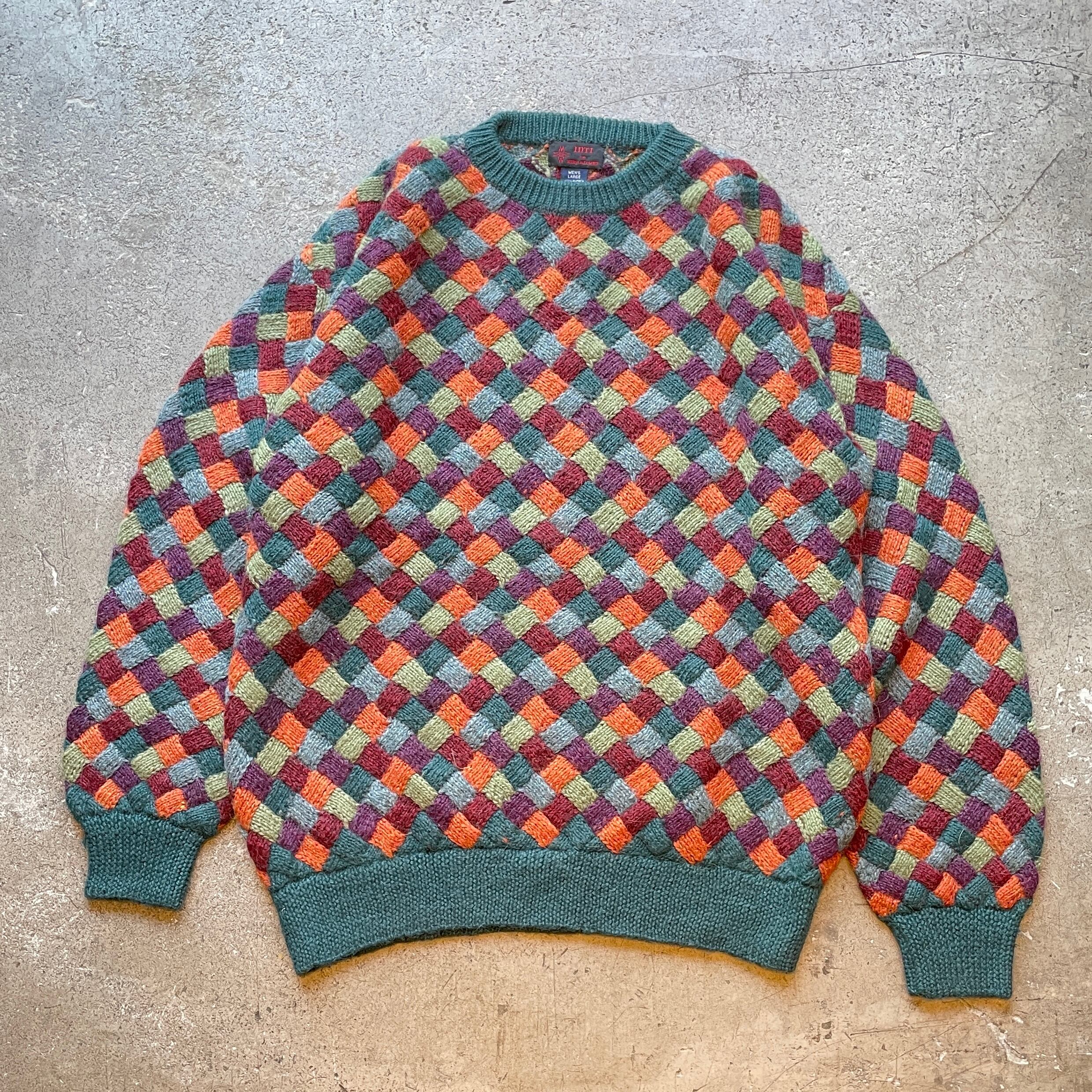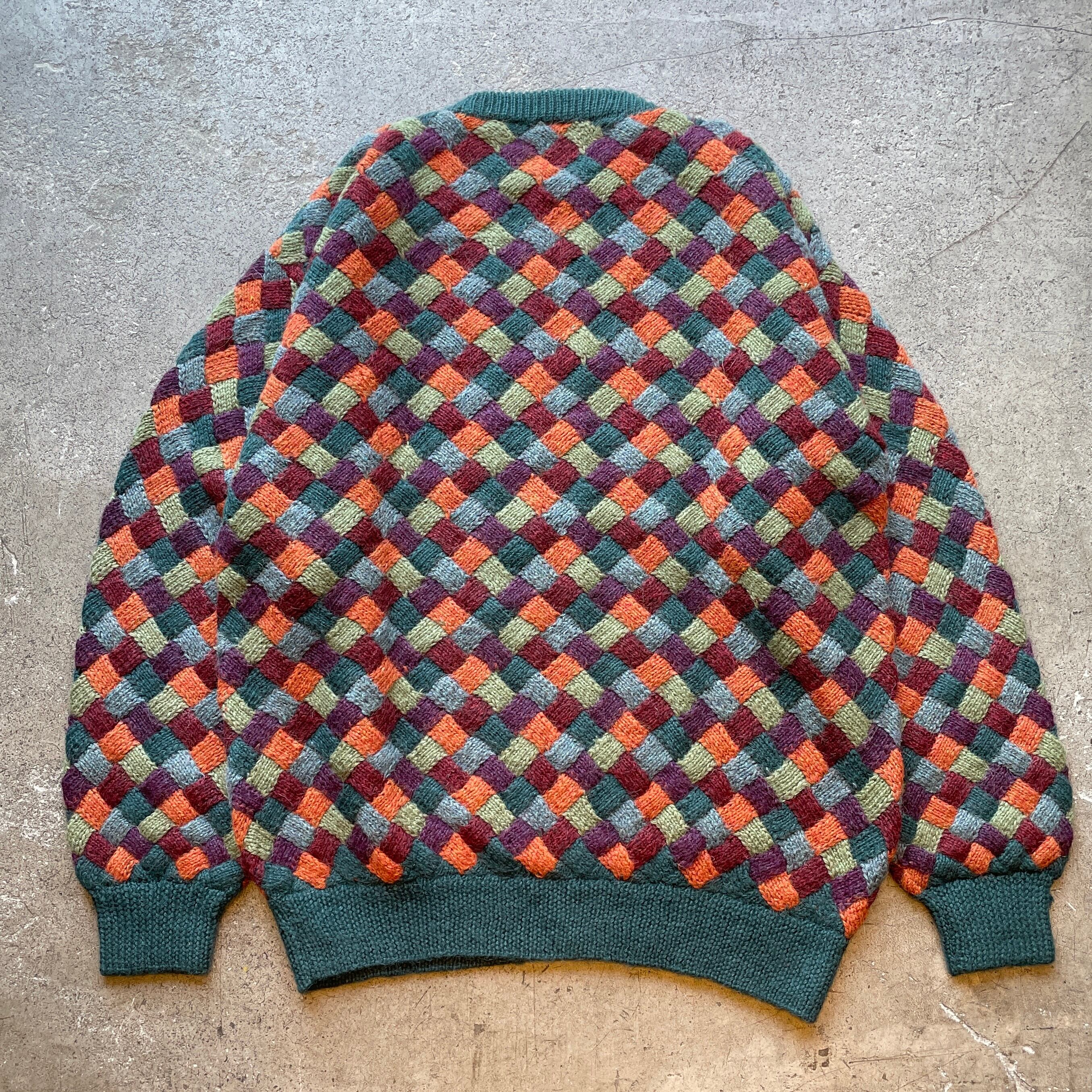 南米ボリビアで一点一点手編みされたアルパカウール100%の高品質ニット。立体的な編み模様と鮮やかなマルチカラーが存在感抜群でアートピースのような一着。同ブランドの中でもこの配色パターンは特に希少でヴィンテージ市場でも滅多に見かけない逸品です。