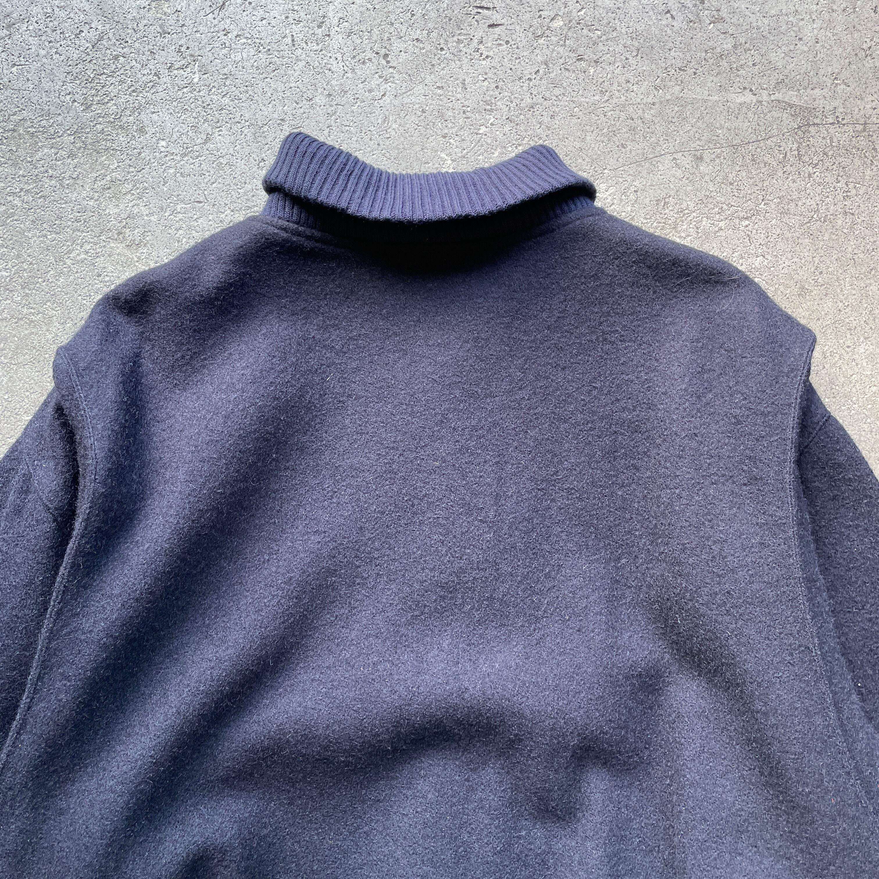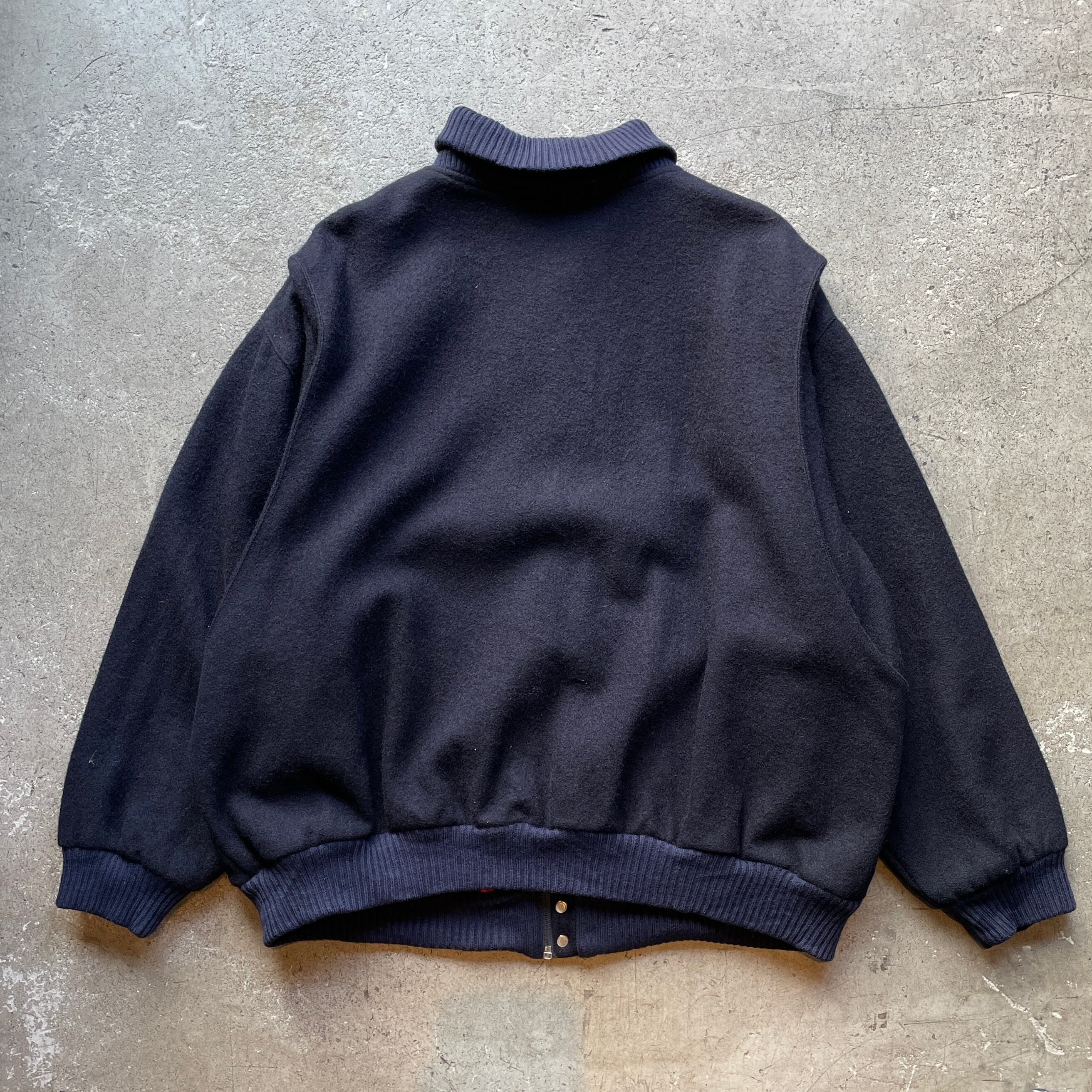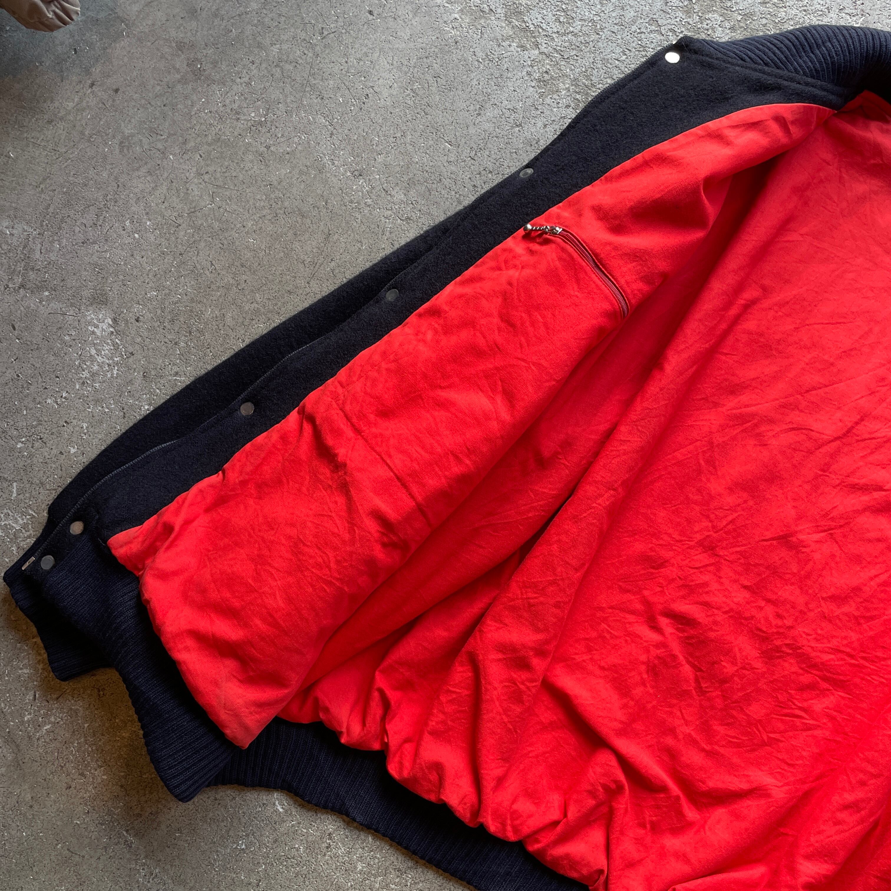 80年代フランス製LACOSTEのウールジャケット。肉厚なメルトン生地と赤い裏地のコントラストが特徴でリブ襟とスナップボタン仕様がスタジャンライクな印象の一着。ゆったりとしたシルエットで上品さとストリート感を兼ね備えています。