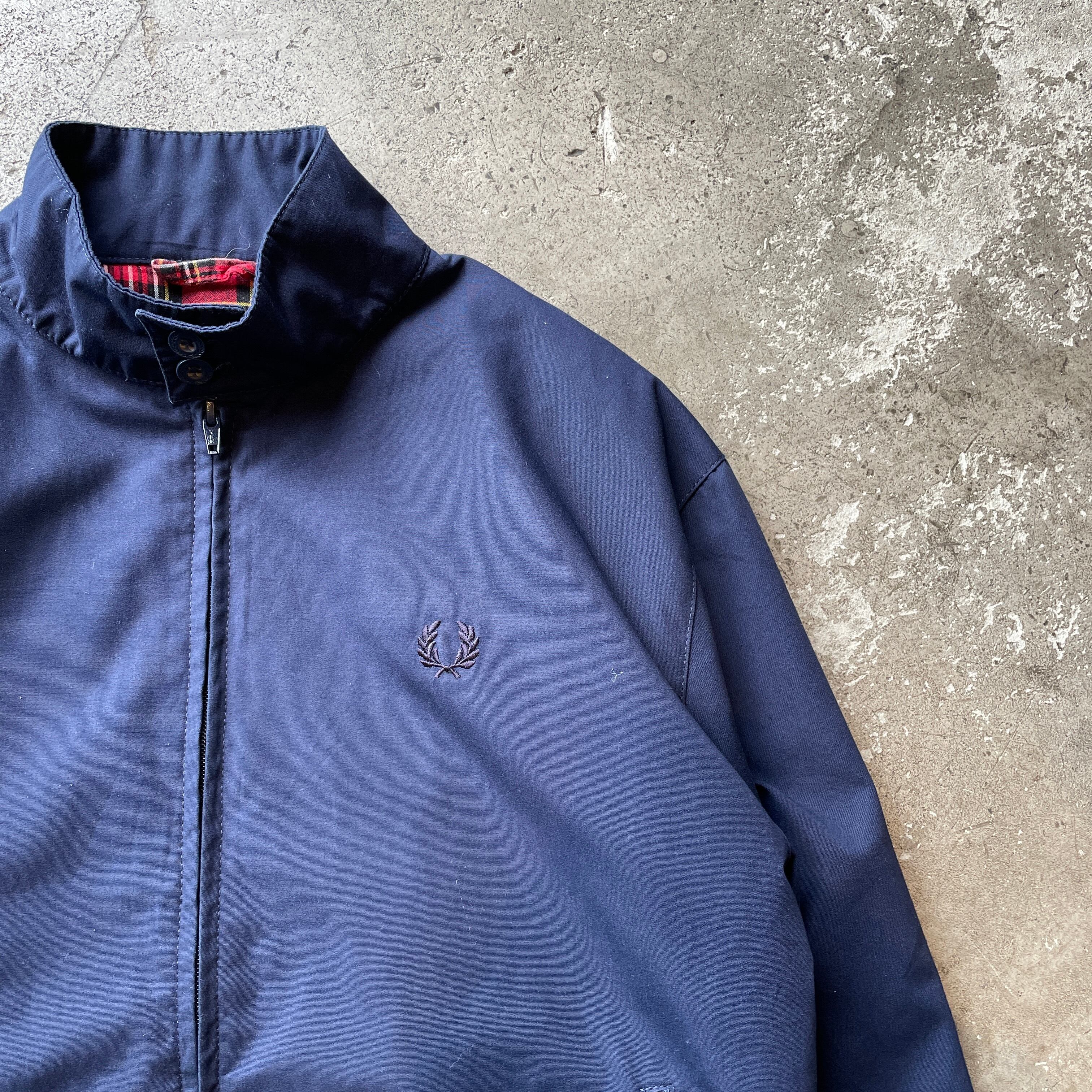 FRED PERRYの“Made in England”ラインによるハリントンジャケット。伝統的なタータンチェックの裏地を備えた定番デザインでネイビーと月桂樹ロゴ刺繍の上品な仕上がり。軽量ながらハリのある生地で季節の変わり目のアウターとして非常に優秀な一着です。
