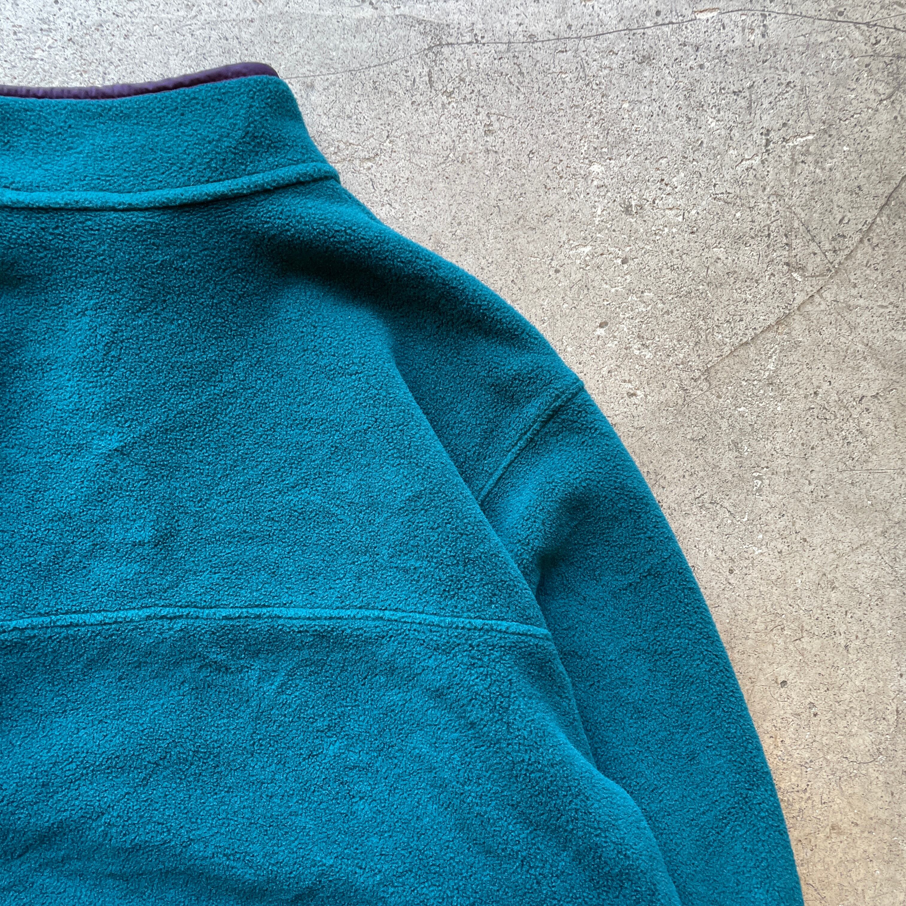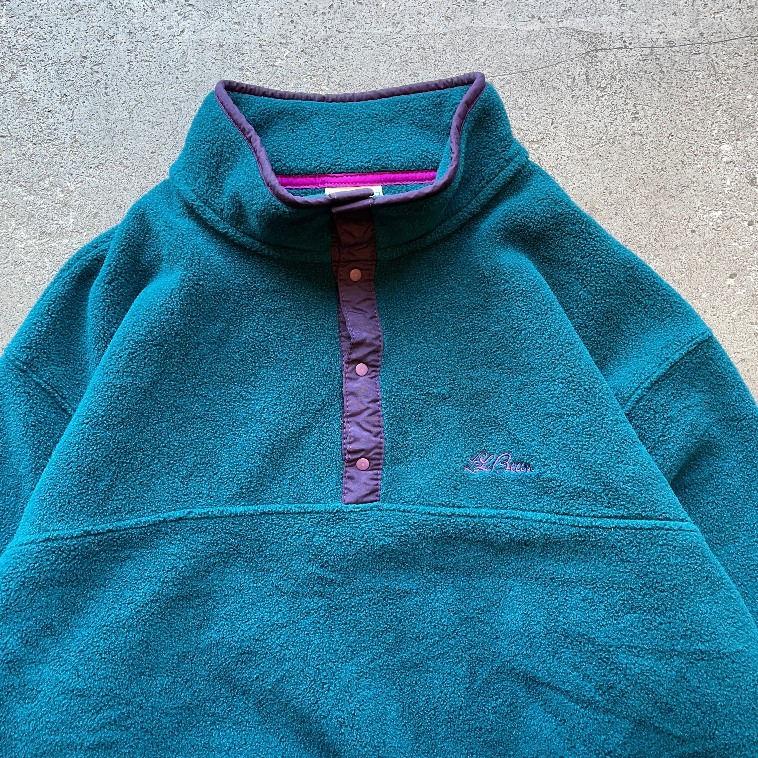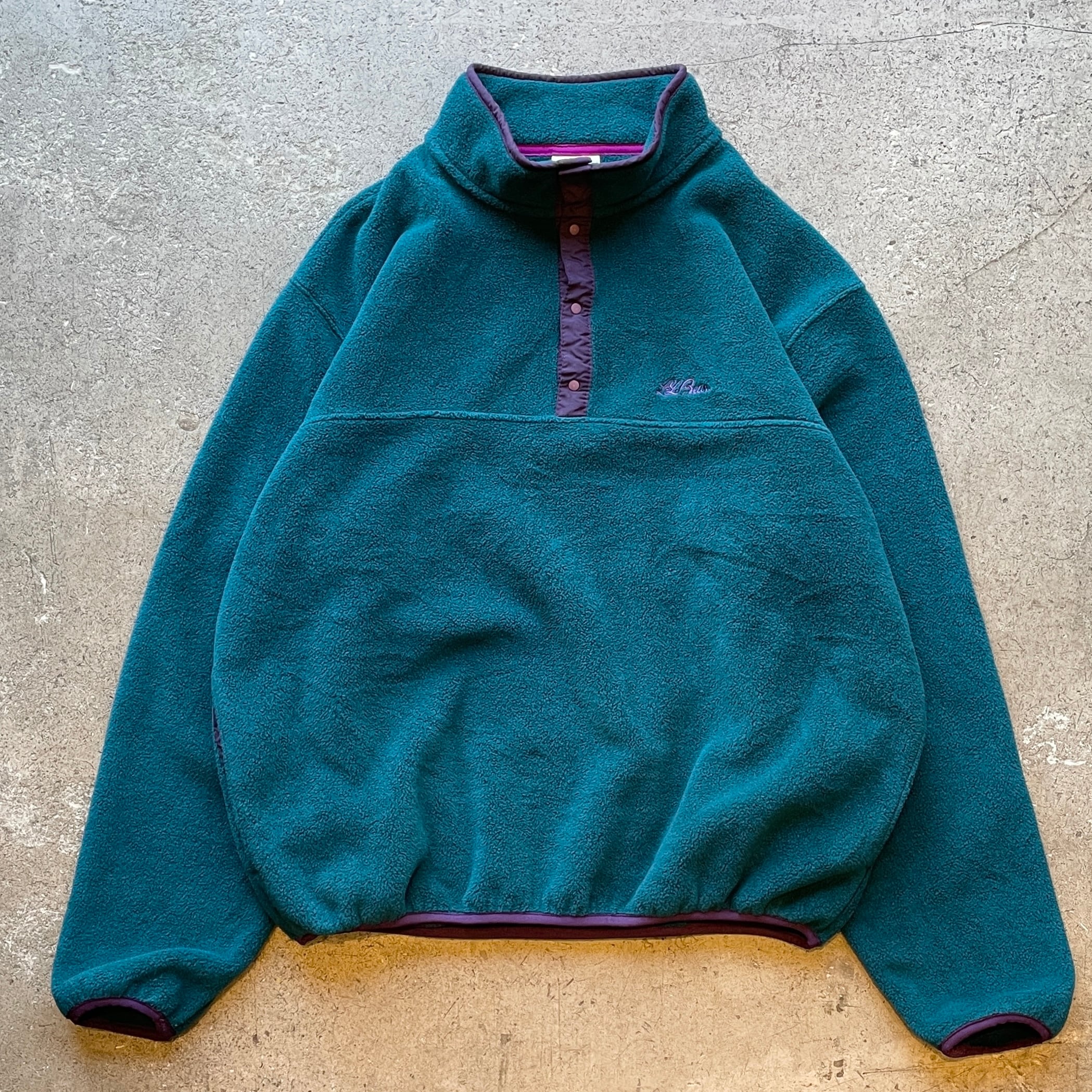 L.L.Beanの80sフリーススナッププルオーバー。ヴィンテージならではの発色の良いティールグリーンが魅力でパープルのパイピングがアクセントになる一着です。ゆったりしたシルエットで重ね着しやすく、軽くて暖かいフリース素材は秋冬の定番として活躍します。