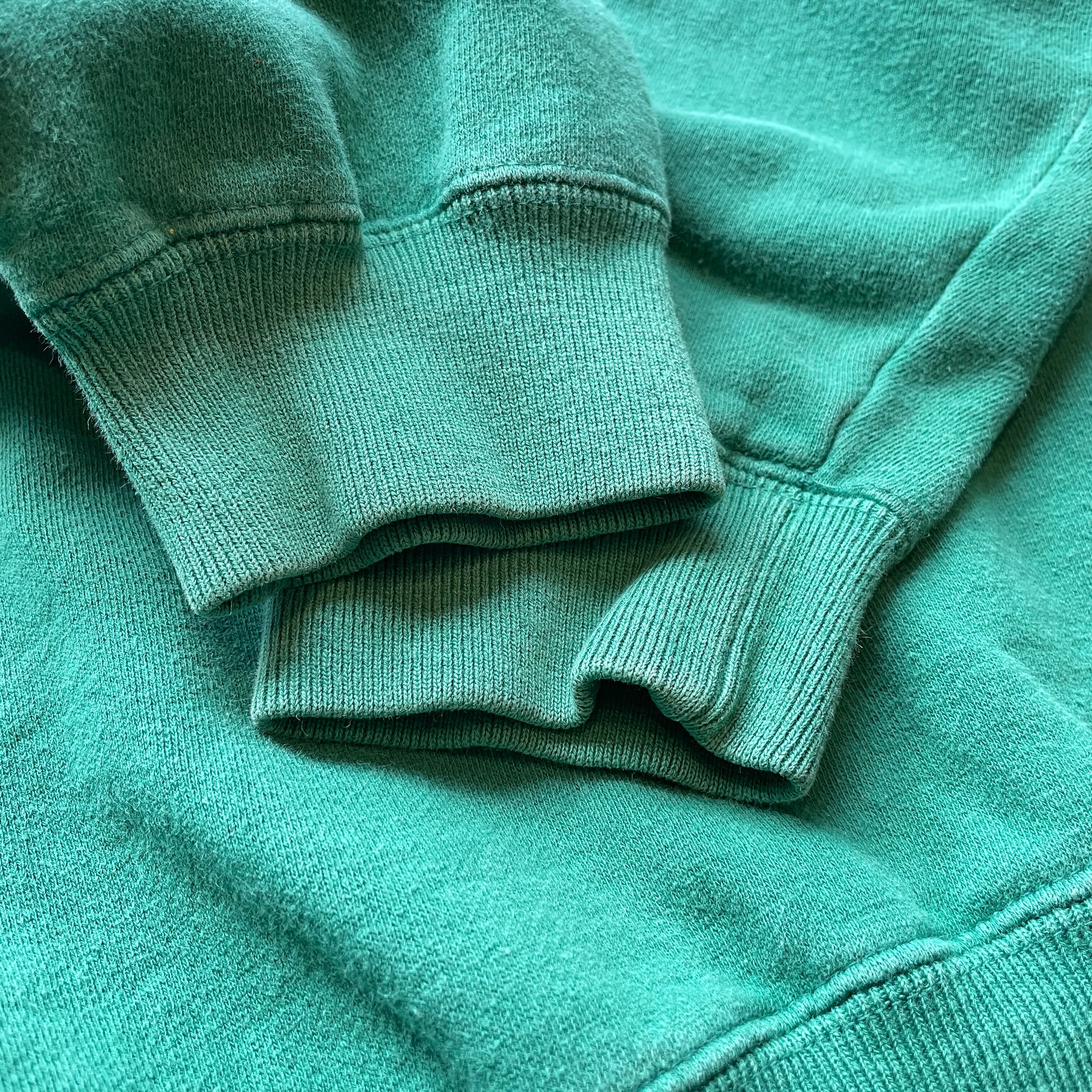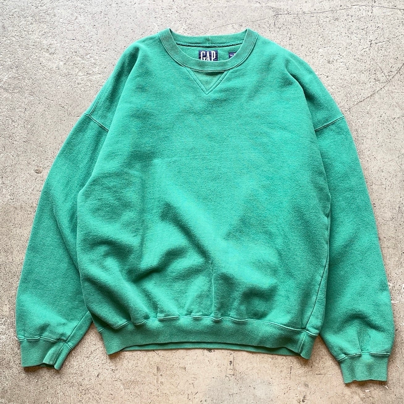 90年代GAPのクルーネックスウェット。古着市場ではプリント物が多い中、無地タイプは意外と出ない希少枠。肩がしっかり落ちるリラックスシルエットに深いグリーンの色味が映える一枚です。