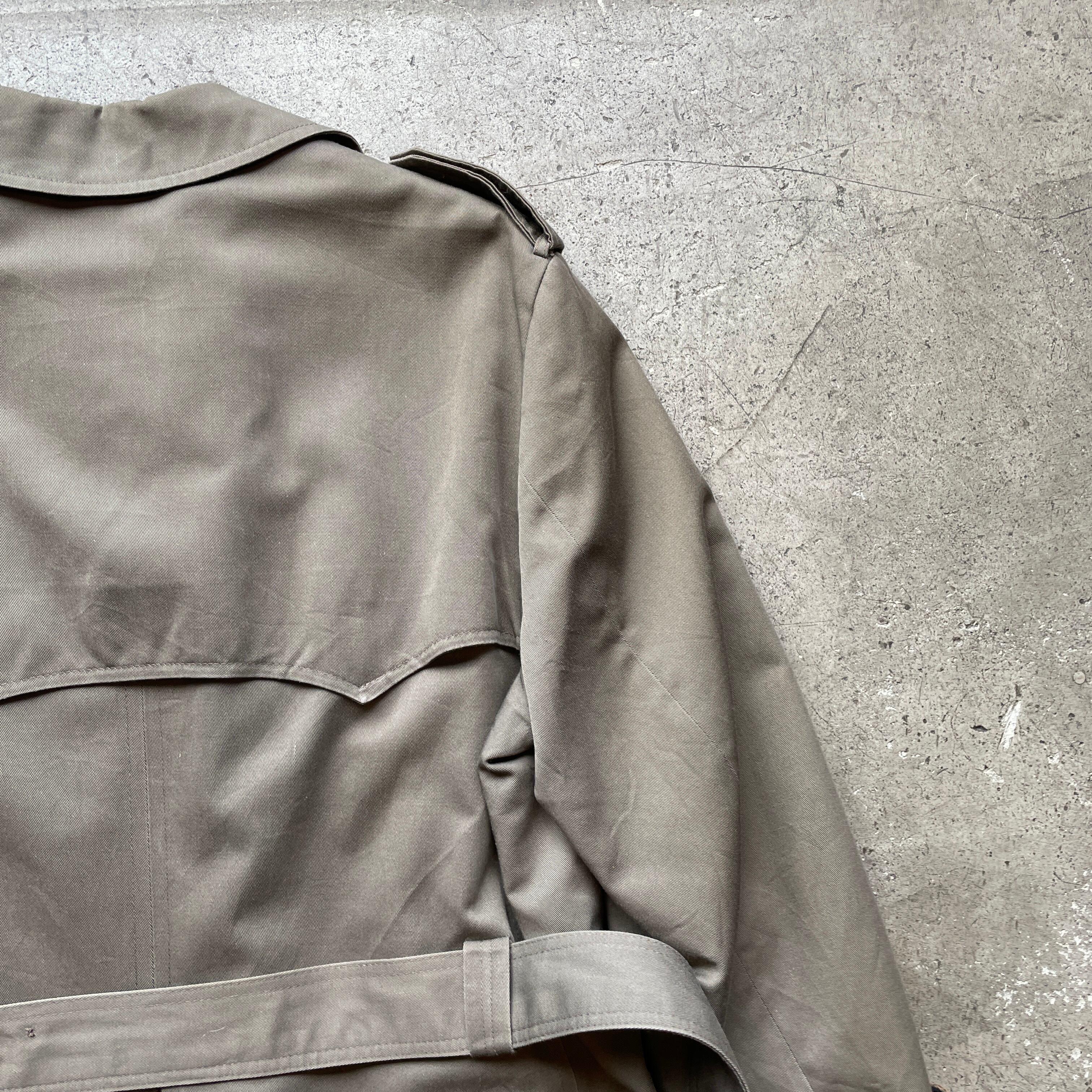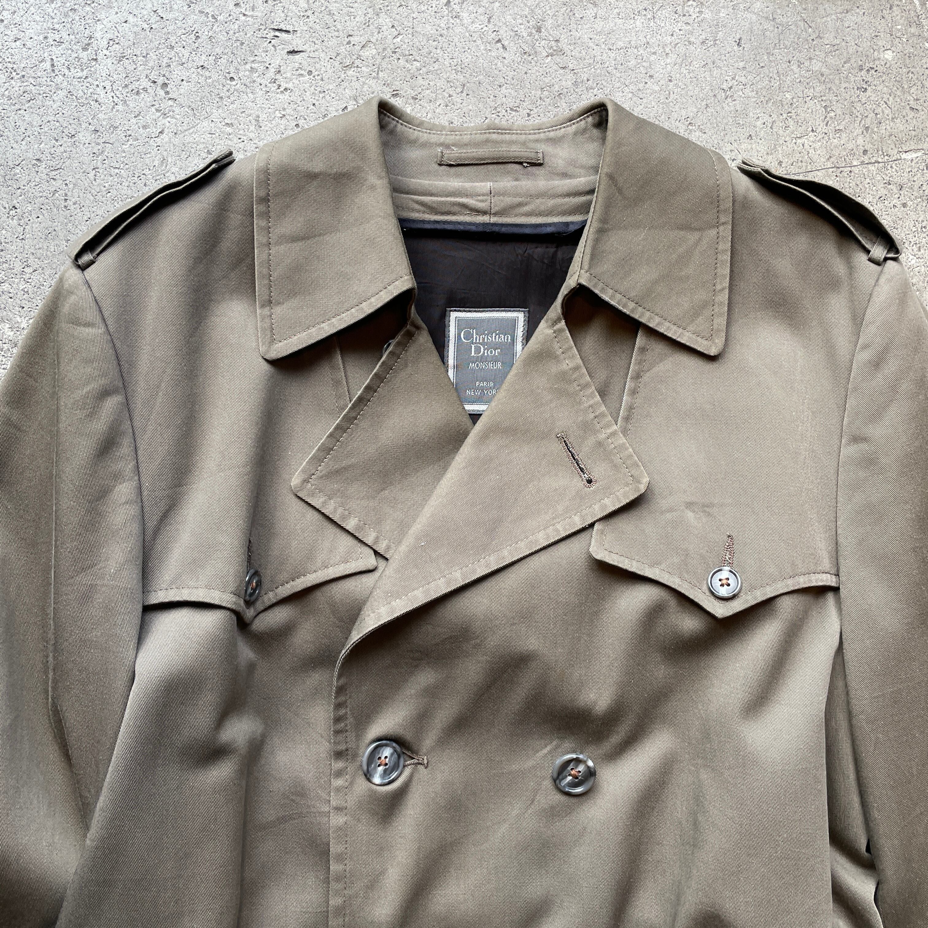 Christian Dior MONSIEURの80–90sトレンチコート。クラシックなダブルブレスト仕様にミリタリー由来のエポレット・ガンフラップを備えた完成度の高い一着です。