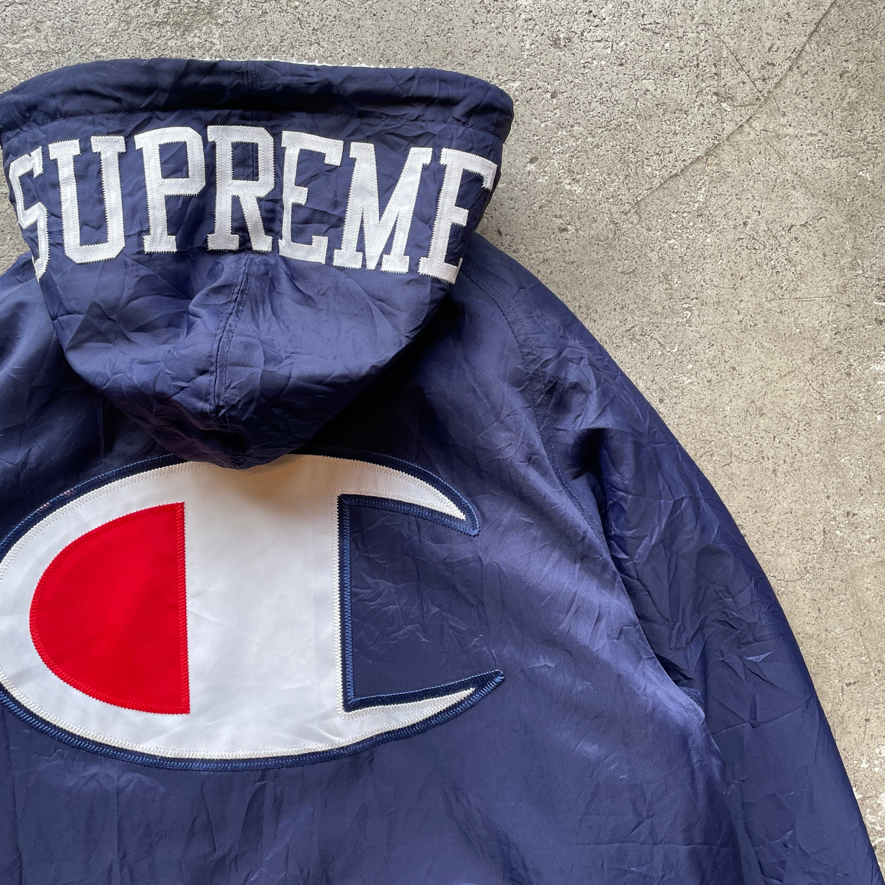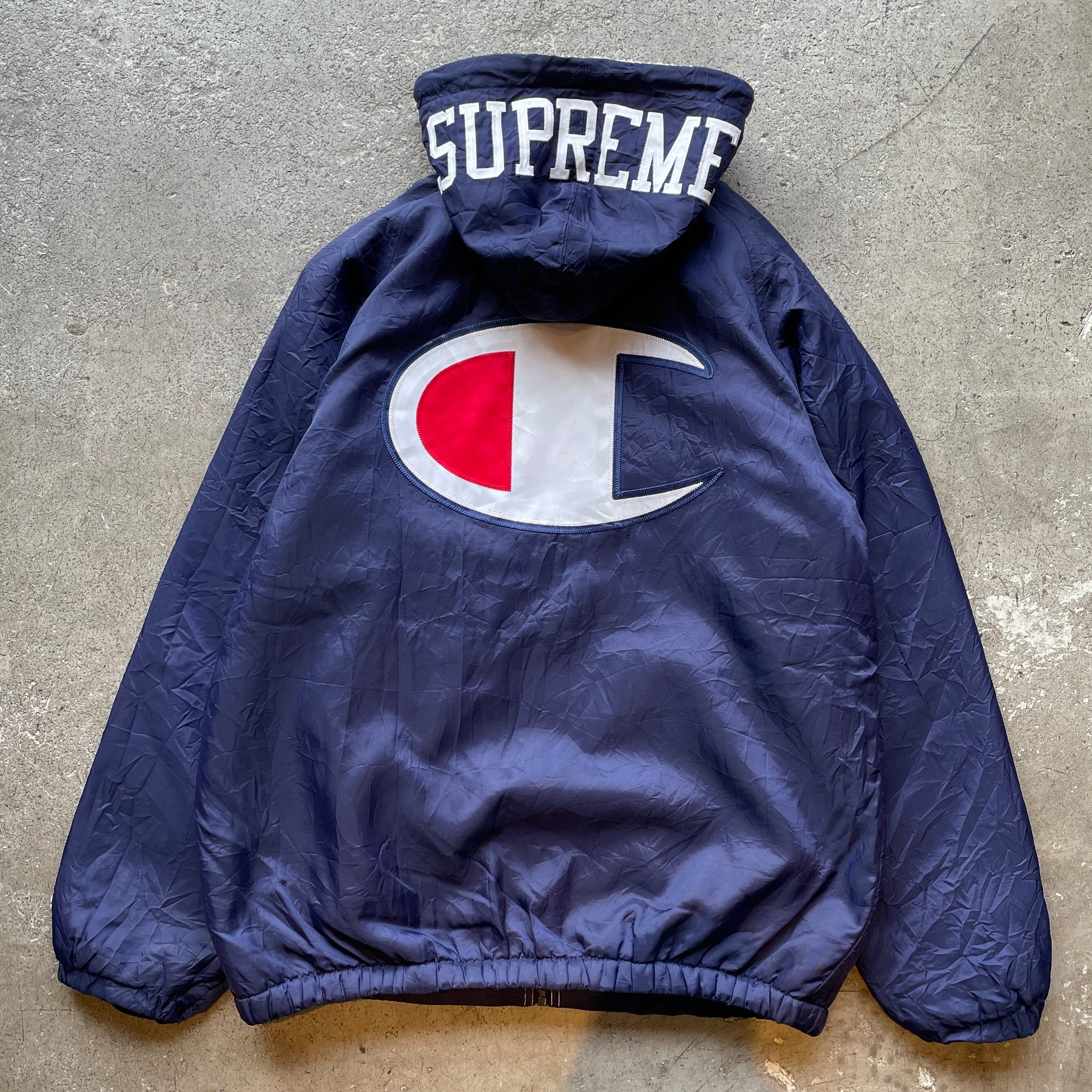 Supreme × Championのコラボレーションジャケット。フードのSUPREMEロゴ、背面の特大Champion “C”ロゴが強い存在感を放つ一着です。裏地は総ボア仕様で防寒性も高く、ストリートだけでなくタウンユースでも主役になるアイテム。
