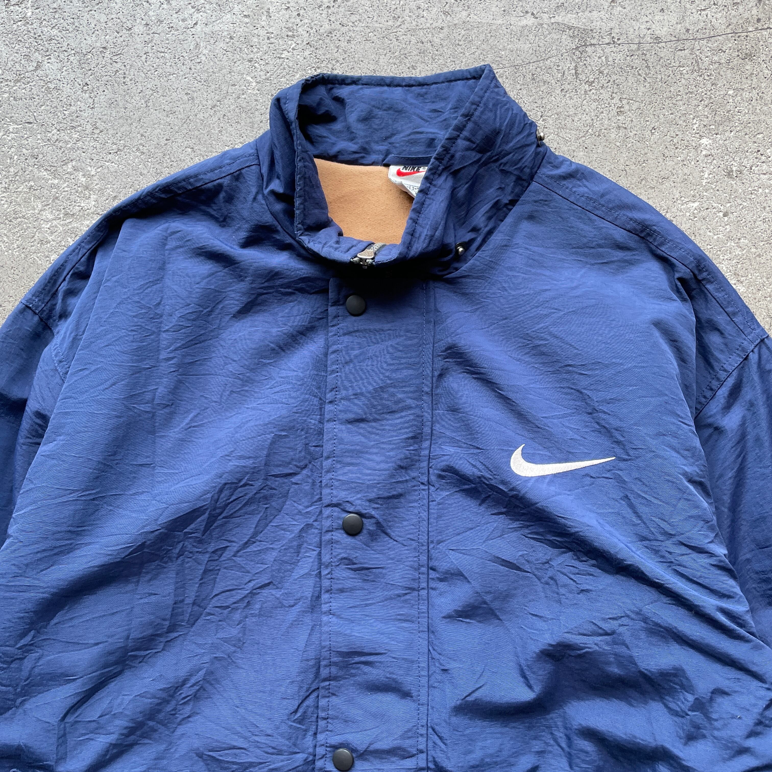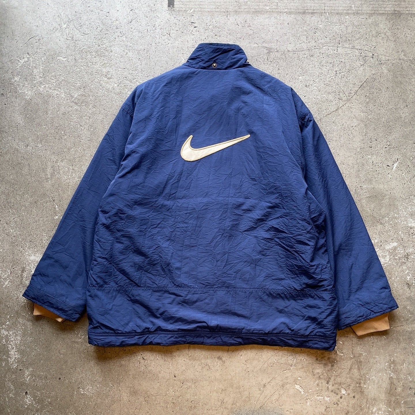 90年代NIKEの中綿ナイロンジャケット。フロントはスナップボタン仕様、背面には存在感のあるスウッシュロゴ刺繍入り。身幅広めのルーズなシルエットで当時らしいボリューム感を楽しめる一着です。