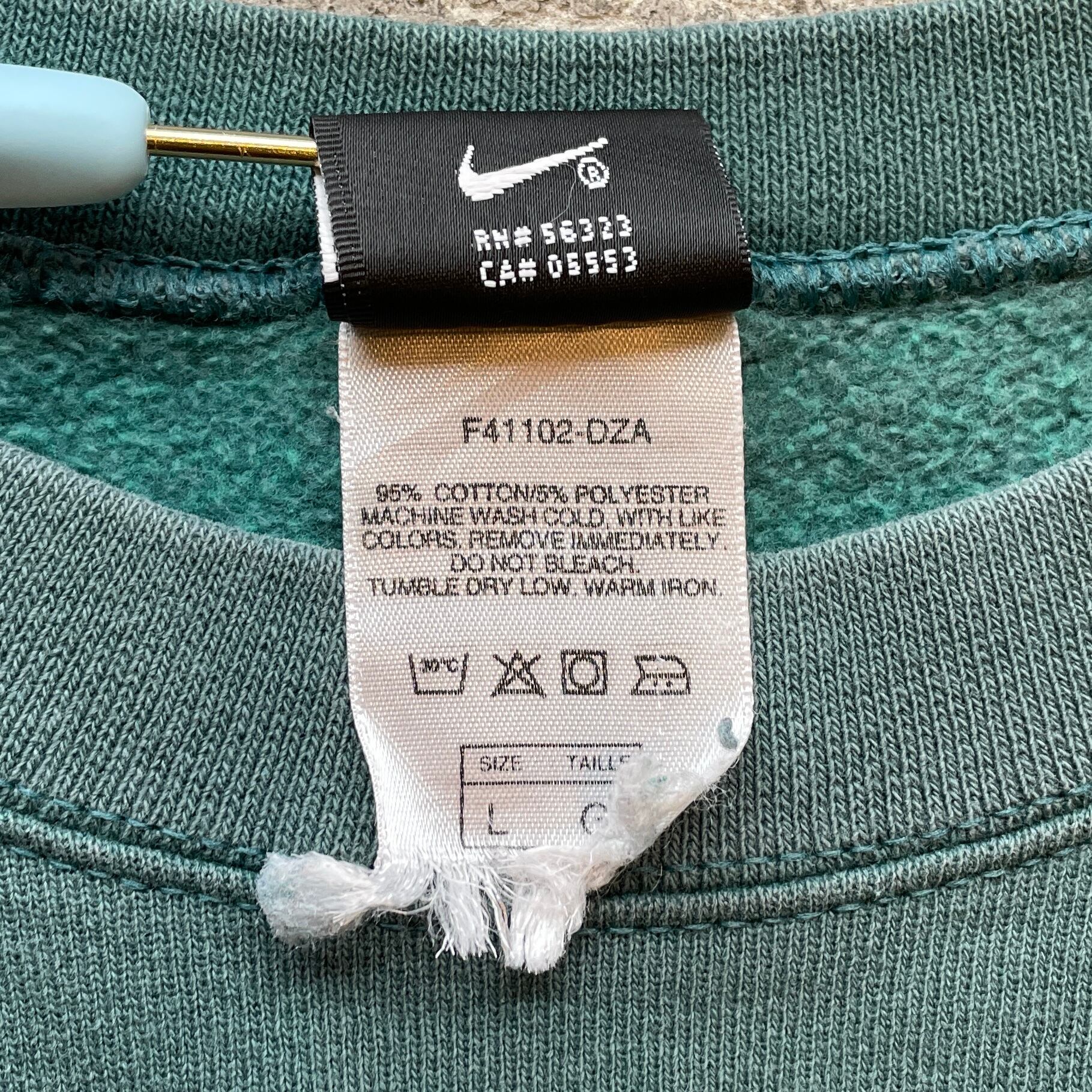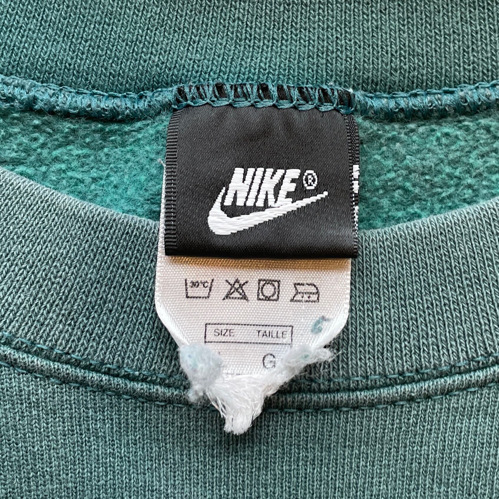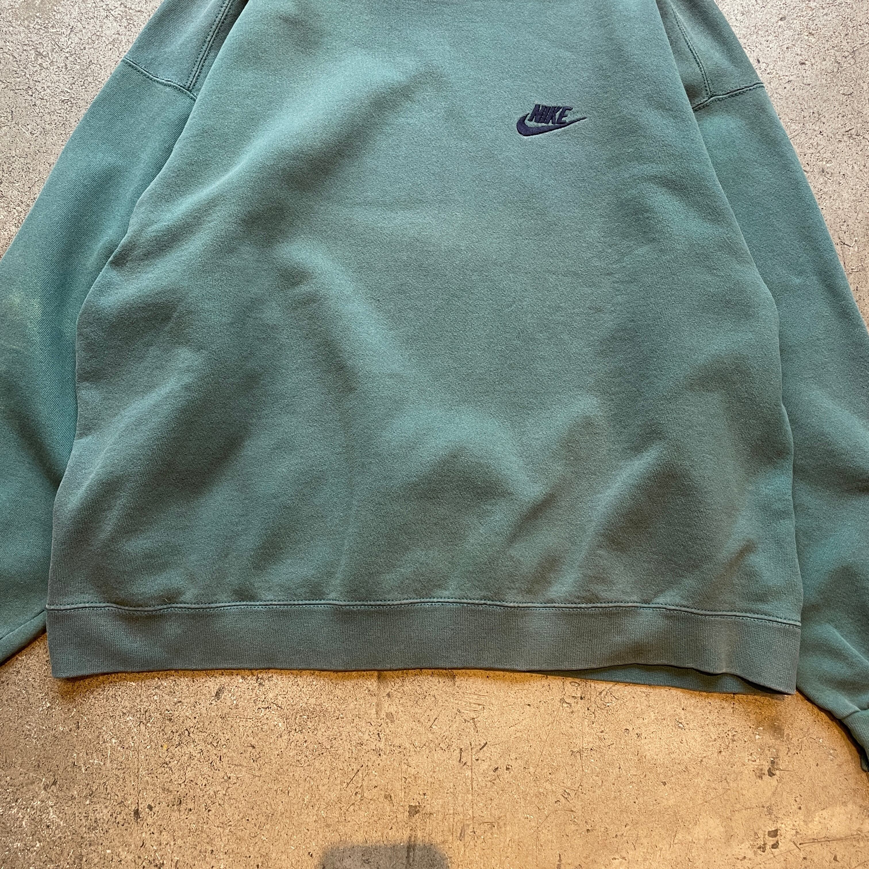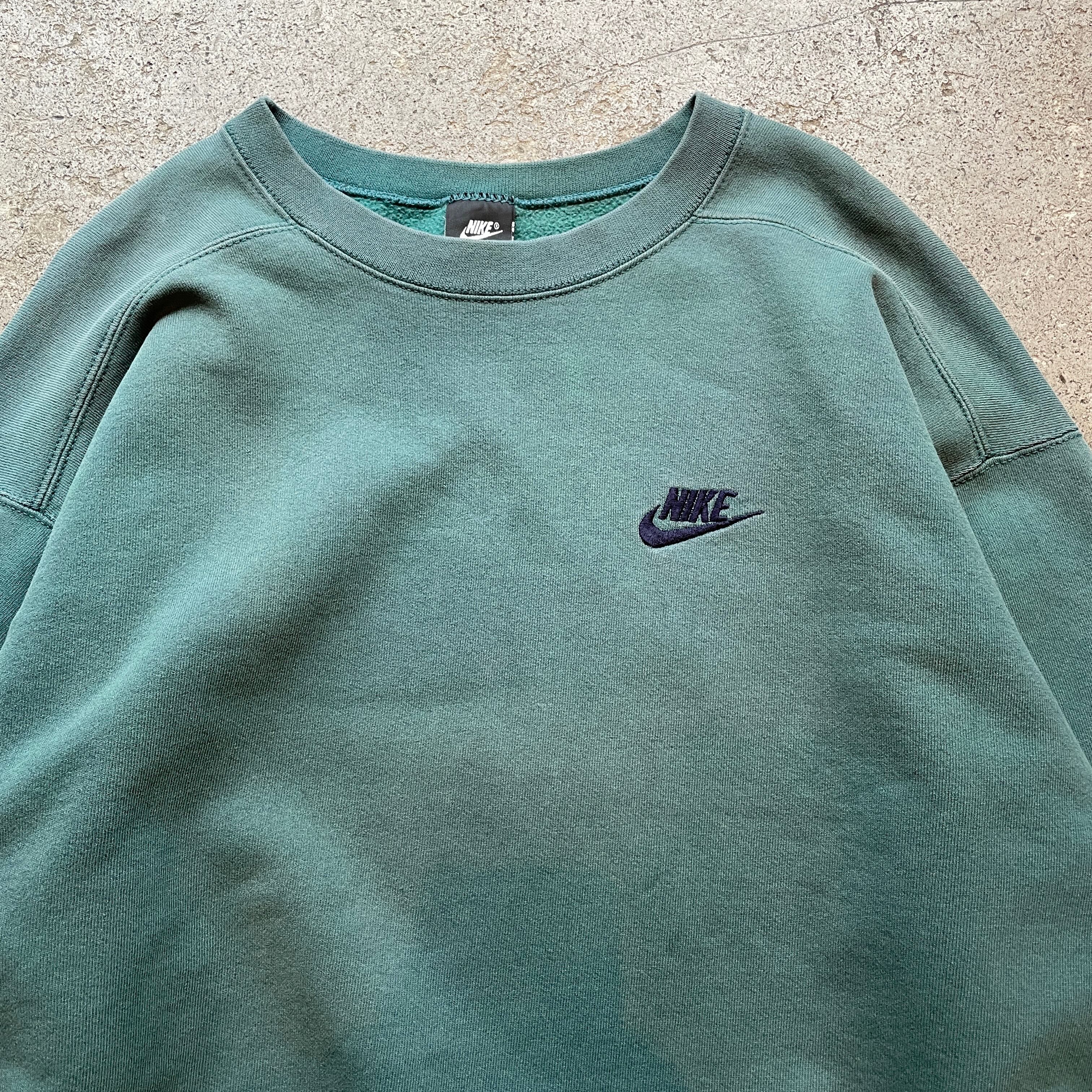 00年代NIKEのクルーネックスウェット。落ち着いたグリーンボディに同色スモールスウッシュ刺繍のミニマルなデザイン。身幅広め・肩落ちのボックスシルエットで今のスタイルにも自然に馴染む一枚。