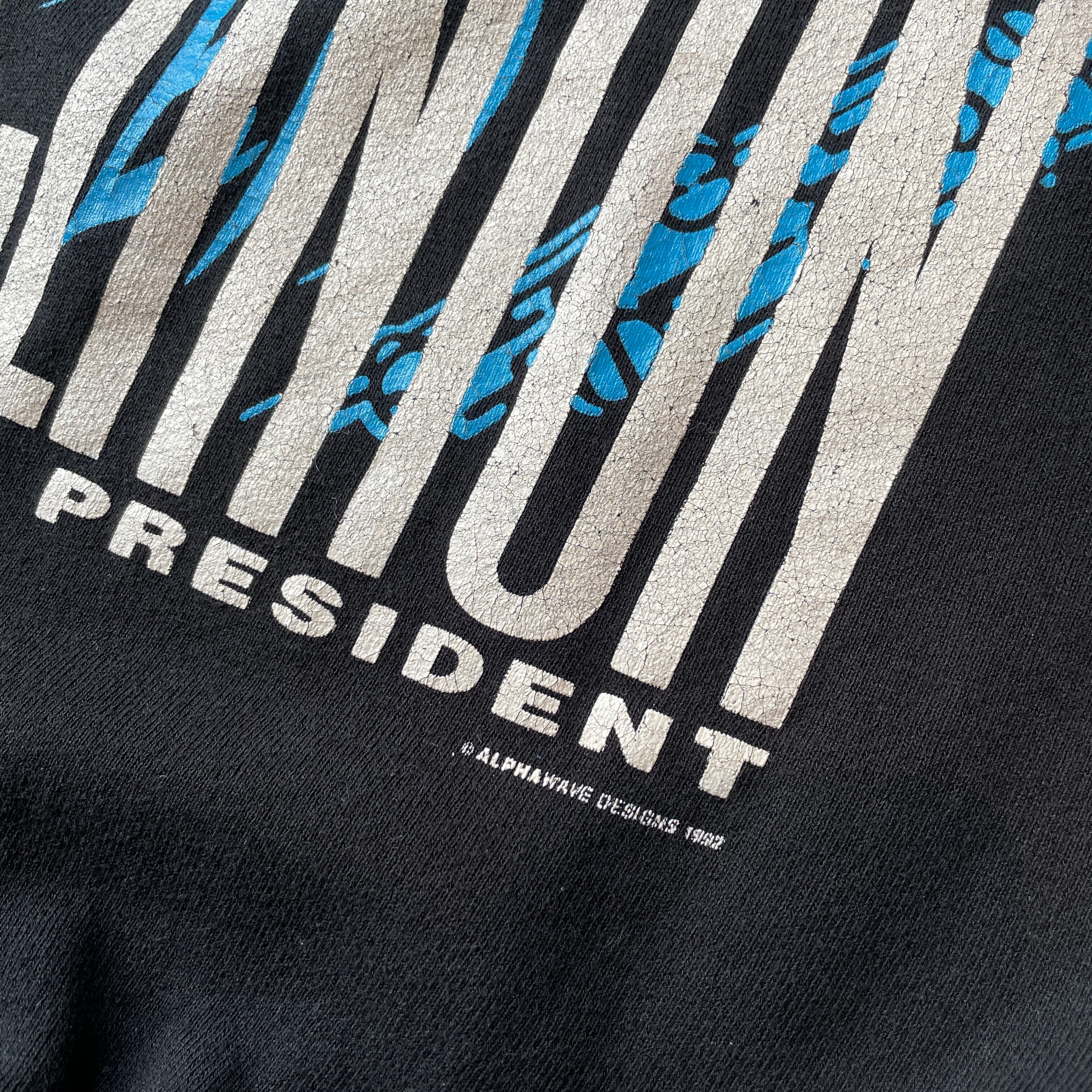 1992年のアメリカ大統領選をモチーフにしたビル・クリントンのキャンペーンスウェット。サックスを吹く姿と「THE CURE FOR THE BLUES」のコピーが象徴的な一枚。JERZEESボディのUSA製、90年代らしいメッセージ性とグラフィックが魅力です。